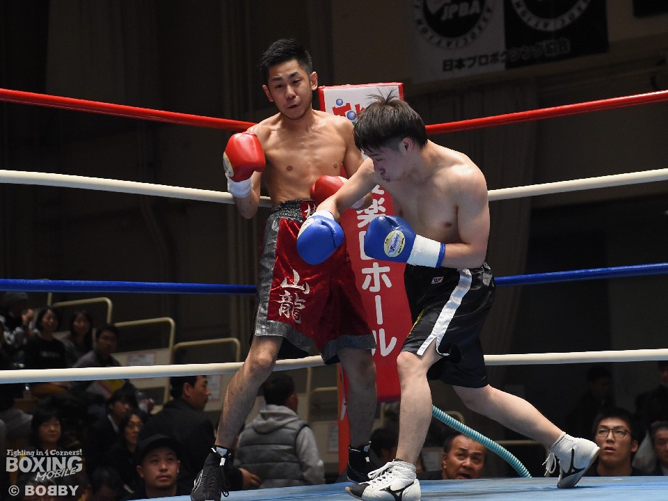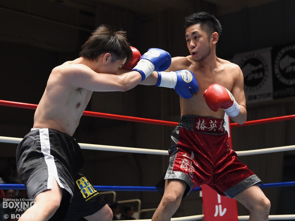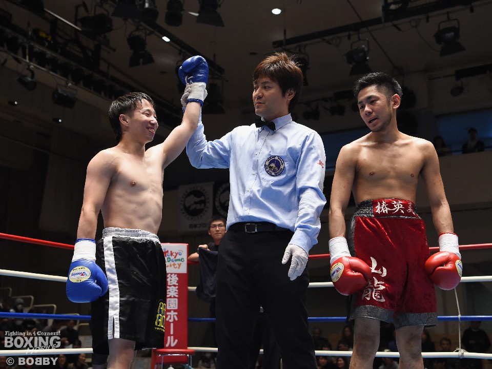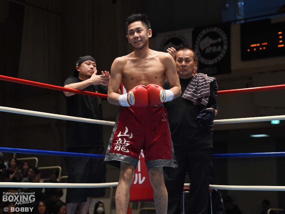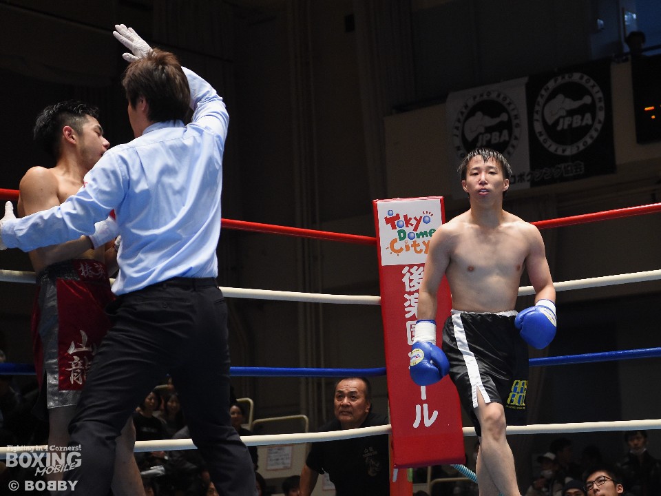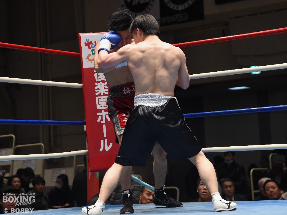 試合:これが4年5ヶ月ぶりのリングとなる山岡が鋭く踏み込んで左右のフックをヒット。打ち合いに巻き込まれたサウスポー椿もワンツーを返すが、パワーで勝る山岡がロープに詰めて連打でダウンを先制。立ち上がってきた椿だが、再び連打を浴び万事休すとなった。