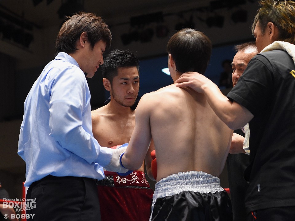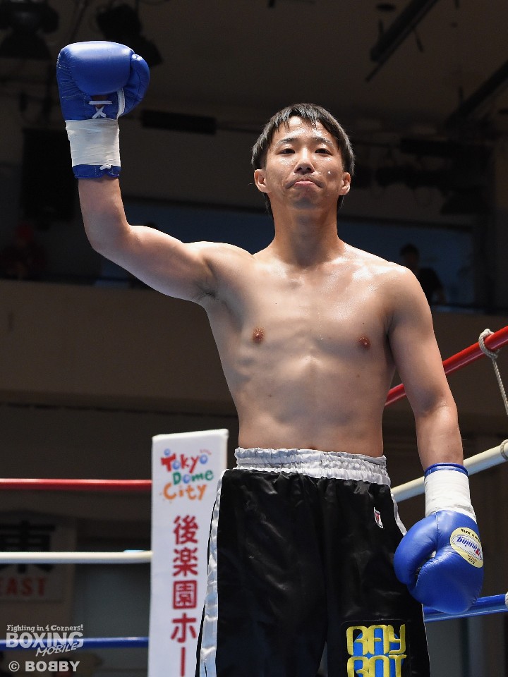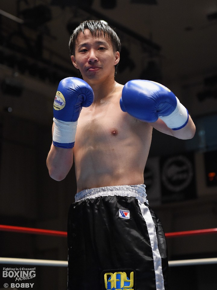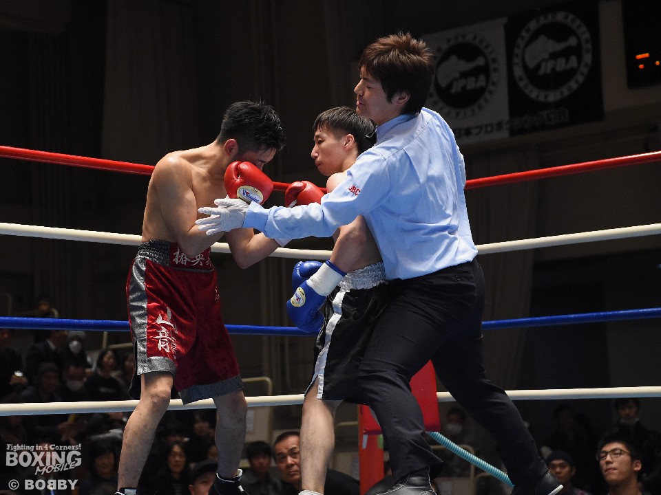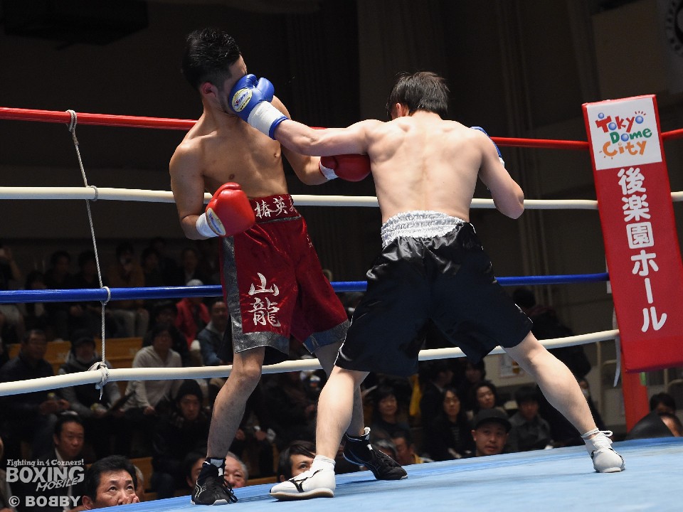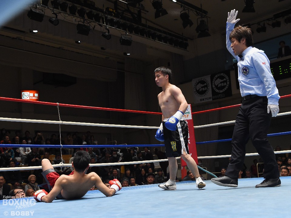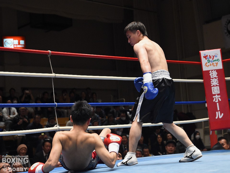 試合:これが4年5ヶ月ぶりのリングとなる山岡が鋭く踏み込んで左右のフックをヒット。打ち合いに巻き込まれたサウスポー椿もワンツーを返すが、パワーで勝る山岡がロープに詰めて連打でダウンを先制。立ち上がってきた椿だが、再び連打を浴び万事休すとなった。
