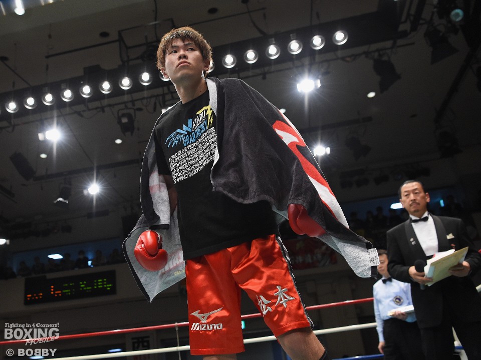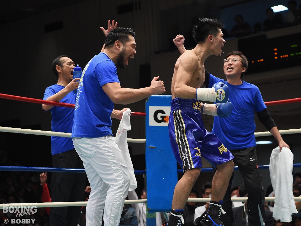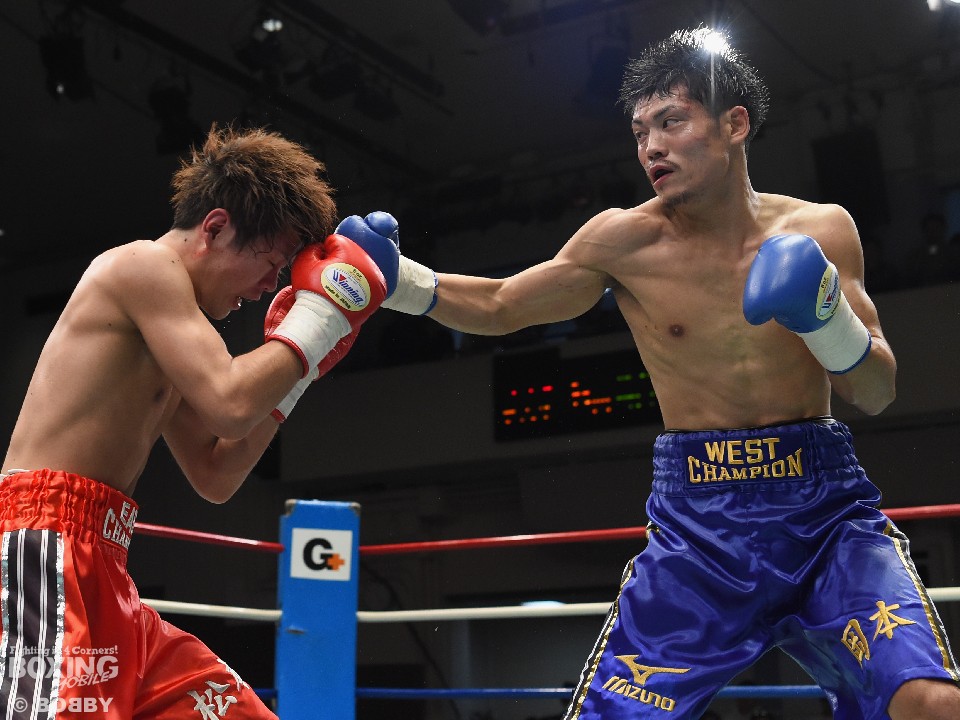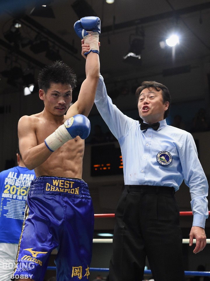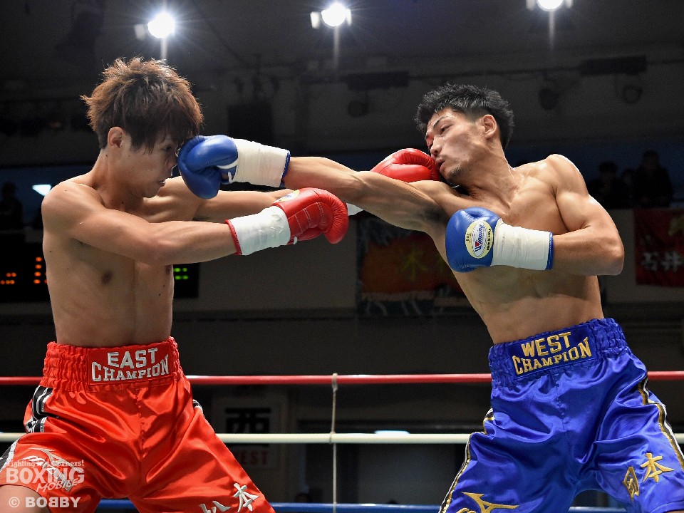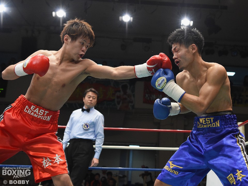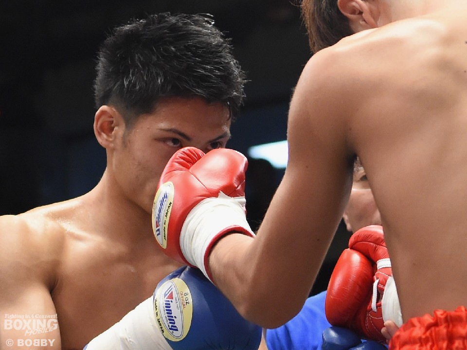 試合:サウスポーの岡本がジャブを突きながらいきなりの左で飛び込むが、松本は集中して対応。打ち終わりに右を狙ったが、序盤は見過ぎてしまった。2回に入りペースが上がった岡本に松本は左で捌きつつ右を繰り出すが、半身に構える岡本との距離は遠くヒットは浅い。すると4回、松本の右に岡本の左クロスがカウンター気味に入り、松本は仰け反るとともに腰を落としてしまった。明確なポイントを取った岡本は最終5回、ジャブ、ワンツー、アッパーとアグレッシブに攻め勝負を決めにかかると松本は攻め手を欠き、このままゴング。ジャッジ2者の支持を受けた岡本が6戦全勝で全日本新人王に輝いた。
