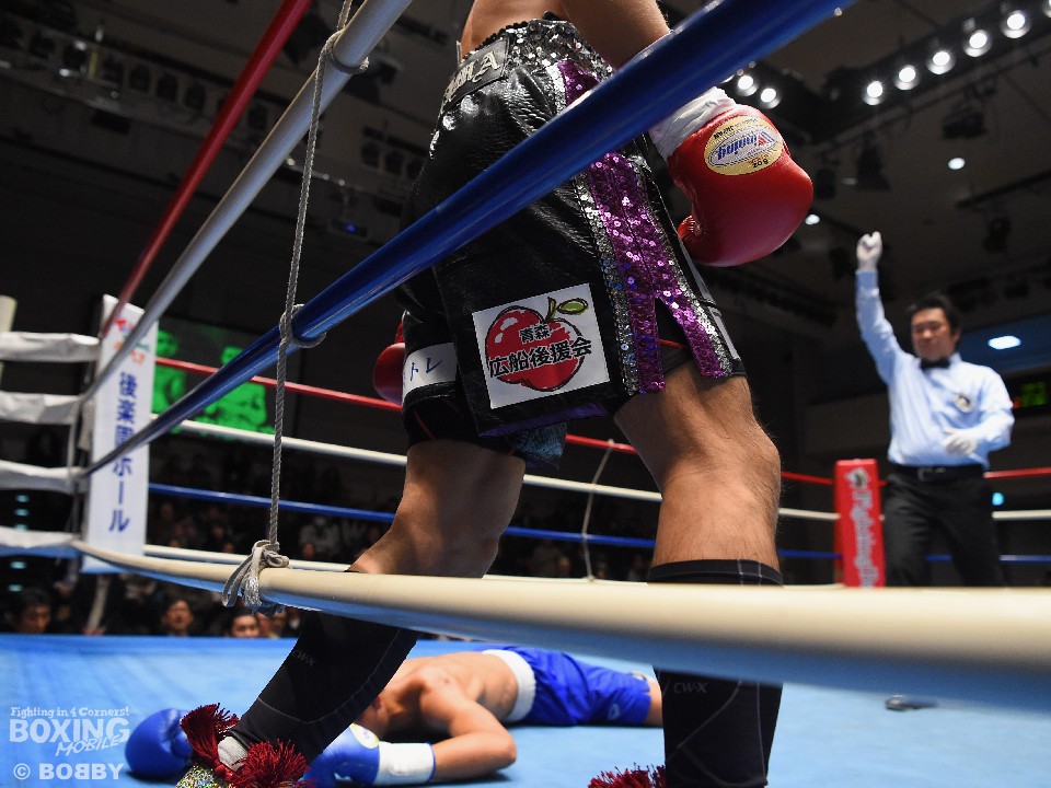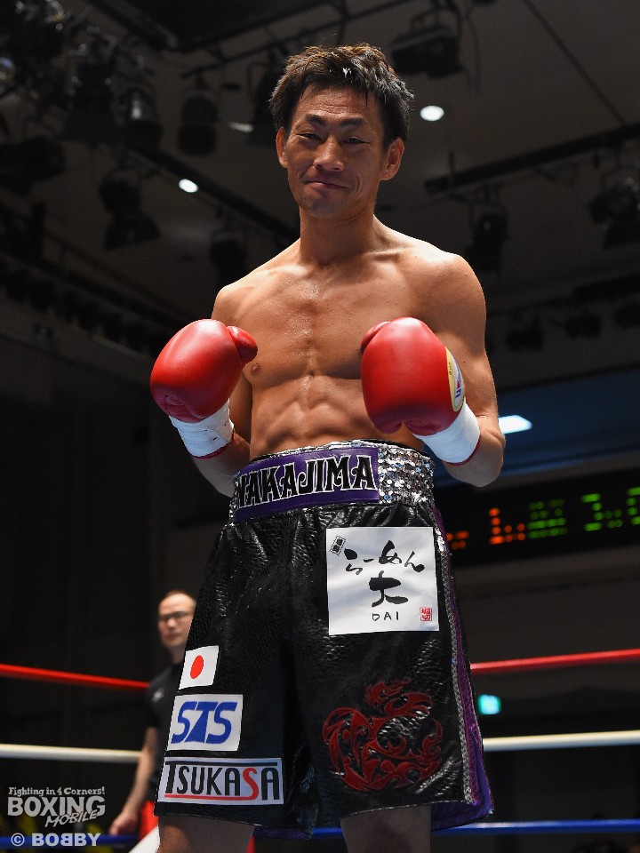 試合:今年2月に中国でWBC地域タイトルを獲得した中嶋だが6月、8月と連敗。同時に日本とOPBFランキングを失ってしまったが、復活を懸け17歳のタイ人と対戦した。体を柔らかく動かし、テンポよくワンツーを振ってくるハントーンに対し、中嶋も慎重に細かく出入り。すると、開始2分に左フックを2発、3発と力強く打ち込み、体勢が崩れたところに右を効かせダウンを奪った。再開後も連打で畳み掛けた中嶋は、最後は左ボディでフィニッシュ。タイ人に10カウントを聞かせた。今年最後の試合を初回KOで締めくくった32歳は、必ず這い上がりビッグマッチを実現させると誓った。