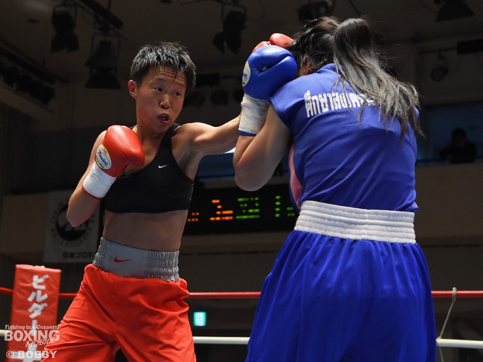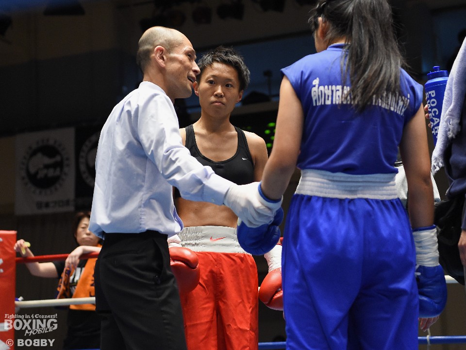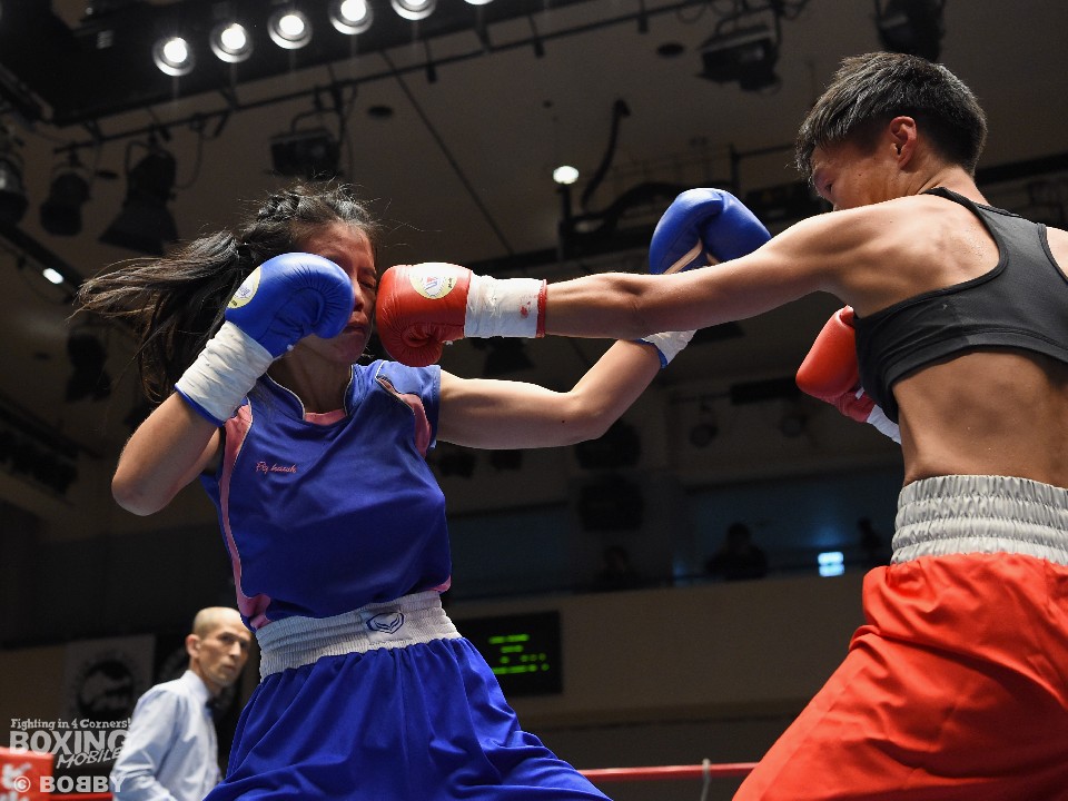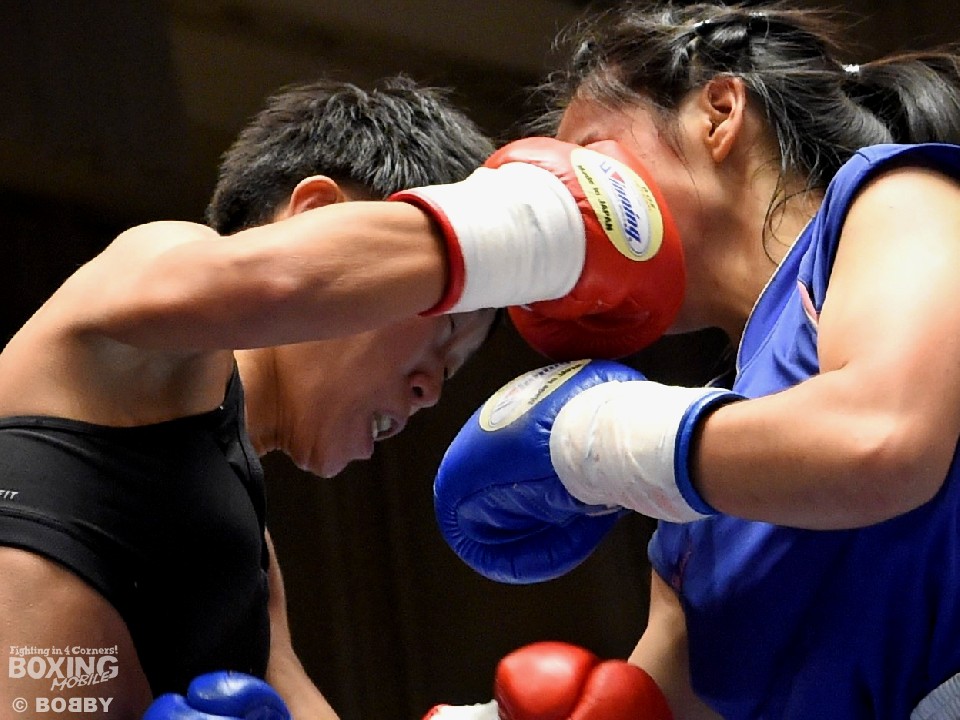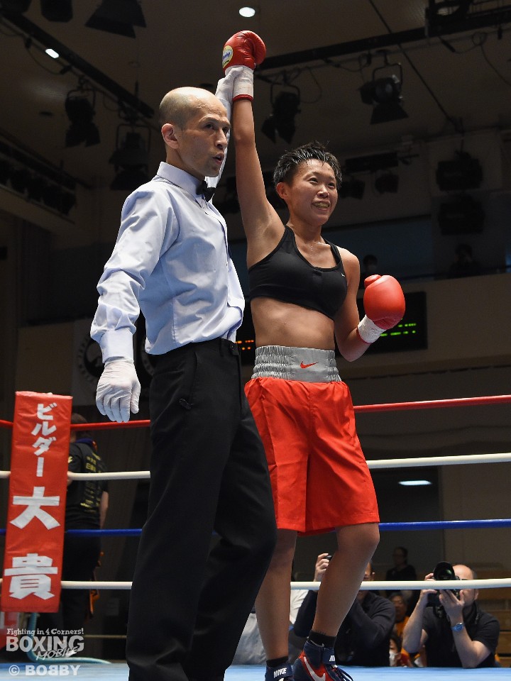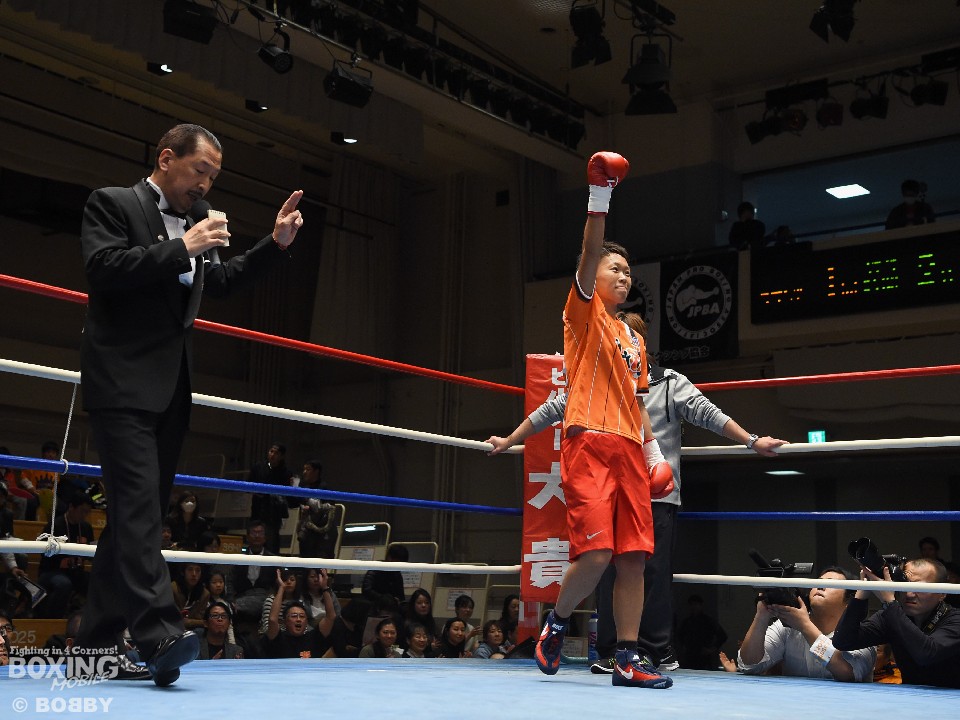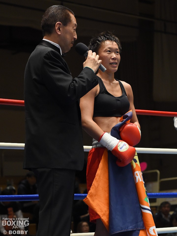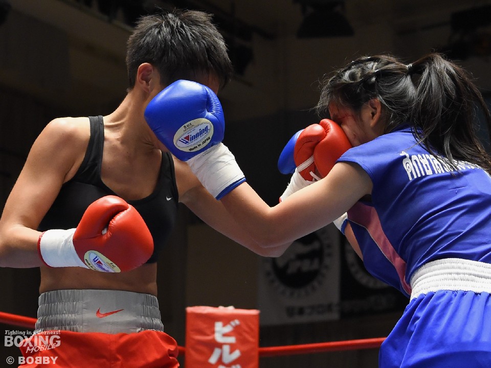 試合:女子サッカー「なでしこリーグ」で活躍した佐山がボクサーとしての第一歩を踏み出した。立ち上がりはニラポーンの手数と圧力に押され気味だったが、サッカーで鍛えた足を使い距離を取って落ち着くと、的確なワンツーをヒット。早くも相手の左目上を切り裂いた。リズムに乗った佐山は、2回も足を使いながら上下に有効打を当て攻勢をアピール。ニラポーンもしつこく前に出たがスピードでついて行けず、3回には連続でワンツーを浴びるなどガードを固める時間が長くなった。佐山はダウンこそ奪うことはできなかったが、スタミナを落とさず攻め続けフルマークの判定勝ち。デビュー戦を終えた佐山は、「嬉しい。ホッとしました」と喜び、応援に長野から駆けつけたサッカー時代のサポーターに感謝した。