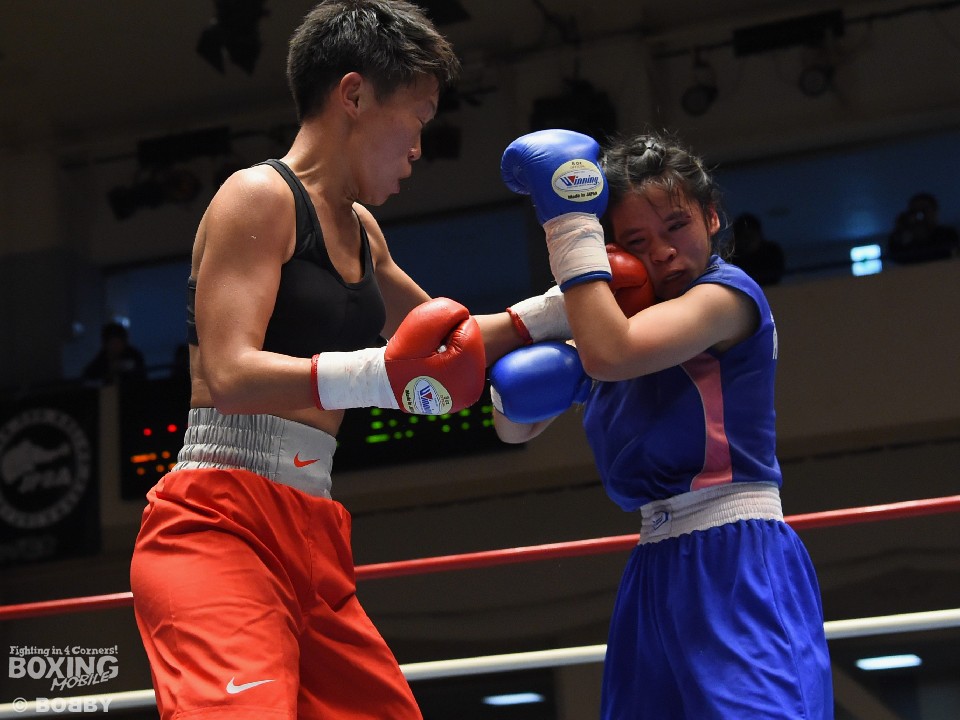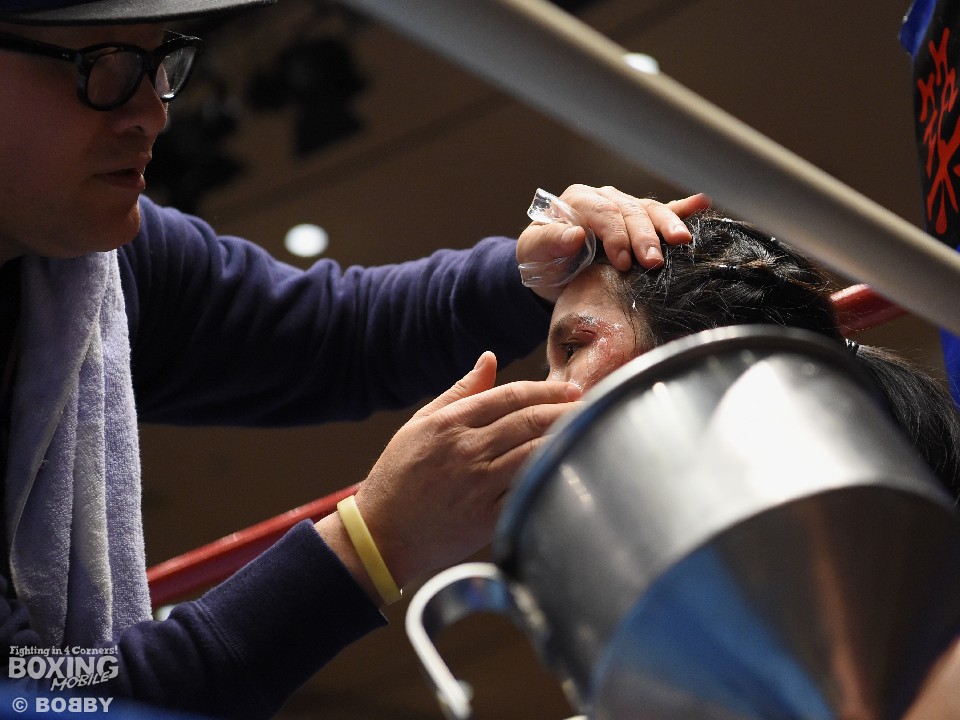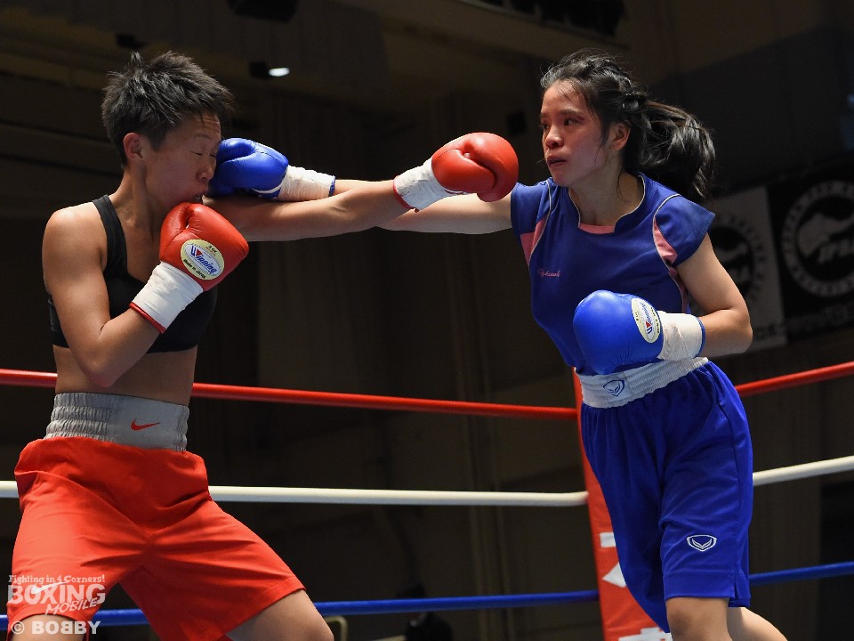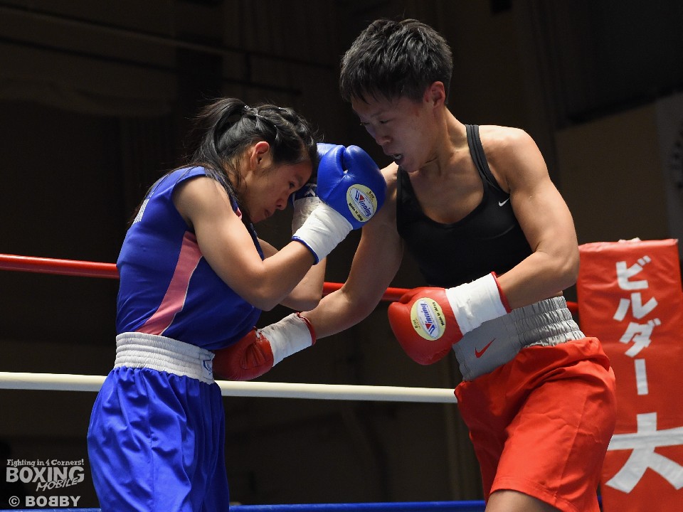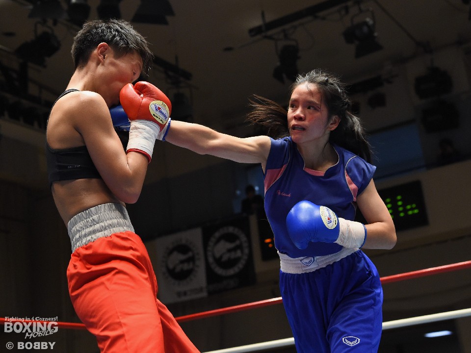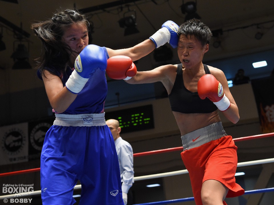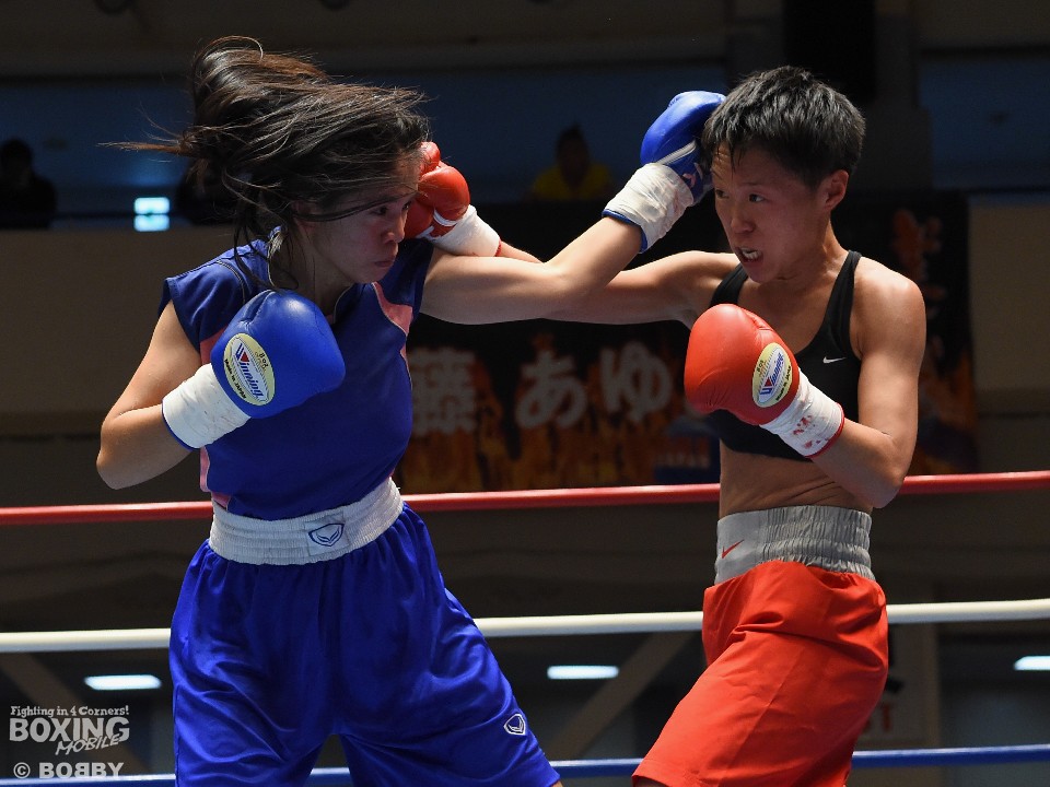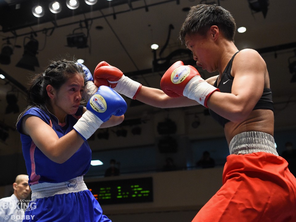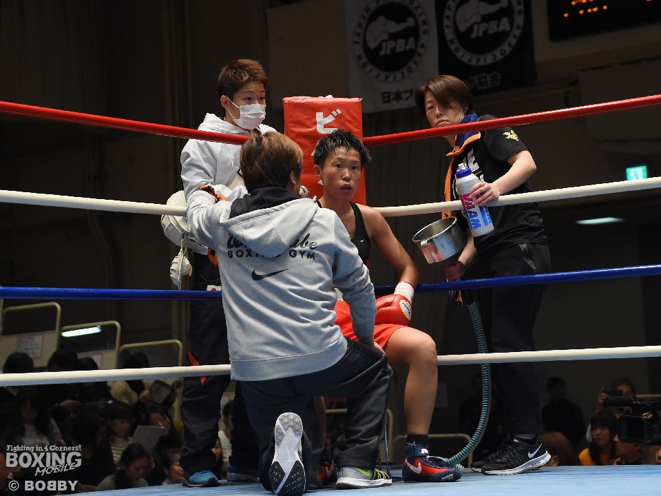 試合:女子サッカー「なでしこリーグ」で活躍した佐山がボクサーとしての第一歩を踏み出した。立ち上がりはニラポーンの手数と圧力に押され気味だったが、サッカーで鍛えた足を使い距離を取って落ち着くと、的確なワンツーをヒット。早くも相手の左目上を切り裂いた。リズムに乗った佐山は、2回も足を使いながら上下に有効打を当て攻勢をアピール。ニラポーンもしつこく前に出たがスピードでついて行けず、3回には連続でワンツーを浴びるなどガードを固める時間が長くなった。佐山はダウンこそ奪うことはできなかったが、スタミナを落とさず攻め続けフルマークの判定勝ち。デビュー戦を終えた佐山は、「嬉しい。ホッとしました」と喜び、応援に長野から駆けつけたサッカー時代のサポーターに感謝した。