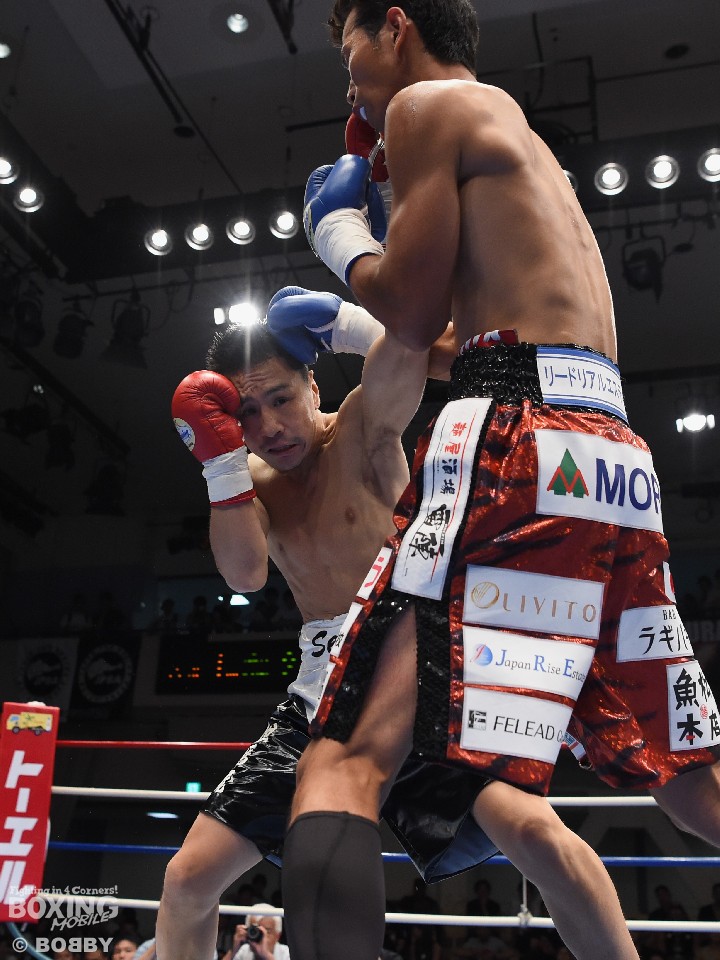 試合:昨年7月の世界戦敗退後、1年ぶりにリングに帰還した元祖リーセントボクサー和氣は、シンゴコールの大歓声に迎えられリングイン。一方、13ヵ月ぶりに復帰した元日本暫定王者の瀬籐も負けず劣らずの応援団に迎えられた。生き残りをかけたサバイバルマッチは立ち上がり、サウスポーの和氣がフットワークを活かし、細かい出入りから伝家の宝刀、左ストレートをヒット。早くも腰を落とした瀬籐も小刻みに身体を動かしては攻め込むスキを窺い、和氣のコンビネーションに耐えたあとは右を返し一矢報いた。2回、攻撃のリズムを取り戻した瀬籐はパンチを繰り出しながら距離を詰めたが、和氣もサイドに切り返すとボディの連打から間髪入ずに左ストレート、アッパーを放ち形成逆転。3回も左ストレートで瀬籐の体勢を崩したが、ここは瀬籐も粘りを見せ、和氣にコーナーを背負わせては初動の少ない右で反撃した。瀬籐は4回も和氣のコンビネーションをブロックで耐えては押し込み、右ストレートをヒット。だが、和氣の動きは止められず、5回には左ストレートの直撃から上下にまとめられ、コーナーに張りつけにされた。ここも執念で右を返し脱出したが、和氣の連打を受けきれなくなるとダメージが広がり、最後は自陣からタオルが投入された、再起戦をTKO勝ちで飾った和氣は、リング上でマイクを向けられ「ここまで正直不安で怖かったが、結果を残せて良かった。現時点で世界を口にする立場ではないが、いずれはもっとレベルアップして世界に挑みたい」と語った。