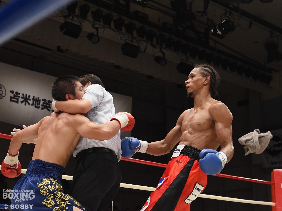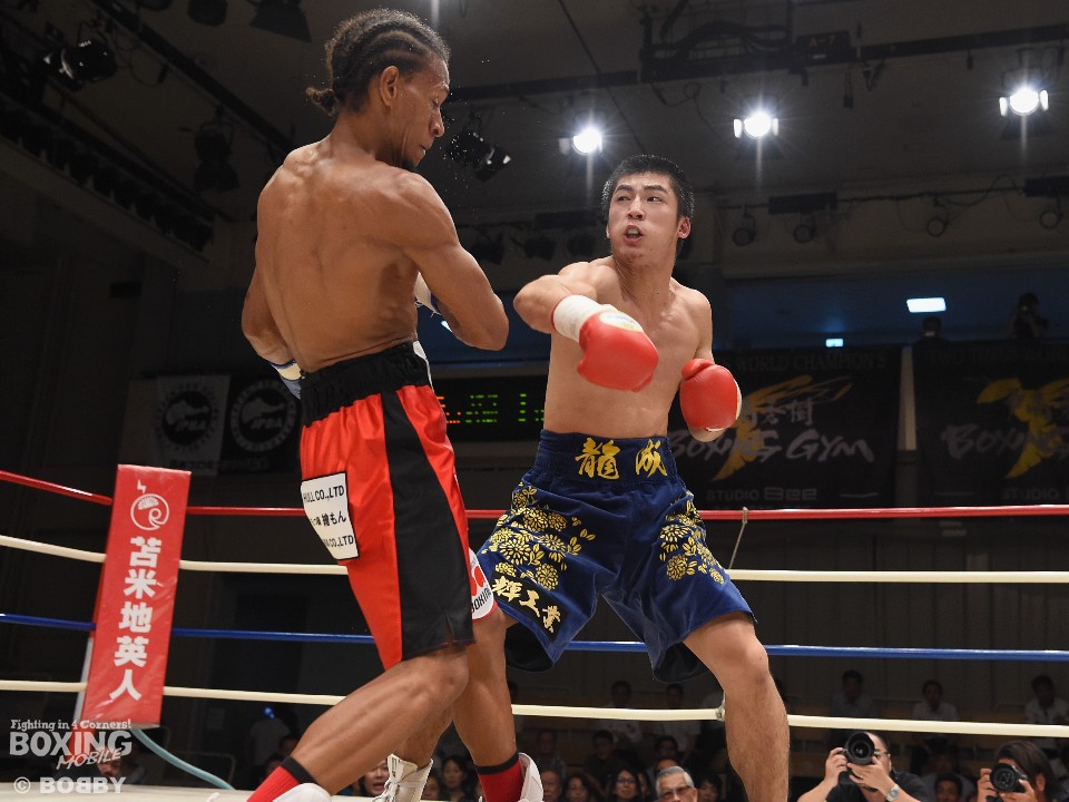 試合:前戦で9戦無敗のランカー永田大士(三迫)に快勝し、ランク入りをはたした元五輪ドミニカ共和国代表のデスティノと14年度全日本新人王の対戦。立ち上がり、サウスポーの中嶋がデスティノの出方を探りつつ、スキあらばジャブ、左ストレートで強襲した。返しのパンチもコンパクトで、幸先のいいスタートを切った中嶋だが、その矢先の2R、パンチが大きくなったところを狙われ、デスティノの右ストレートに大きく腰を落としてしまった。ここをクリンチで乗り切った中嶋は、デスティノの右を軽快し攻め手を欠いたかに見えたが、3回に飛び込んでの左ストレートでダウンを奪った。しかし、再開後に詰められたところで右ストレート、返しの左フックで倒し返されイーブンに。続く4回はデスティノの右アッパーが顎に決まり宙を泳いだ中嶋だが、このピンチに思い切って前に出ると左右の猛打で襲いかかり、今度はデスティノの足をふらつかせた。5回もデスティノとバチバチに打ち合った中嶋だが、3回のダウン時に左目に異常を抱えており、これ以上の続行を危険と見たレフェリーに救出。同時にタオルが投げ込まれた。