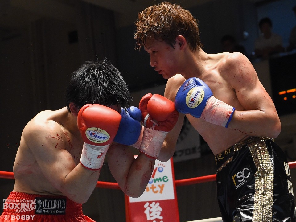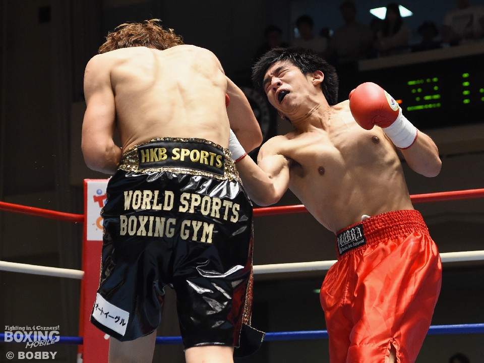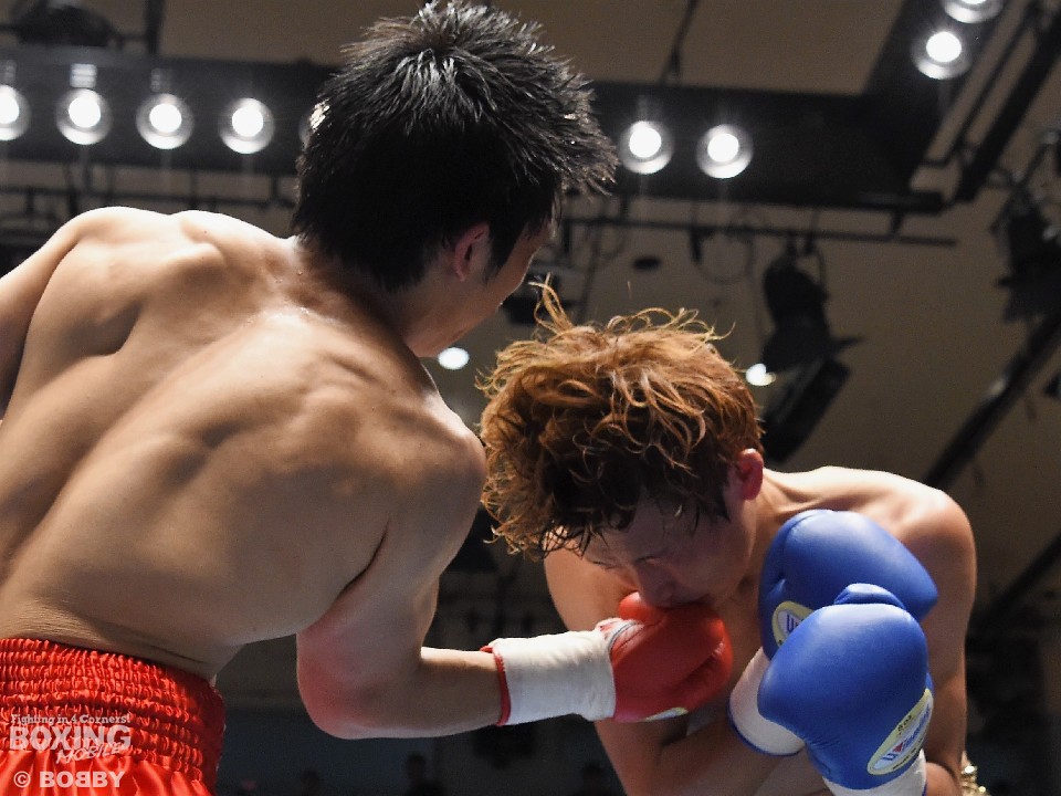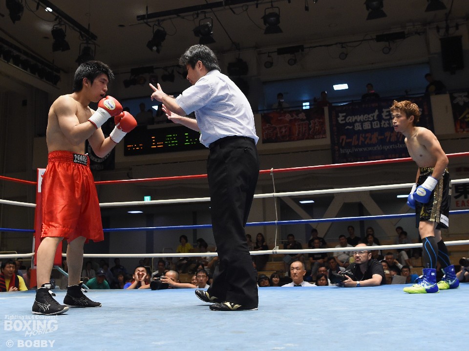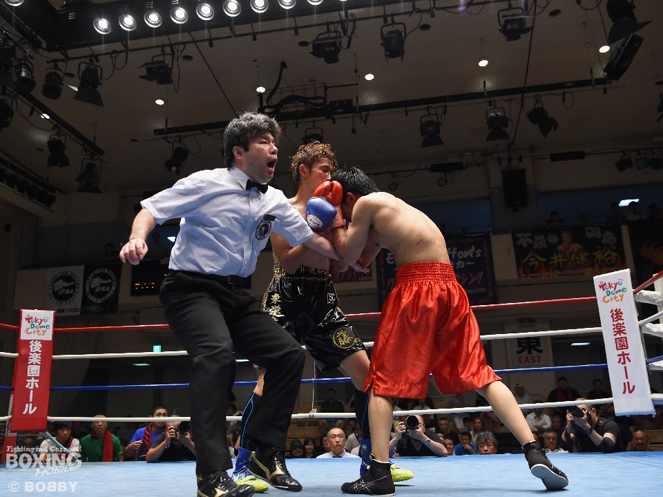 試合:ここまで4戦全勝、3連続KO中の今井が登場。立ち上がり、今井がジャブ、フック、ボディで切り込んだが、打ち終わりを狙う遠藤の右アッパーにグラリと身体を揺らした。ここを踏ん張った今井は、打ち合いに転じ右フックでダウンを奪うが、遠藤も再開直後に今井のテンプルに右を浴びせ攻勢を許さなかった。2回もボディから上に返す押し合いとなり、今井の左フック、右ショートが上回ったが、遠藤も体勢を崩しながら必死の抵抗。3回は捨て身で前に出た遠藤に今井が左右のショートを連打。遠藤は血まみれになりながらも踏みとどまったが、最後は危険と見たレフェリーに抱きかかえられた。