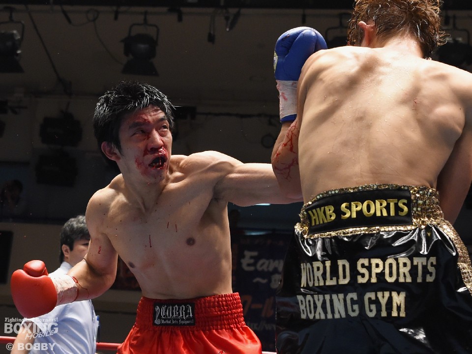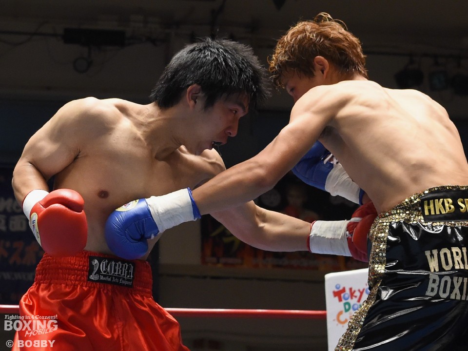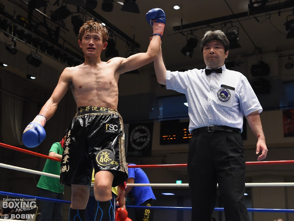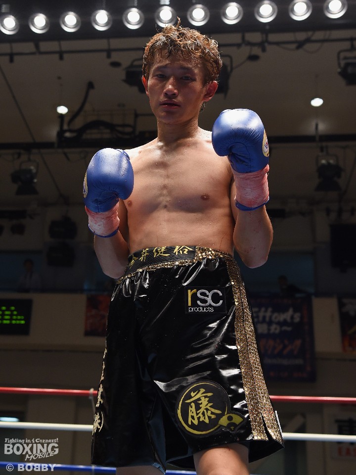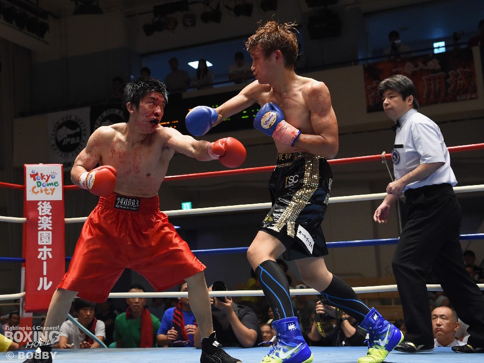 試合:ここまで4戦全勝、3連続KO中の今井が登場。立ち上がり、今井がジャブ、フック、ボディで切り込んだが、打ち終わりを狙う遠藤の右アッパーにグラリと身体を揺らした。ここを踏ん張った今井は、打ち合いに転じ右フックでダウンを奪うが、遠藤も再開直後に今井のテンプルに右を浴びせ攻勢を許さなかった。2回もボディから上に返す押し合いとなり、今井の左フック、右ショートが上回ったが、遠藤も体勢を崩しながら必死の抵抗。3回は捨て身で前に出た遠藤に今井が左右のショートを連打。遠藤は血まみれになりながらも踏みとどまったが、最後は危険と見たレフェリーに抱きかかえられた。