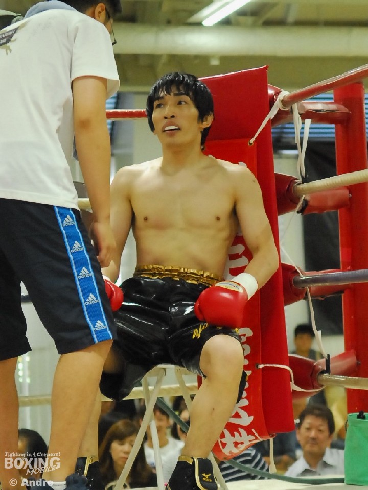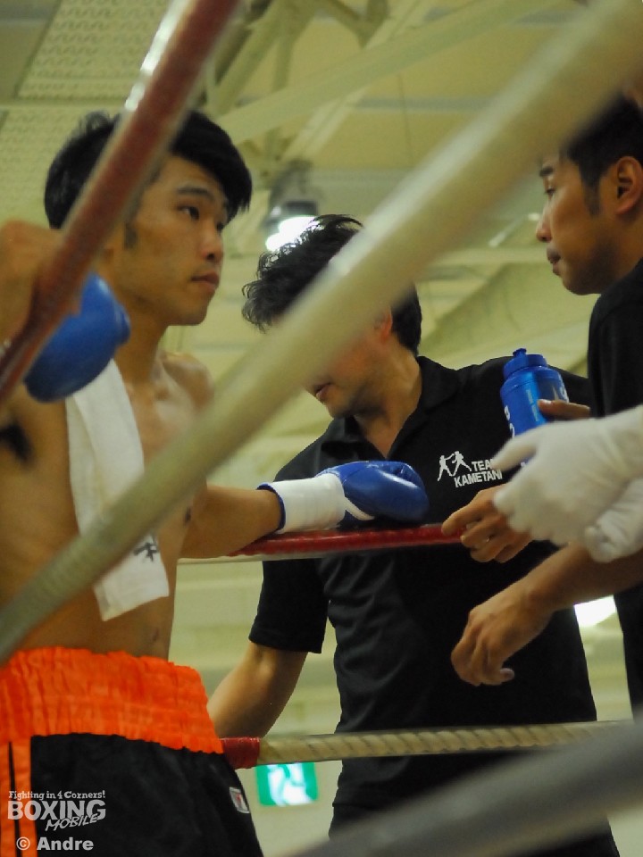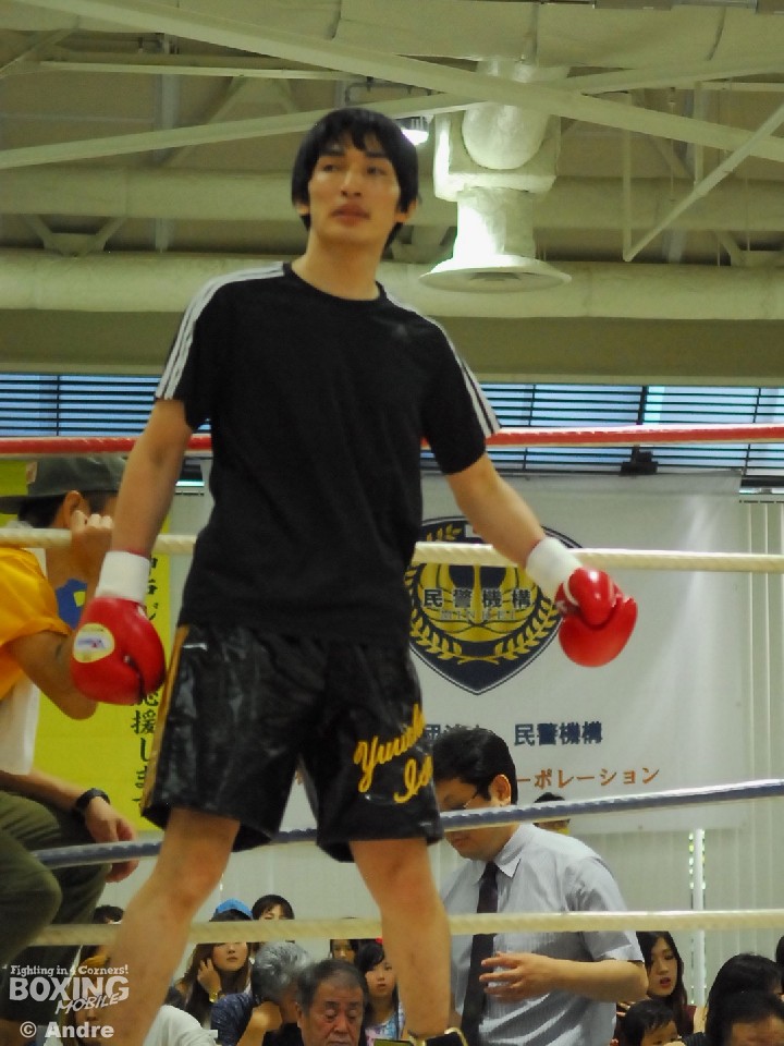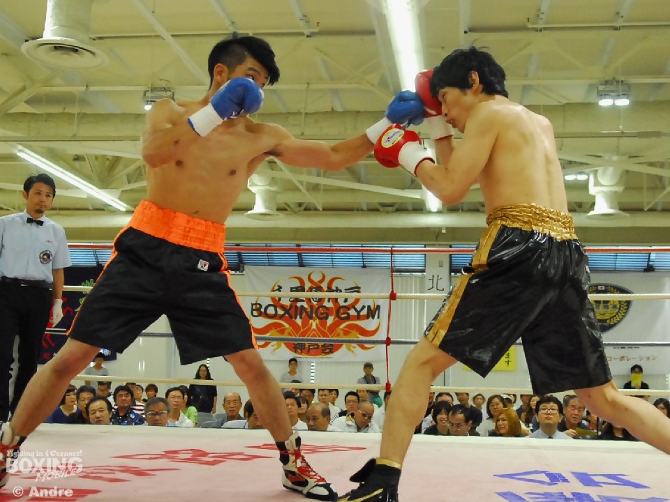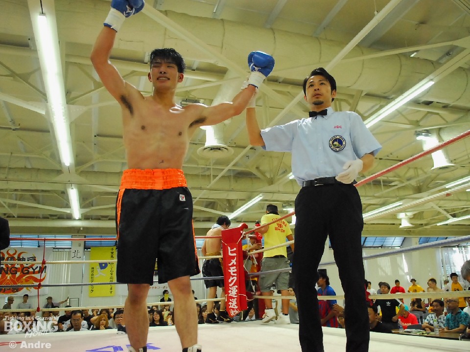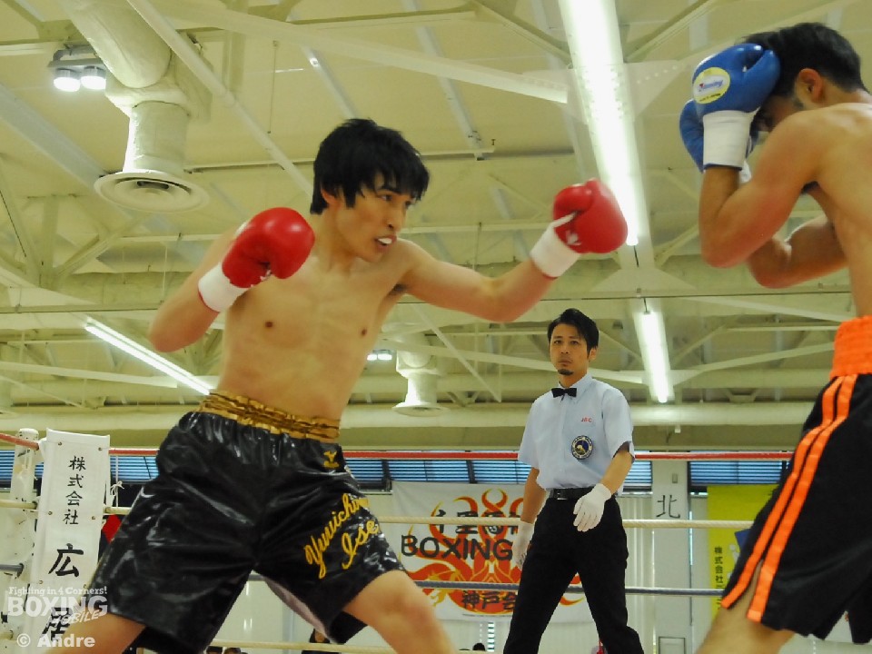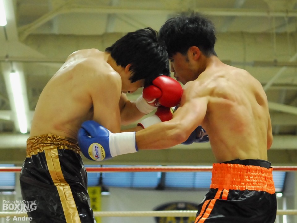 試合:安部はガードを固めジリジリと距離を詰め左右のボディから左フックをあてていく。対して、伊勢はジャブで安部のガードを割ると左フックを狙う。中盤、執拗に左ボディをあてる安部がやや優位に試合を進める。伊勢も右ストレートで打開をはかる。ラストラウンド、両者はボディを打ち合いスタミナを削り合う。判定は(2-1)で安部に軍配が上がった。