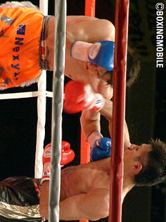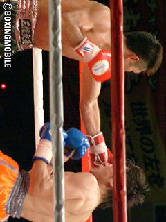 試合:内山は序盤からジャブで距離を計り、コンパクトなワンツーで攻め、右ストレートを阪東にヒット。対する阪東は、左右フックで攻めるもやや大振りになってしまいクリーンヒットはせず。3R終了間際、内山の右ストレートをもらうも阪東が右フックを返し、これが内山にヒットし腰を落とさせるもラウンド終了のゴング。4R以降は内山がジャブからワンツー・左ボディを阪東にヒットさせ、確実にポイントを奪う。阪東も左右フックで反撃するがやや大振りか。試合は内山が丁寧なボクシングでリードし、判定で勝利。大会場を意識してしまったのか、ややおとなしめのボクシングになってしまった内山だが、東洋王座を死守。