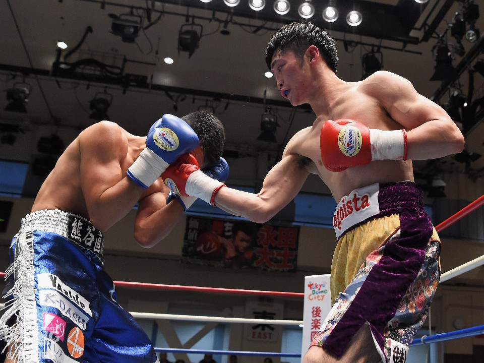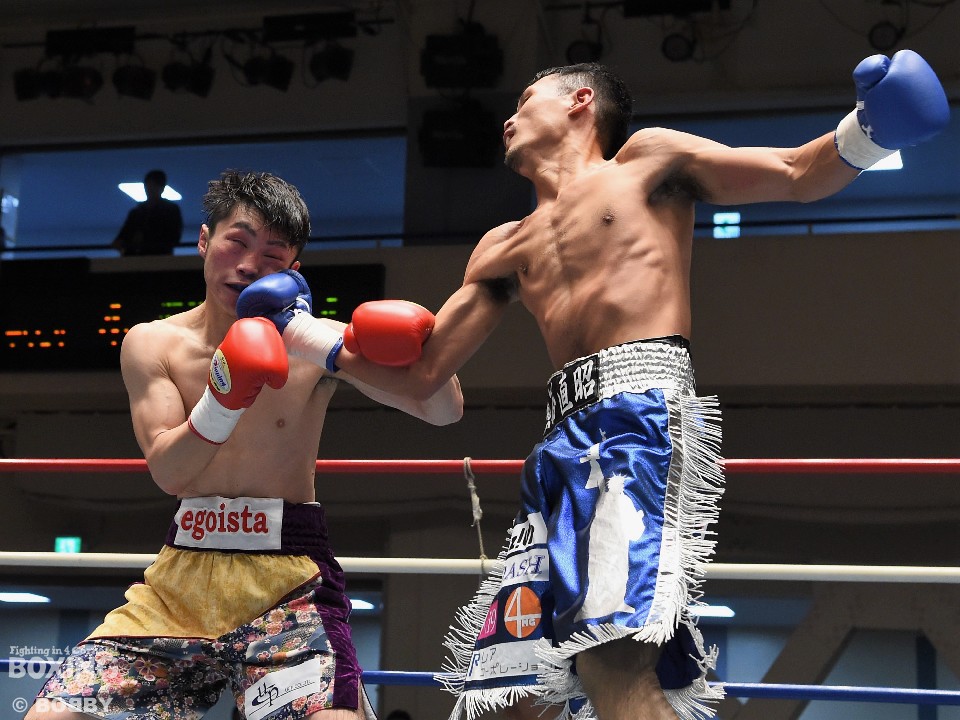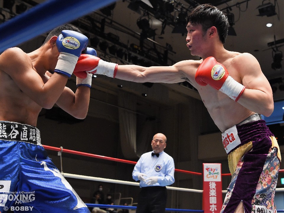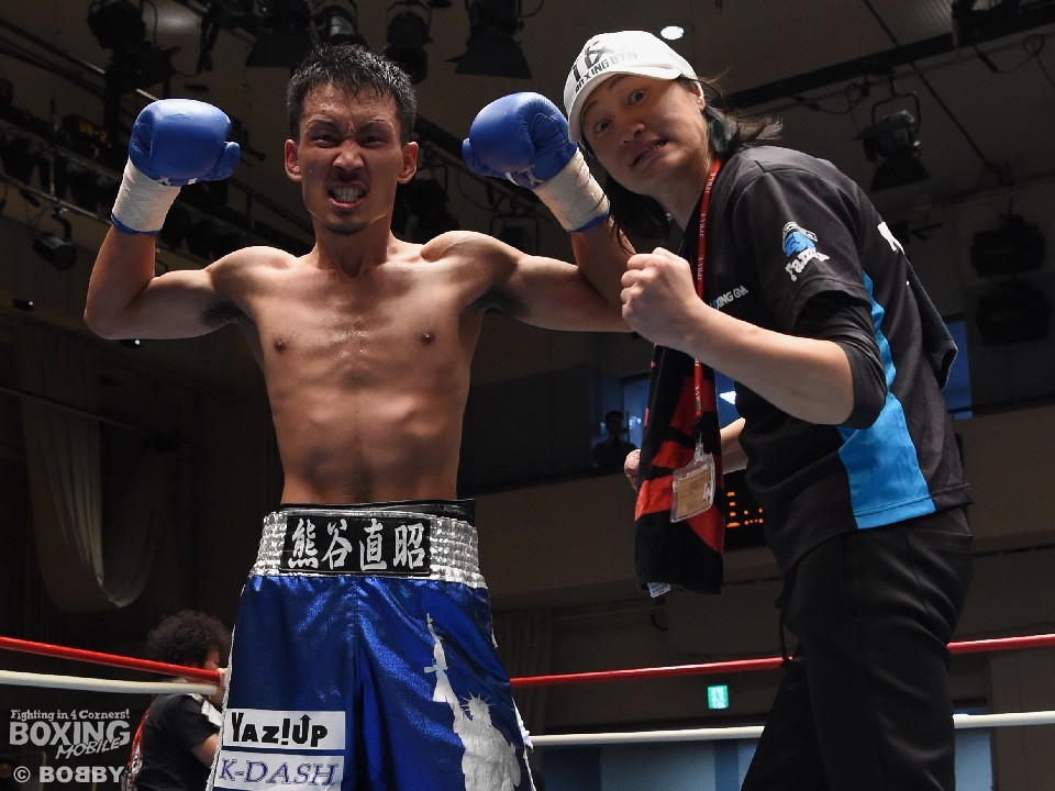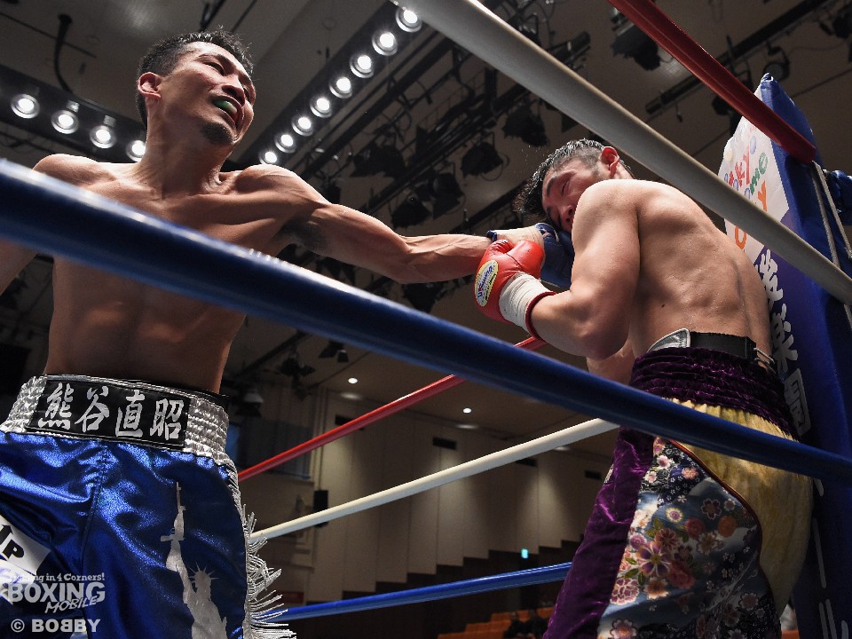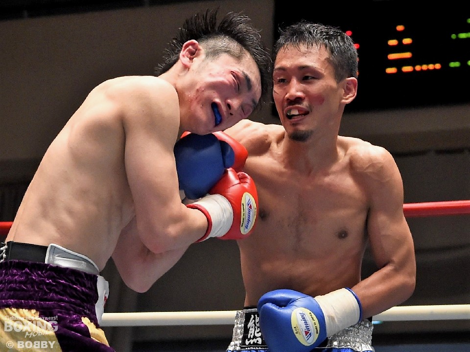 試合:熊谷直昭はトリッキー熊谷とリングネームを変えての再起戦。低く構える熊谷は序盤、ジワジワと圧力をかける19戦目の嶋崎に打ち下ろしの右をもらったが、超低空からの右アッパーを突き上げ会場を沸かせると、2回には体重を乗せた左ボディから右フックで嶋崎に応戦した。嶋崎も変則的な攻撃に対し、冷静にワンツーからのコンビネーションを繰り出しヒットさせたが、3回にジャブの刺し合いで右目を腫らせてしまうと、ペースアップした熊谷に追い込まれるシーンが目立った。嶋崎は4回も右アッパー、左フックを被弾したが、左右スイングをダッキングでかわしてはボディを叩き、5回には疲れを見せはじめた熊谷に下から上にパンチをまとめ攻勢を印象づけた。この回、嶋崎はヒッティングで右目上をカットしたが、続く6回も熊谷を追撃。熊谷も足が止まりそうになっては上手く逃れ、遠間から飛び込み単発の強打をヒットした。すると最終8回、嶋崎を呼び込んだ形で右を効かせると、ここからラッシュ。コーナーでパンチをまとめられた嶋崎も持ち堪えると反撃に打って出たが、最後は熊谷の左フックでダウン。起き上がることができず、10カウントが数え上げられた。