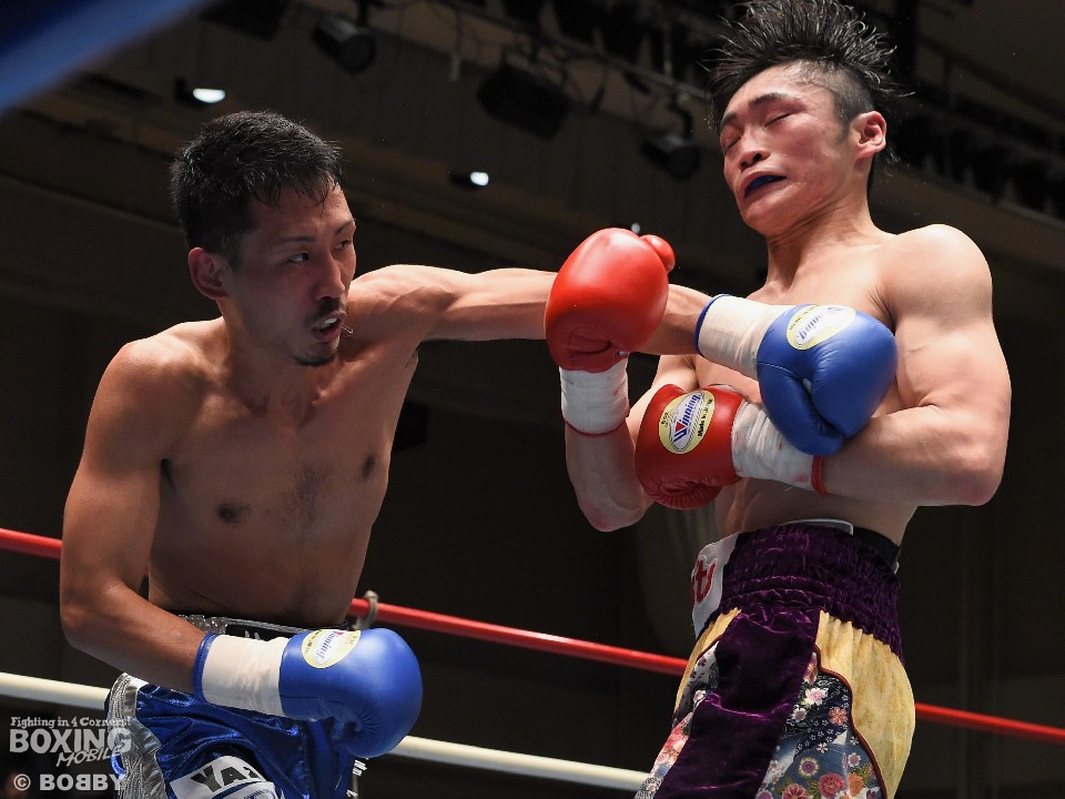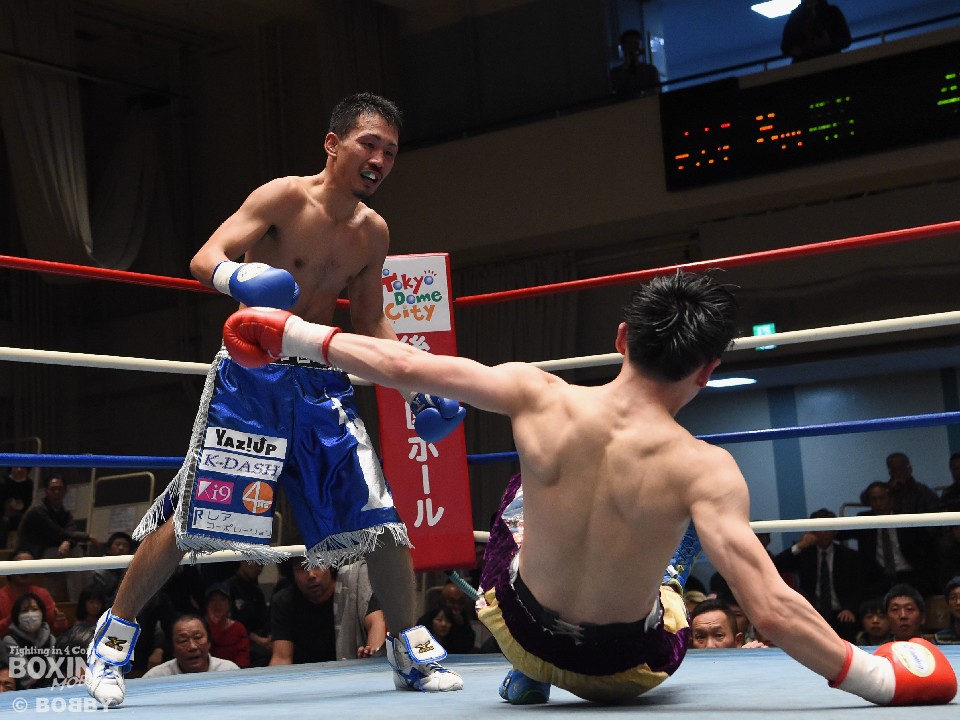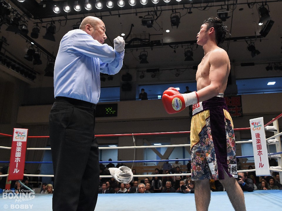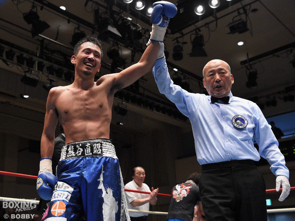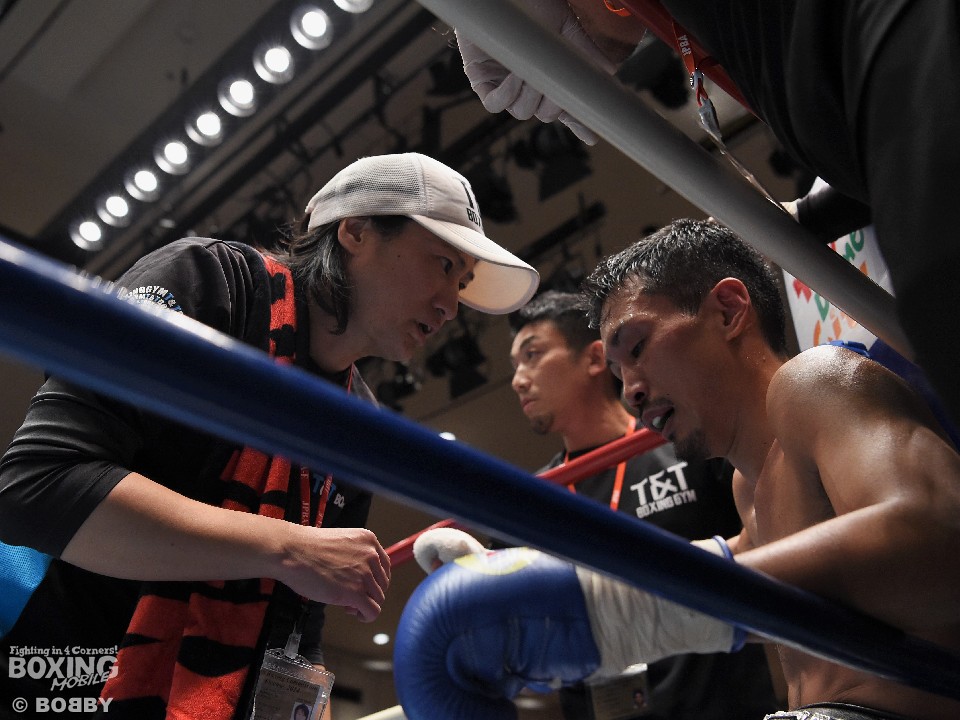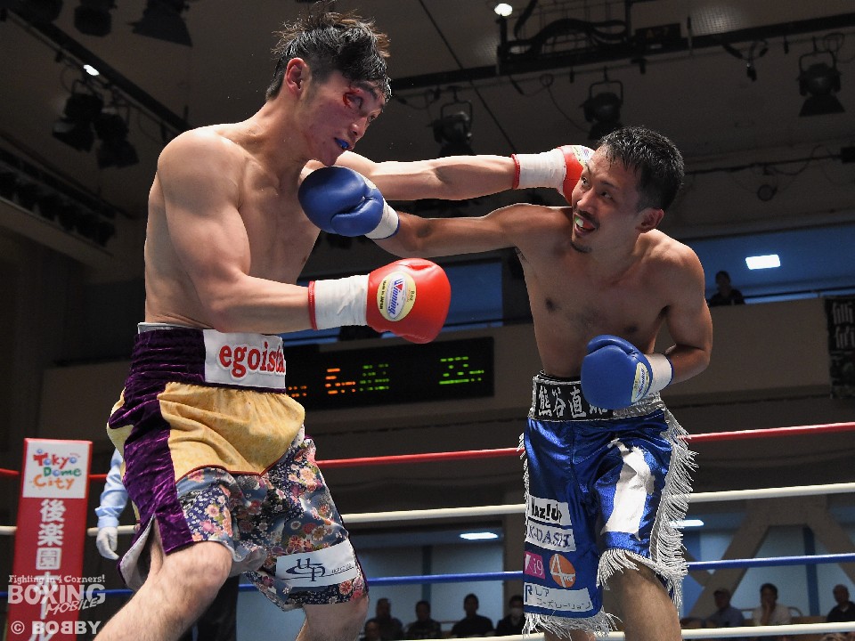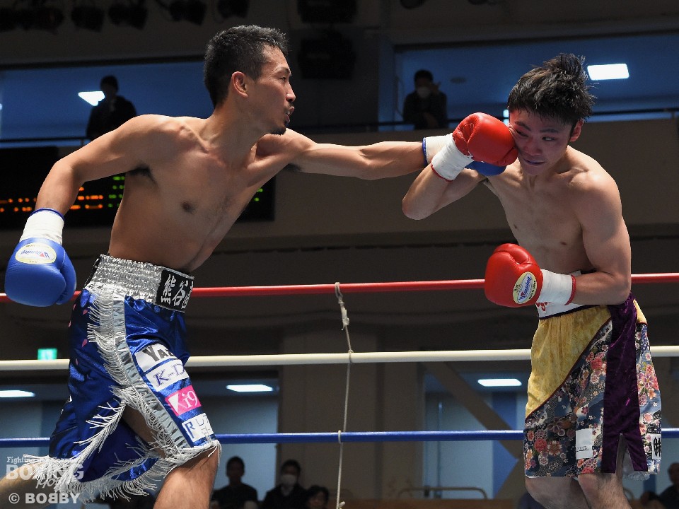 試合:熊谷直昭はトリッキー熊谷とリングネームを変えての再起戦。低く構える熊谷は序盤、ジワジワと圧力をかける19戦目の嶋崎に打ち下ろしの右をもらったが、超低空からの右アッパーを突き上げ会場を沸かせると、2回には体重を乗せた左ボディから右フックで嶋崎に応戦した。嶋崎も変則的な攻撃に対し、冷静にワンツーからのコンビネーションを繰り出しヒットさせたが、3回にジャブの刺し合いで右目を腫らせてしまうと、ペースアップした熊谷に追い込まれるシーンが目立った。嶋崎は4回も右アッパー、左フックを被弾したが、左右スイングをダッキングでかわしてはボディを叩き、5回には疲れを見せはじめた熊谷に下から上にパンチをまとめ攻勢を印象づけた。この回、嶋崎はヒッティングで右目上をカットしたが、続く6回も熊谷を追撃。熊谷も足が止まりそうになっては上手く逃れ、遠間から飛び込み単発の強打をヒットした。すると最終8回、嶋崎を呼び込んだ形で右を効かせると、ここからラッシュ。コーナーでパンチをまとめられた嶋崎も持ち堪えると反撃に打って出たが、最後は熊谷の左フックでダウン。起き上がることができず、10カウントが数え上げられた。