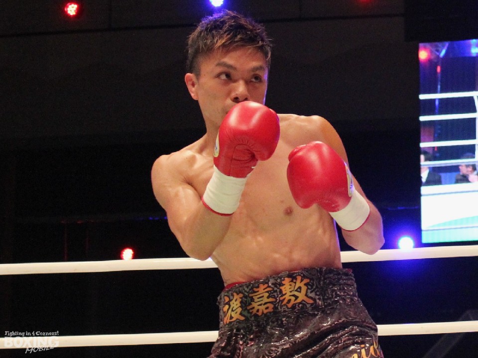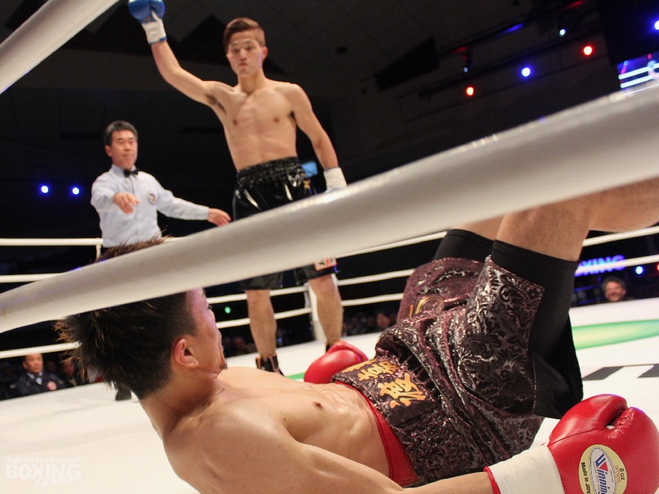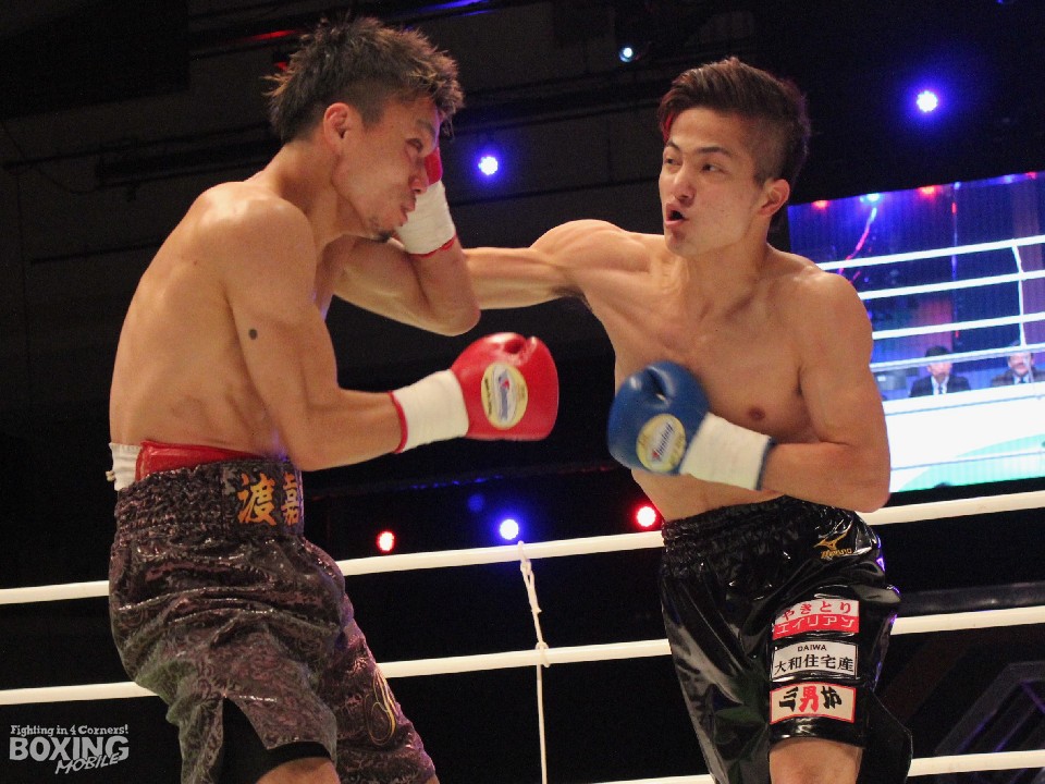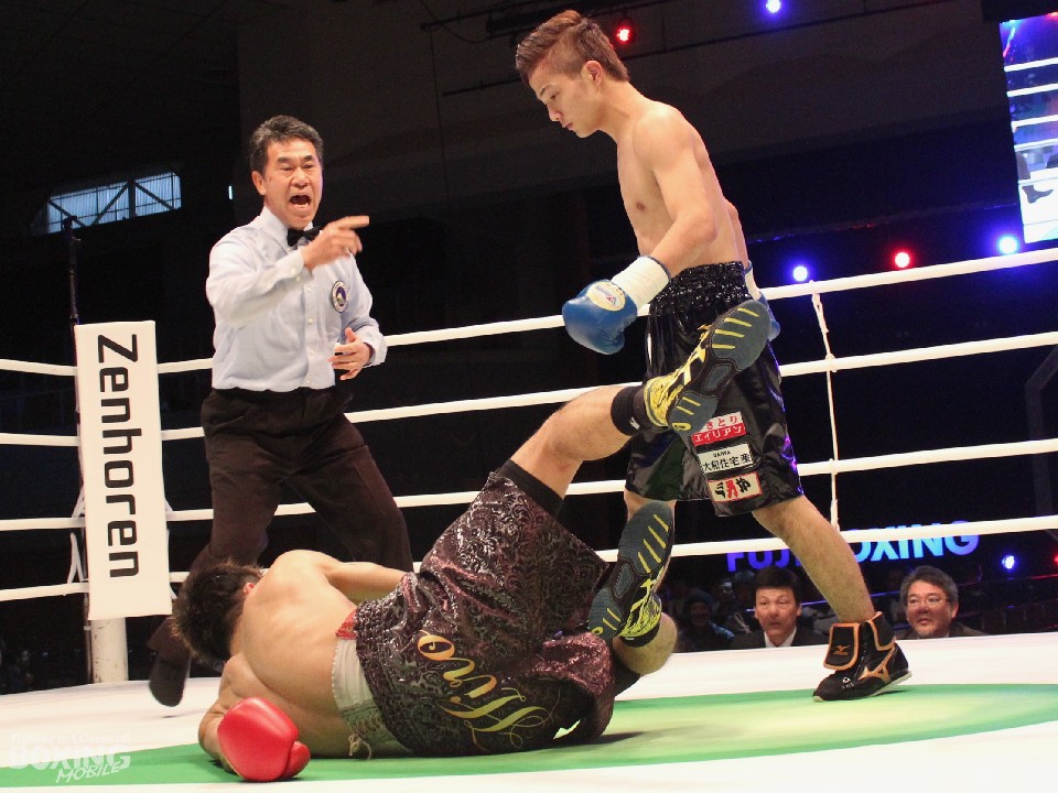 試合:プレスを掛けてワンツーを軸に攻撃を組み立てる渡邊に対して、ジャブで距離を測る山城は初回、カウンターに左フックを合わすとドンピシャのタイミングで顔面をとらえてダウンを奪った。立ち上がった渡邊だが、山城が右からの左でダウンを追加。レフェリーはカウントせずに試合を止めた。