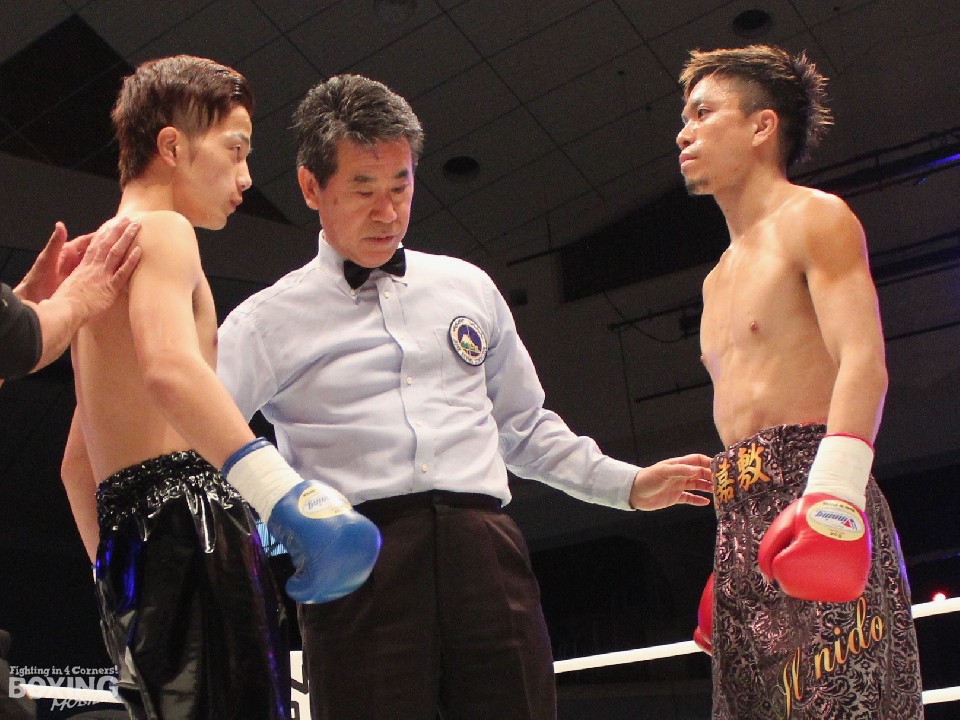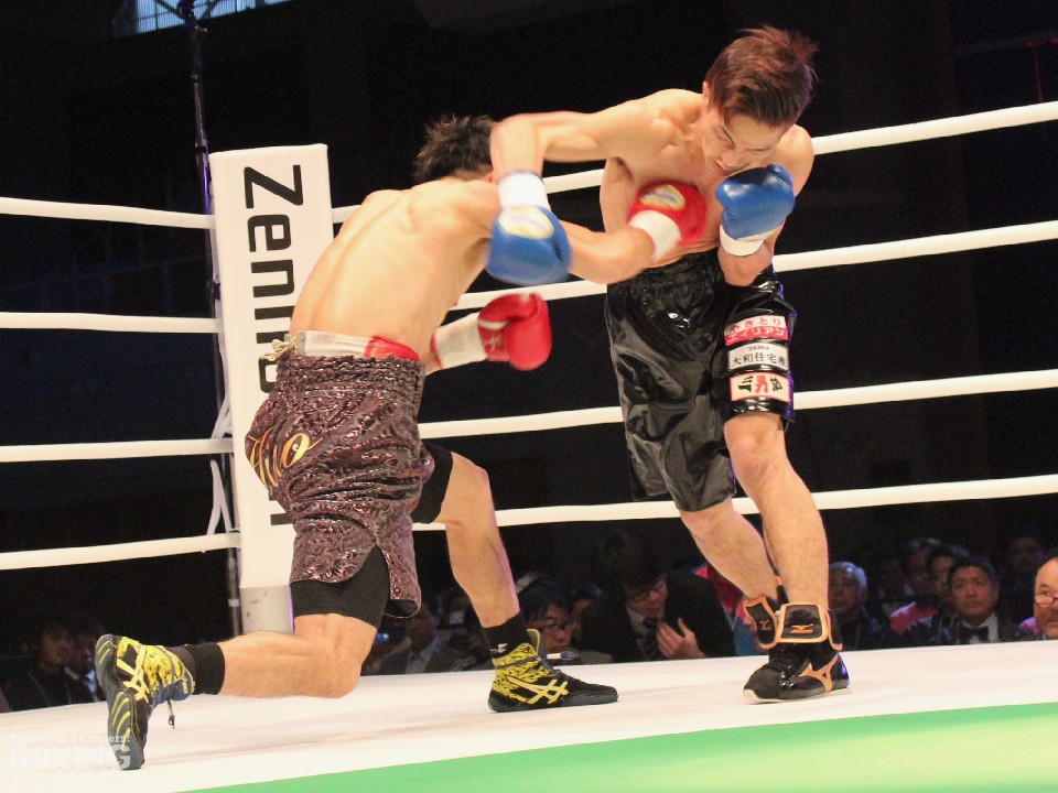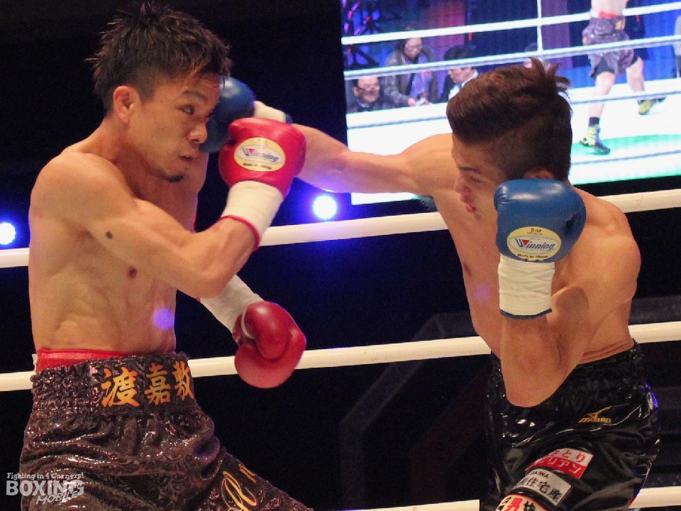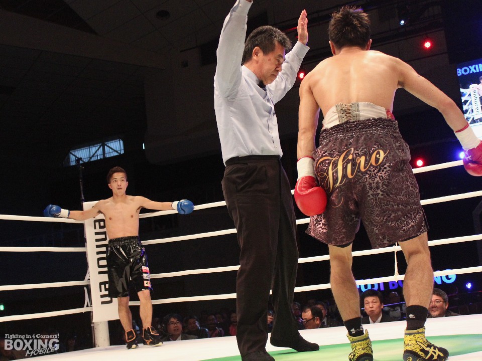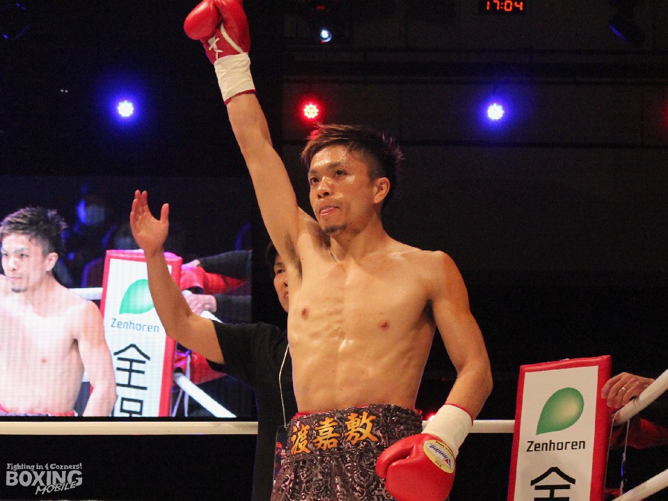 試合:プレスを掛けてワンツーを軸に攻撃を組み立てる渡邊に対して、ジャブで距離を測る山城は初回、カウンターに左フックを合わすとドンピシャのタイミングで顔面をとらえてダウンを奪った。立ち上がった渡邊だが、山城が右からの左でダウンを追加。レフェリーはカウントせずに試合を止めた。