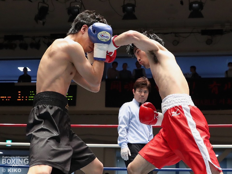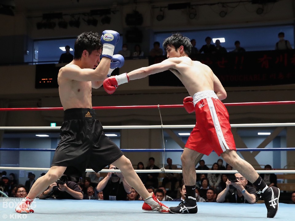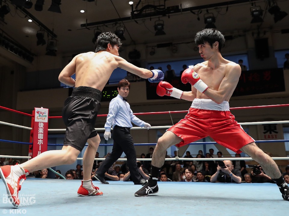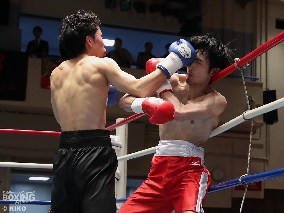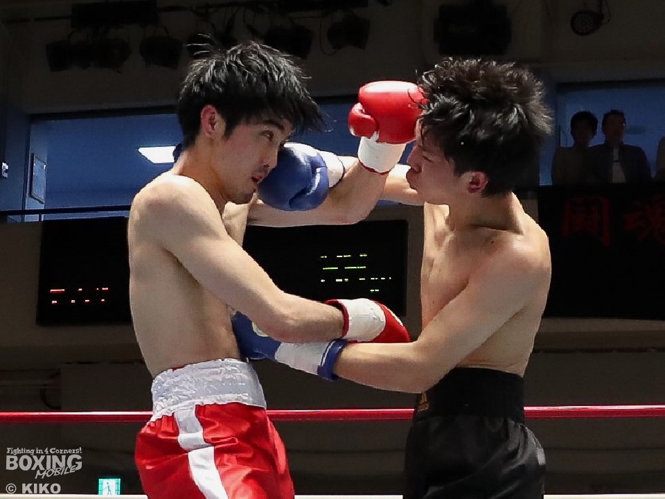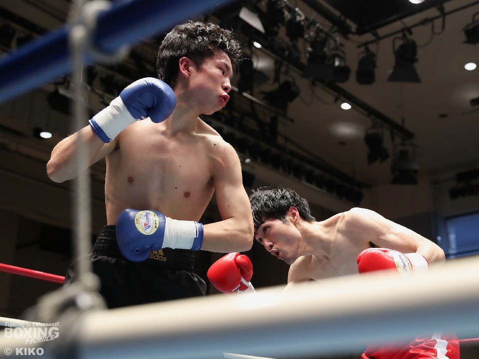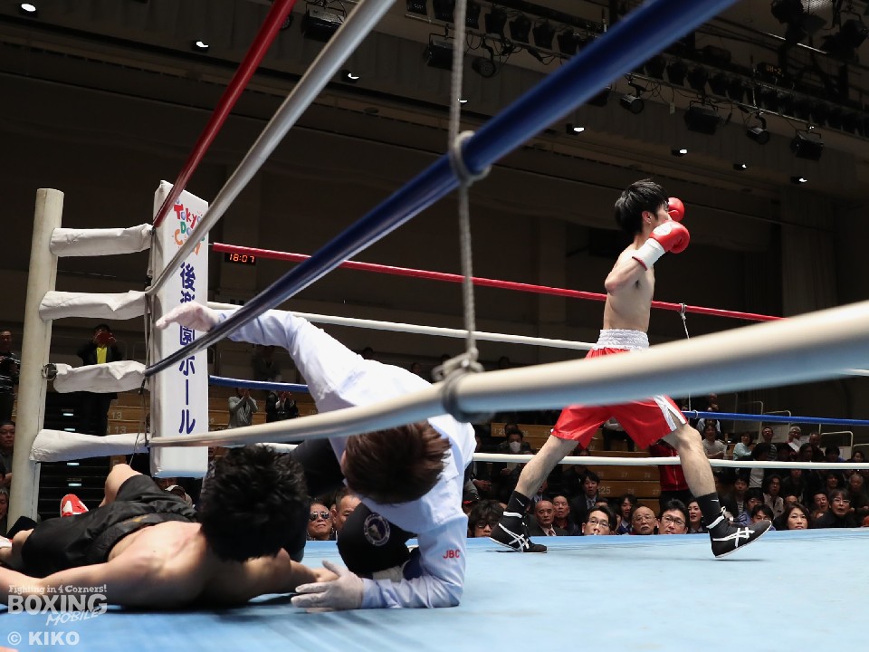 :デビュー同士の一戦は、サウスポーの長島が先手で仕掛け、幸先よくジャブ、ワンツーをヒット。すると1分過ぎにワンツー、スリーまで決め、立て続けに2度のダウンを奪った。中島は立て直そうと左右を振りまわしこの回を凌いだが、2回も左で切り込まれると被弾が目立ち、コーナーに詰められたところで左を浴び、ストップと同時に崩れ落ちた。