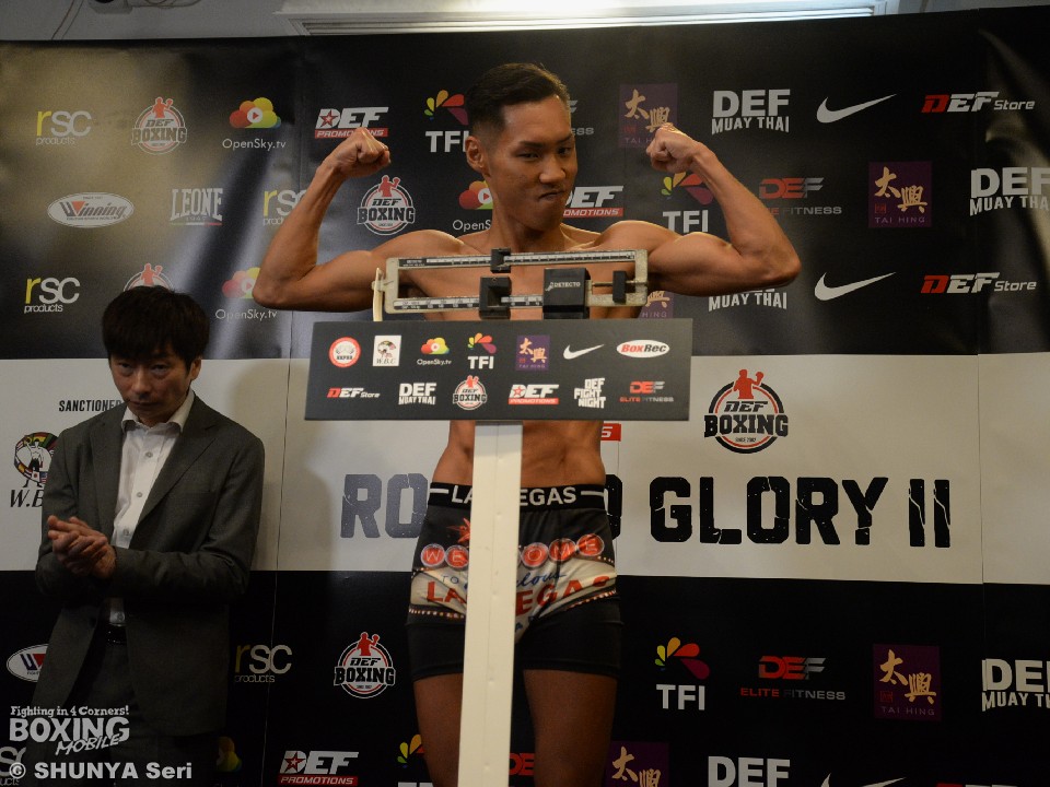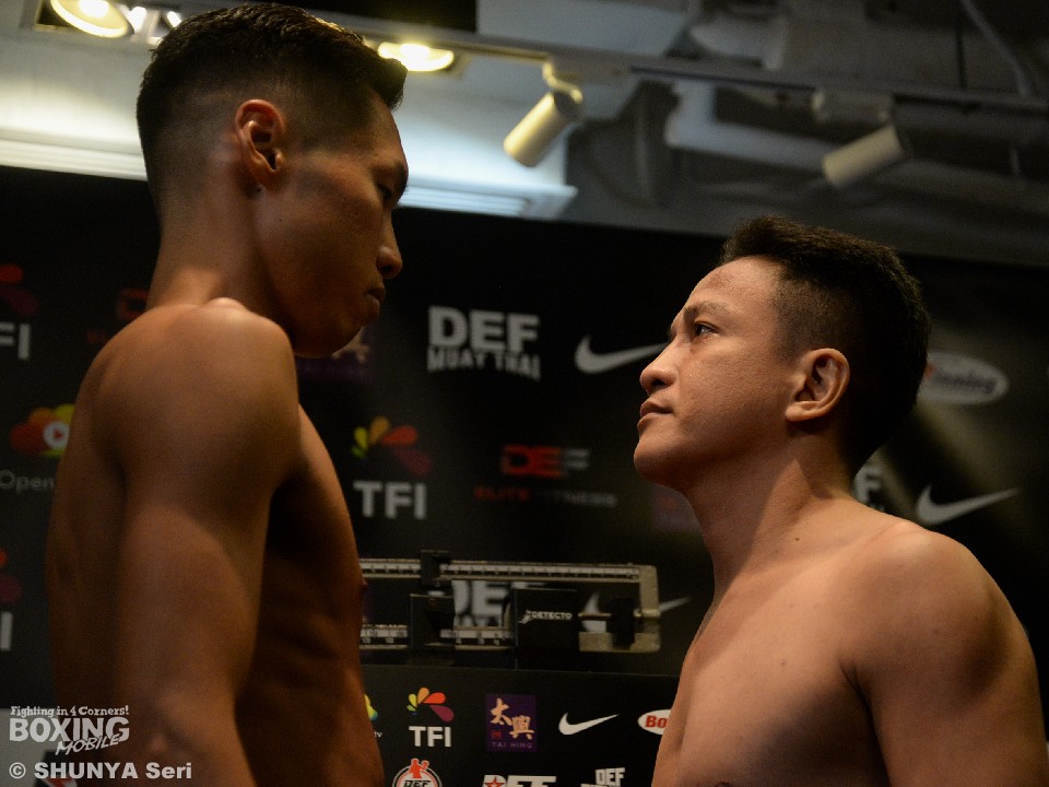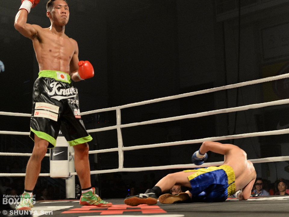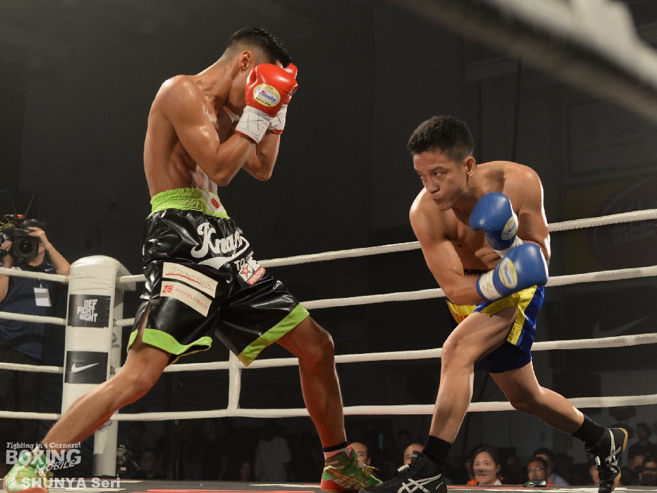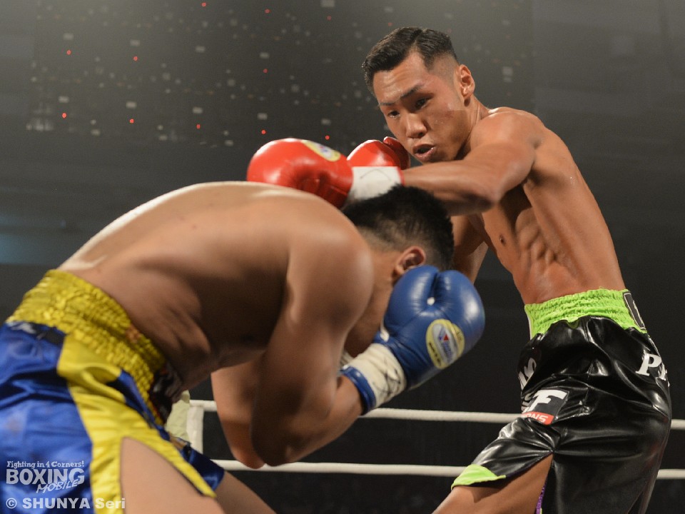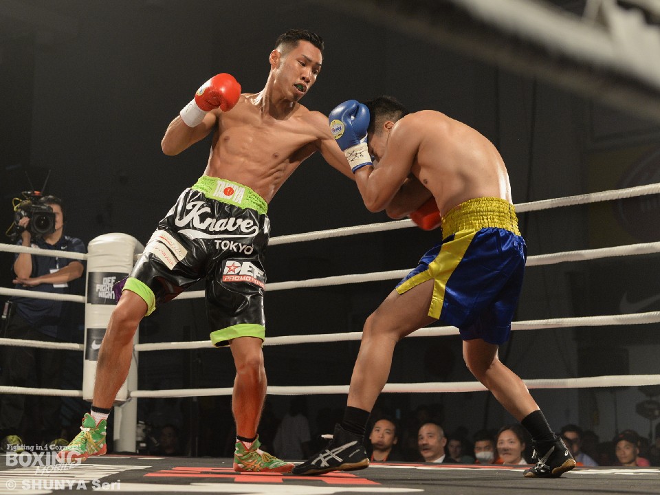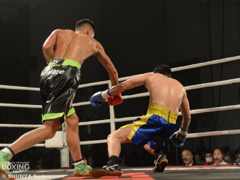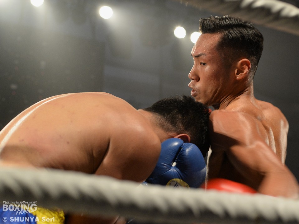 試合:いまだ香港のボクシングファンが親近感を持つ渡邉。今回は初回から左ボディへのカウンターが冴え、バロンサイがラウンド終盤に奇襲のラッシュを仕掛けても問題なくブロック。2回に入っても渡邉のボディーブローは好調で、バロンサイは我慢するばかりだが、それ以上にブロッキングの堅固さに戸惑った様子だった。そして3回、渡邉の左アッパーが直撃。そのまま右を追加したが、その必要もなく、バロンサイは崩れ落ちて続行不能となった。