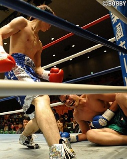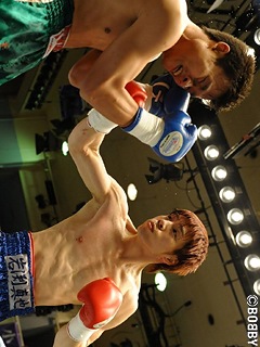 試合:フェイントを入れながら間合いを詰めていく岩渕。ジャブをつきながらリングを大きく回るサードトラだが、なかなか入ってこない岩渕に業を煮やしたか、「打ってこい」の挑発ポーズ。2R、短い距離でコーナーに追い込み、打つ場所を探しながら右1本で上下多彩に攻撃をする岩渕。3R、サードトラの大振りをしっかりガード し、すかさず右ボディから左ストレートで反撃、そのままテンカウント決着となった。