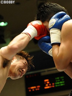 試合:両者23戦目のベテラン。ともに速い攻撃を仕掛け、どちらが先に自分の展開に持ち込めるかといった立ち上がり。ジャブで組み立て、体を振りながら中に入っていきたい柴田に、打ち終わりを狙って右クロスを放つ橋本。橋本が踏ん張ってボディ三連発を放てば、柴田はアッパー三連発と互いに譲らない展開が続く。脇をしっかりし めて固いガードで前へ前へ進み、こつこつとショートアッパーを突き上げるも、橋本にワンツーを打ち抜かれて決定打に欠ける。5Rに入り、3Rの偶バツでカットした橋本の左目上の傷が深く、二度目のDCで続行不可能と判断され負傷判定へ。ちなみに柴田は、小口のヅラがずれたことで有名になった試合の対戦相手。