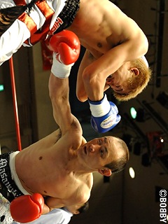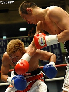 試合:序盤、動きがかたい片山に対し、ジャブで着実に自分のリズムを作り上げていく小口。上下打ち分けて攻撃を仕掛けたい片山だが、後傾気味なので二発目三発目とまとめきれない。その間もジャブからワンツー、離れ際でも体をねじりながらヒットさせる小口。4R、ジャブではまっすぐ下がり、ショートでは頭が下がる片山を前へ 前へ押し込みながら、あいているところに容赦なく打ち続ける小口。手数の多さで圧倒、止まらぬ連打でレフェリーが両者に割って入った。