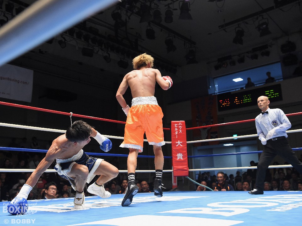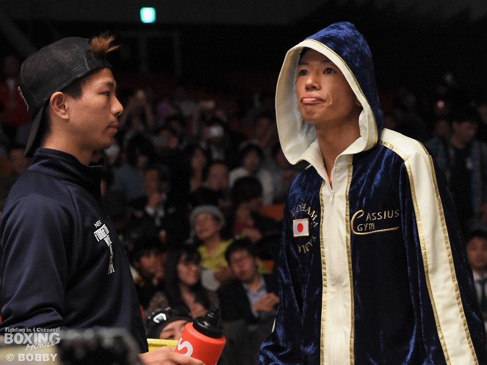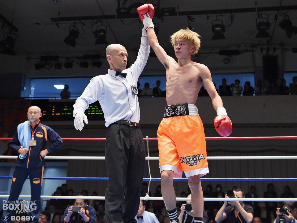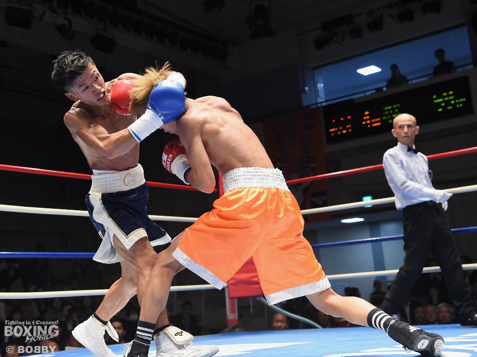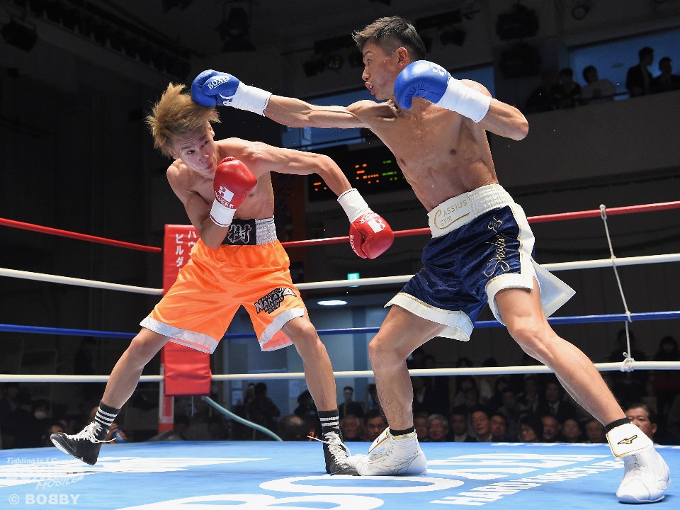 試合:5年半ぶりに復帰したサウスポーの王子がスピードのある右ジャブを突いて間合いを測ると、臼井も落ち着いてタイミングを計り、打ち終わりに右を狙った。この右は振り抜き過ぎて王子に見極められたが、ステップバックが速く王子の左ストレートも空を切った。2回、王子は右サイドにステップインしては左を狙うが、思うように踏み込めず。だが、3回1分過ぎに狙いすました左が決まり臼井からダウンを奪った。この回終盤にも左で臼井の顔を跳ね上げた王子は、最終4回も右ジャブであおりながら左カウンターを狙ったが、最後の1分を切ったところで左を引っかけられダウン。これでダウンポイントはイーブンとなり、打って出た王子だが時間切れ。判定の結果、ジャッジ2者の支持を得た臼井が接戦を制し、2勝目を挙げた。