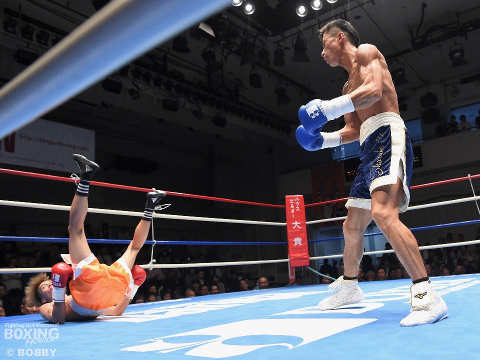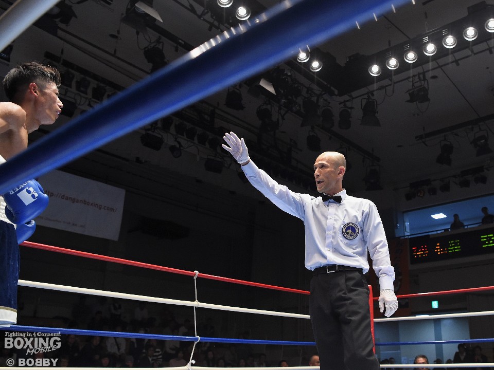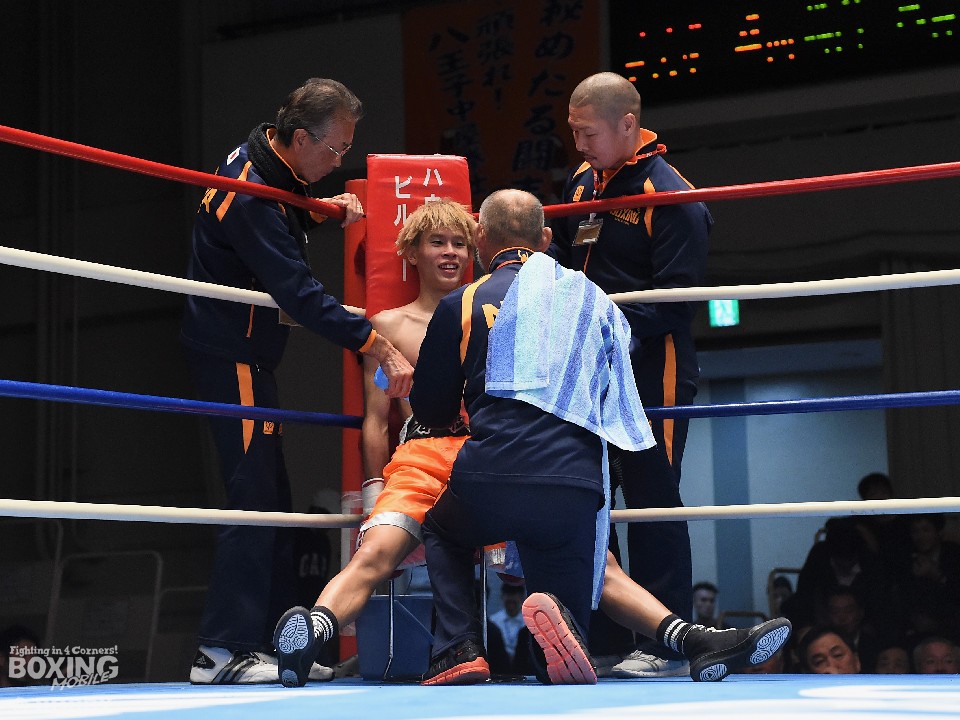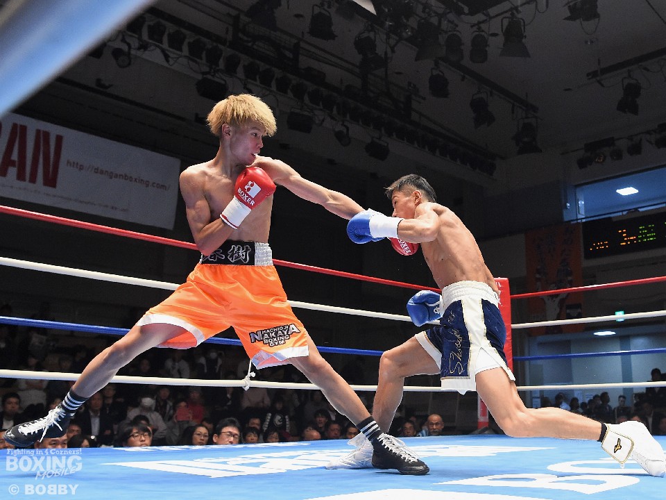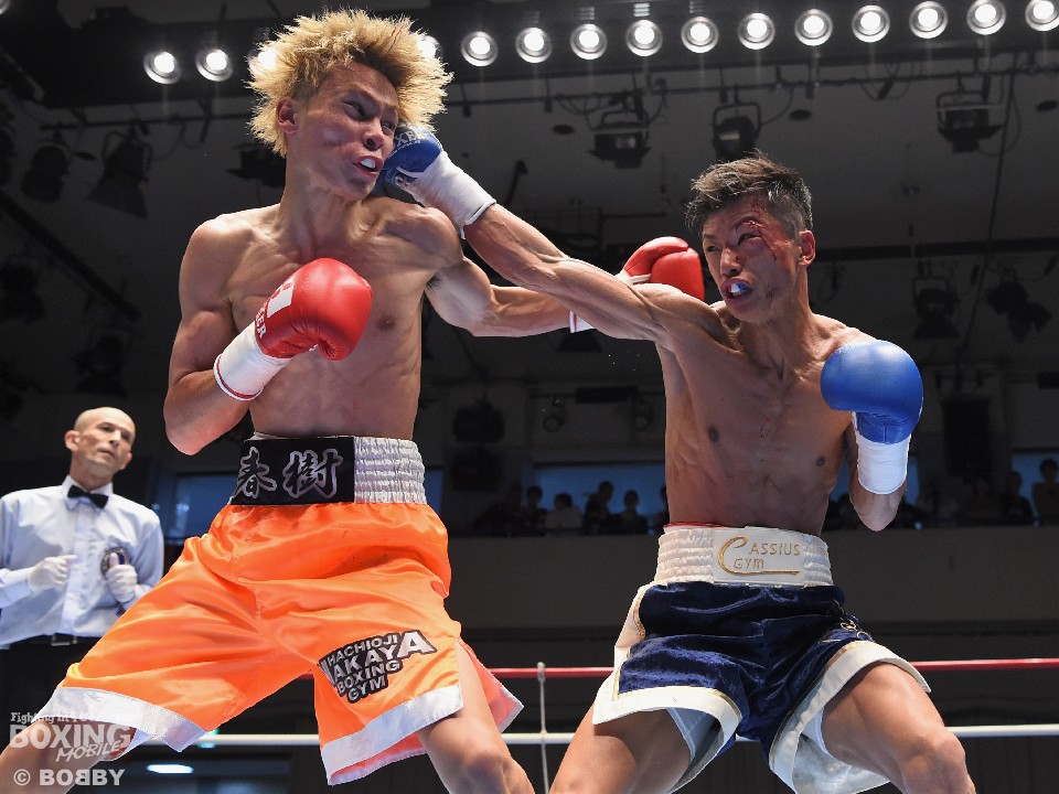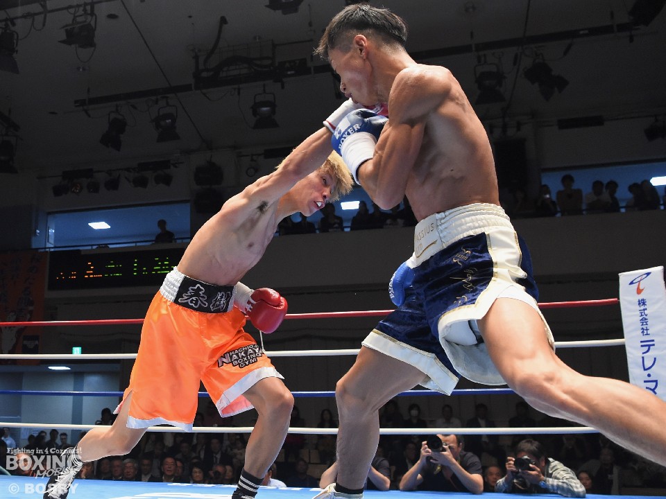 試合:5年半ぶりに復帰したサウスポーの王子がスピードのある右ジャブを突いて間合いを測ると、臼井も落ち着いてタイミングを計り、打ち終わりに右を狙った。この右は振り抜き過ぎて王子に見極められたが、ステップバックが速く王子の左ストレートも空を切った。2回、王子は右サイドにステップインしては左を狙うが、思うように踏み込めず。だが、3回1分過ぎに狙いすました左が決まり臼井からダウンを奪った。この回終盤にも左で臼井の顔を跳ね上げた王子は、最終4回も右ジャブであおりながら左カウンターを狙ったが、最後の1分を切ったところで左を引っかけられダウン。これでダウンポイントはイーブンとなり、打って出た王子だが時間切れ。判定の結果、ジャッジ2者の支持を得た臼井が接戦を制し、2勝目を挙げた。