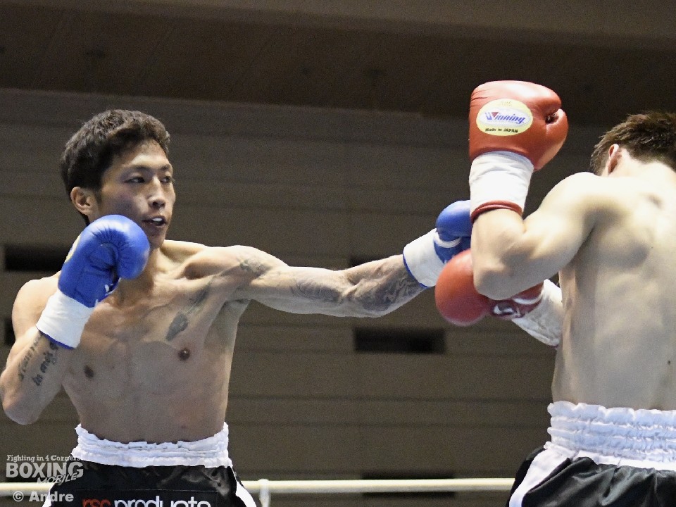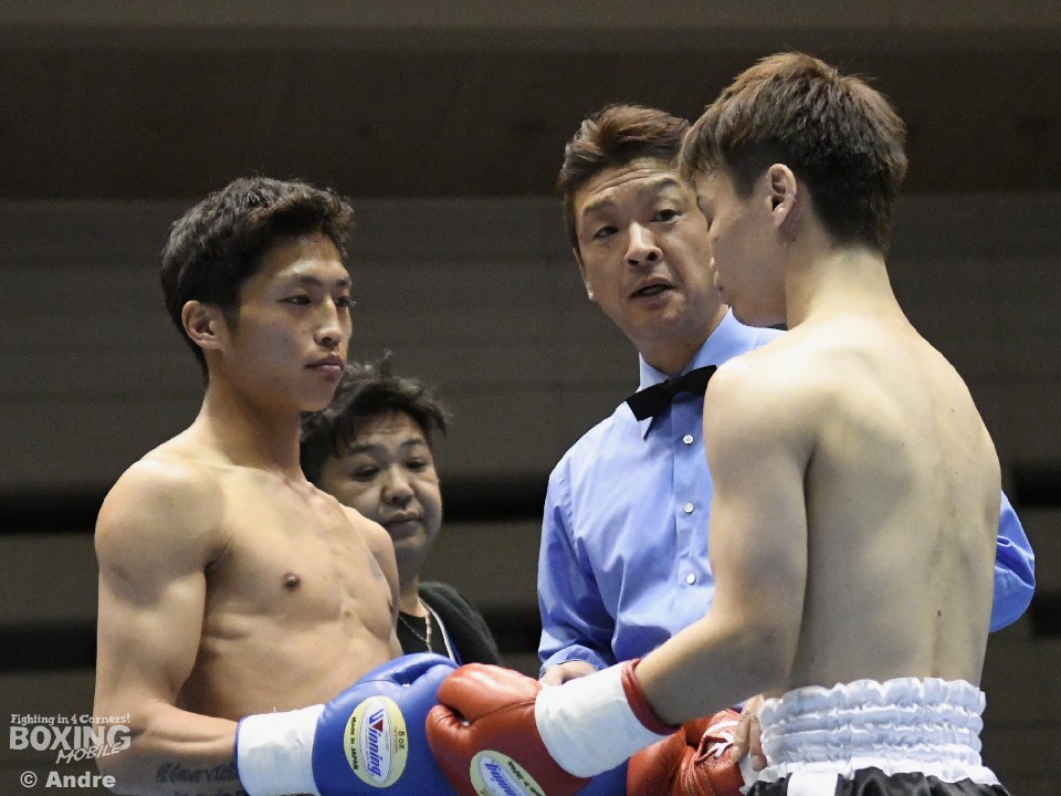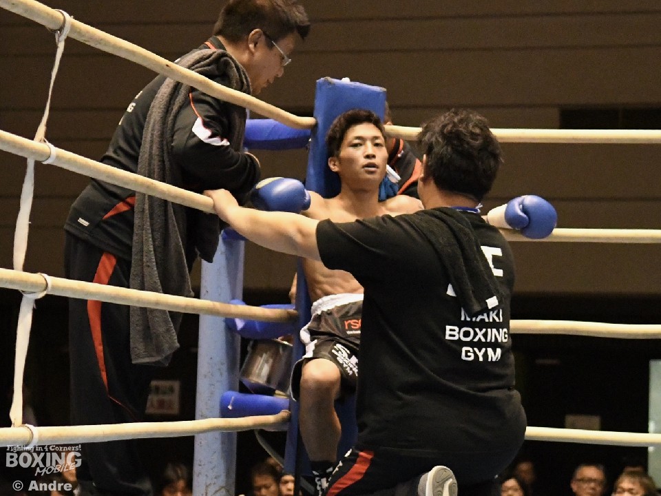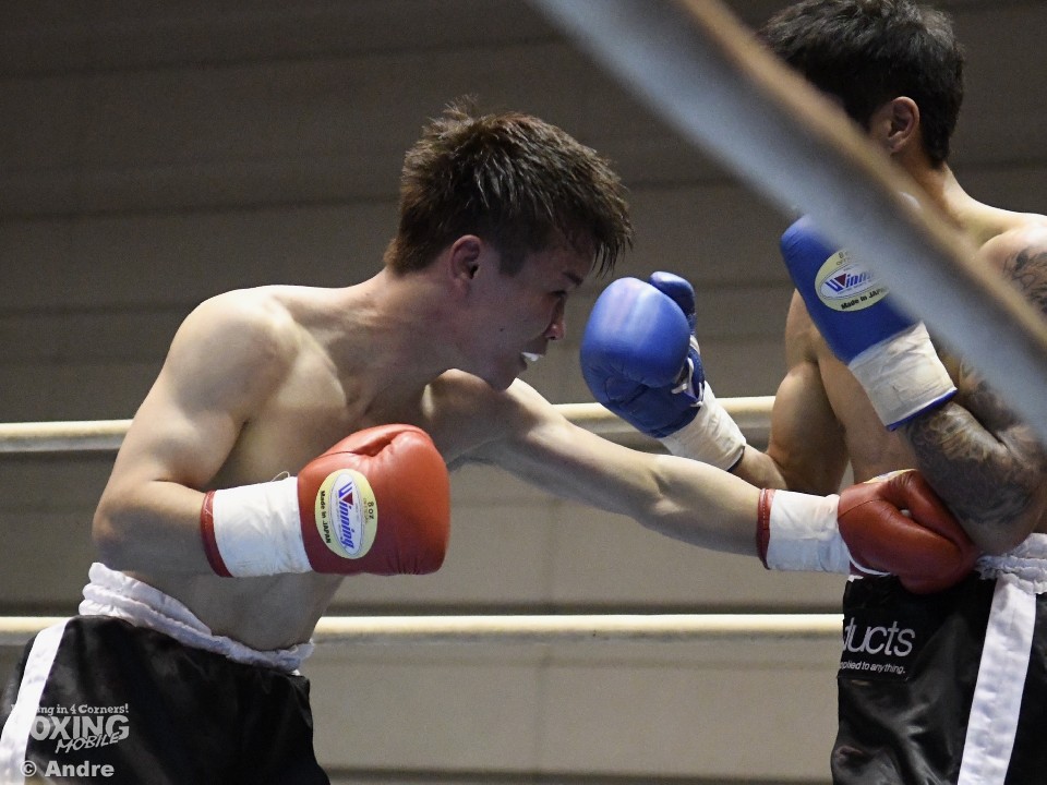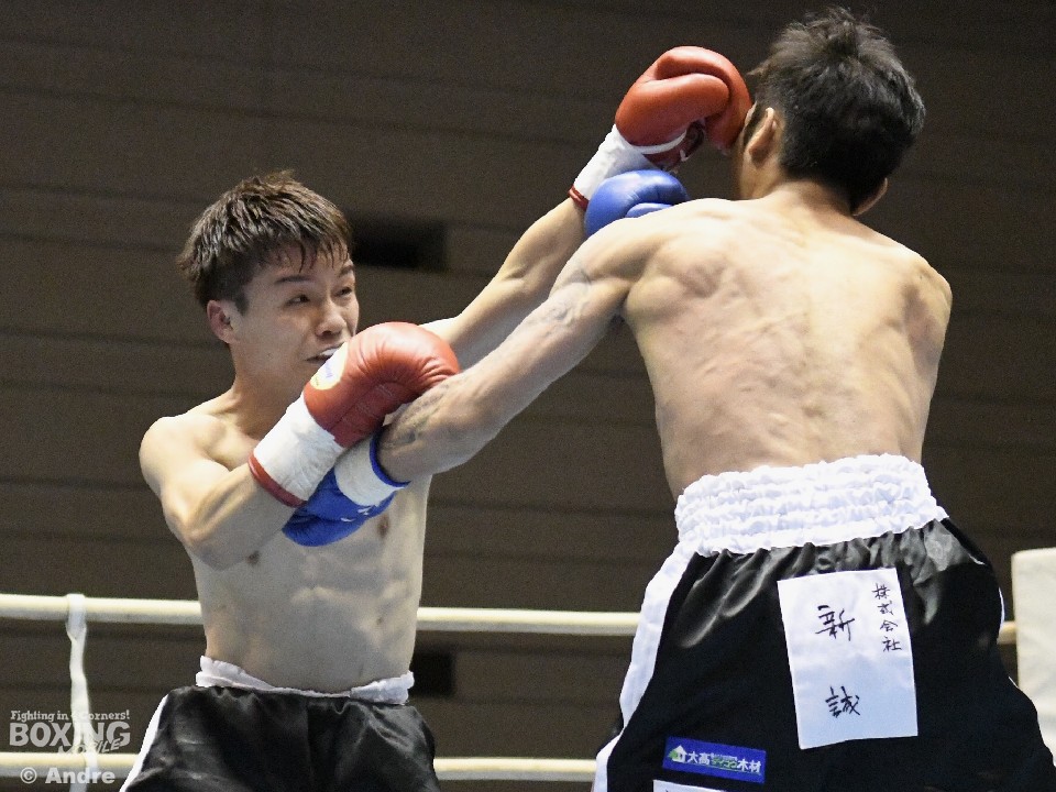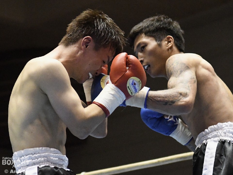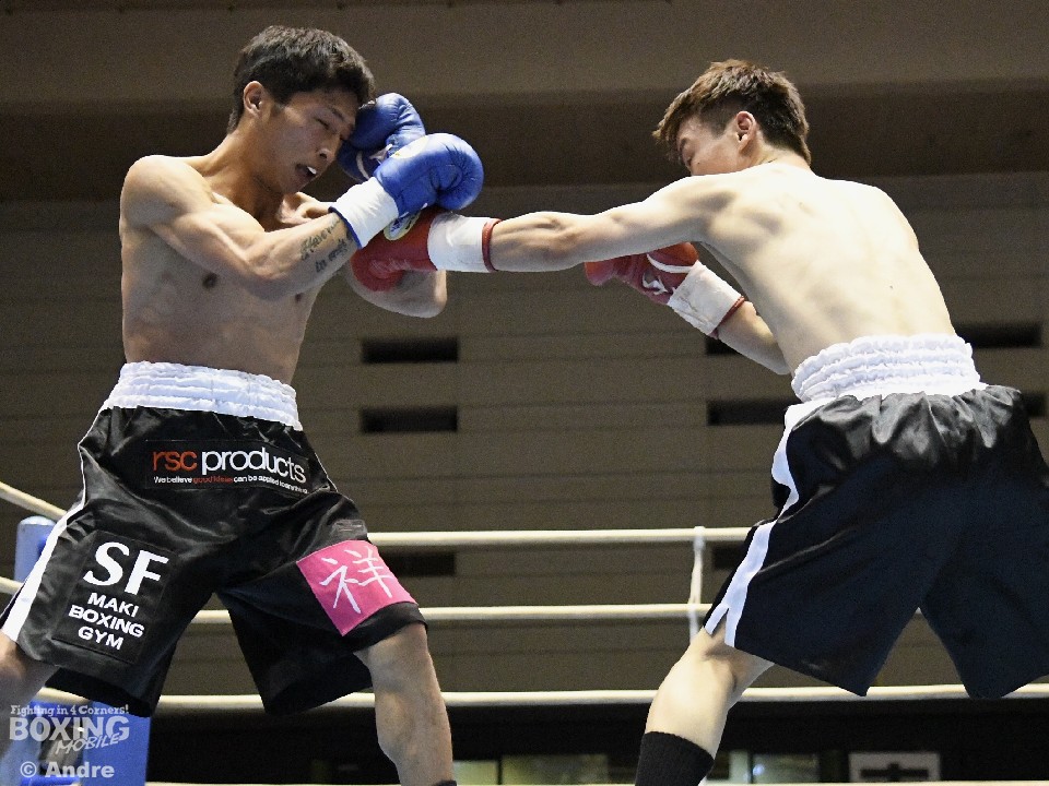 試合: エフは接近してボディを狙う。対して、表は接近するエフに右アッパーで起こすと左右のフックを当てた。2ラウンド、表のフックが決まりエフがロープを背に防戦一方になるが表が決めきれず。最終ラウンド、リング中央で頭をつけボディ・アッパーと打ち合った両者だが決定打には至らず判定で表が勝利を収めた。