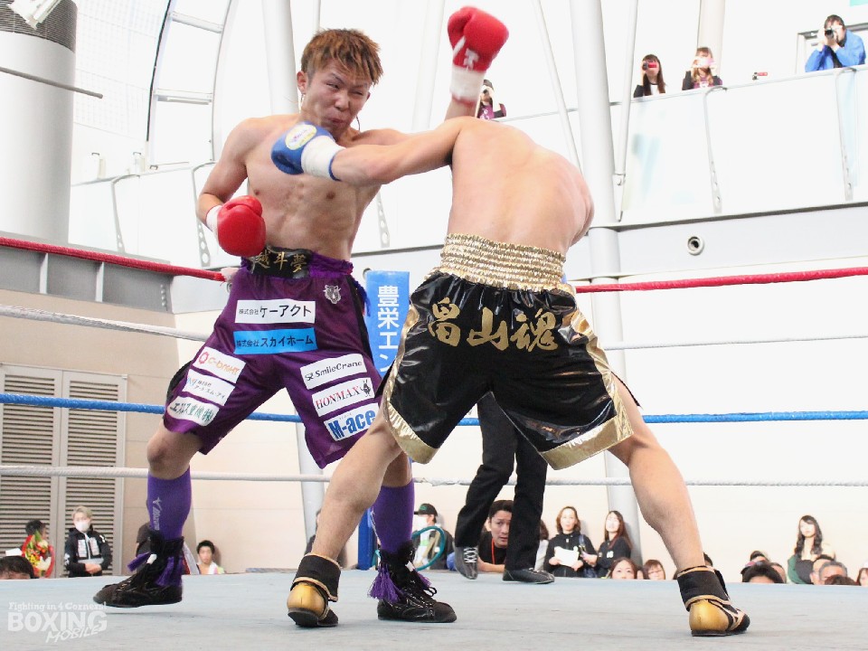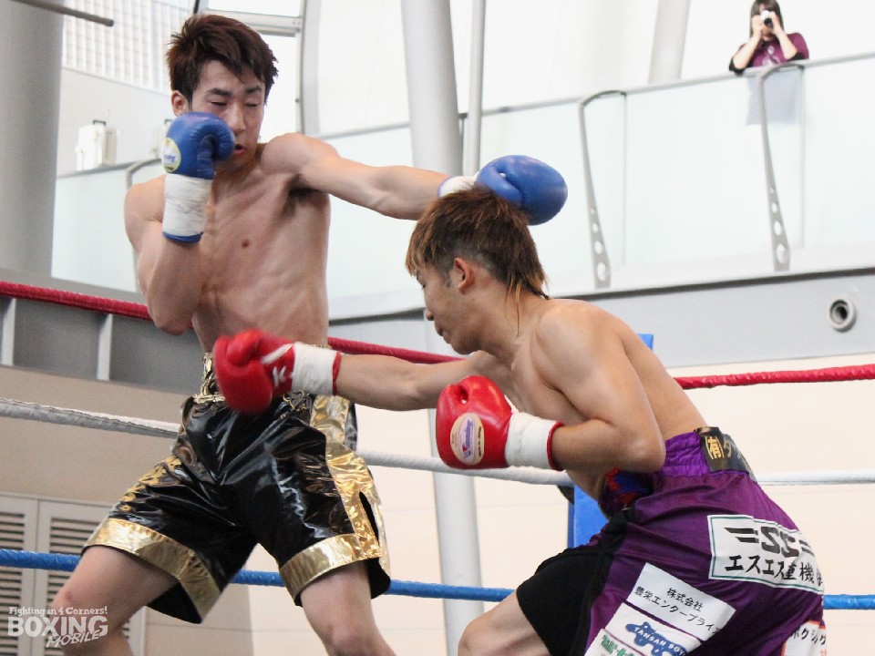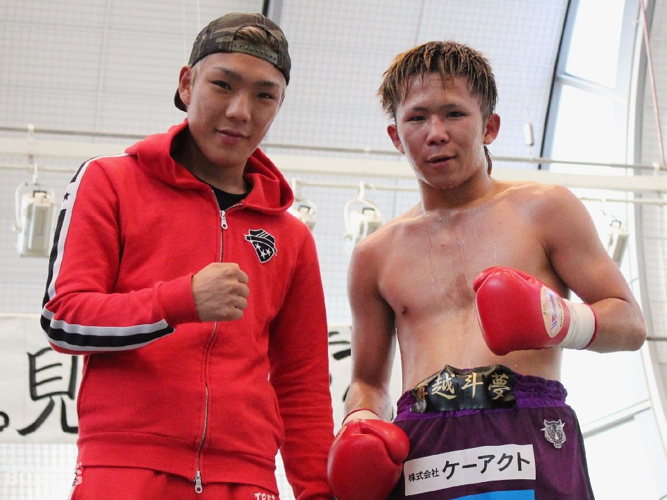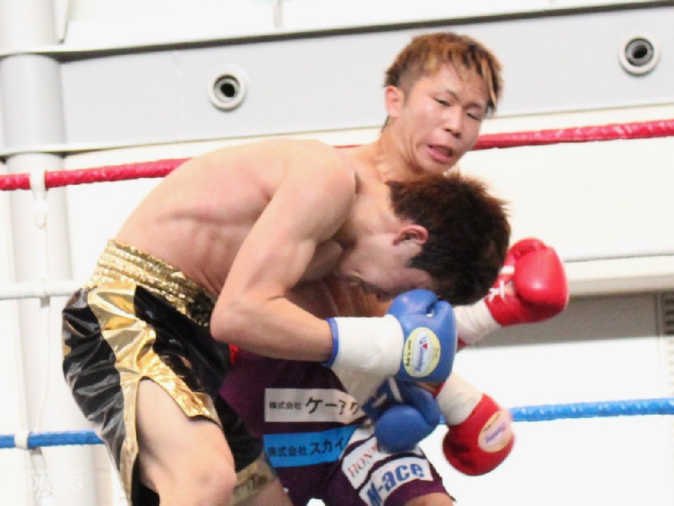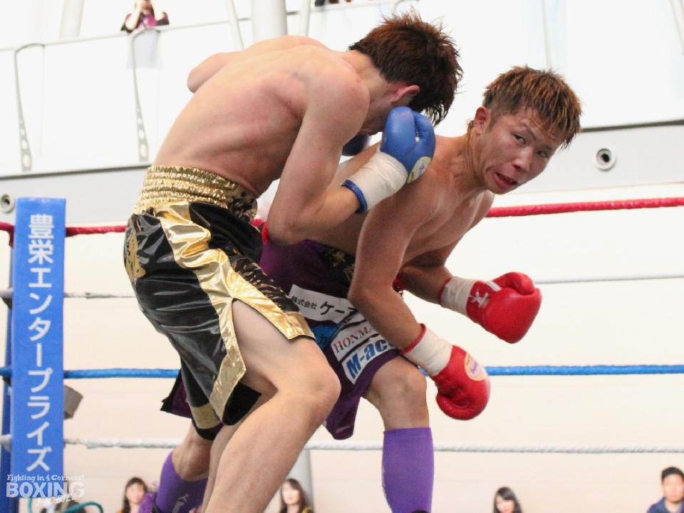 試合:前戦からわずか3週間後にリングに上がる溝越と北海道から参戦した東の対戦。初回、溝越が鋭い踏み込みから右フックで膝を揺らすと、スピードを活かした攻撃を仕掛ける。東はガードを固めながら好機を伺うが手数が少ない。2回、東はジリジリと距離を縮めワンツーを繰り出し反撃。3回、東は積極的な攻撃を見せてワンツーを好打。溝越は足を使いながら打ち終わりに右を合わせ一進一退の攻防を繰り広げた。4回、強気の姿勢で手数を増やす東に、溝越は右フックを合わせ攻勢をアピールした。