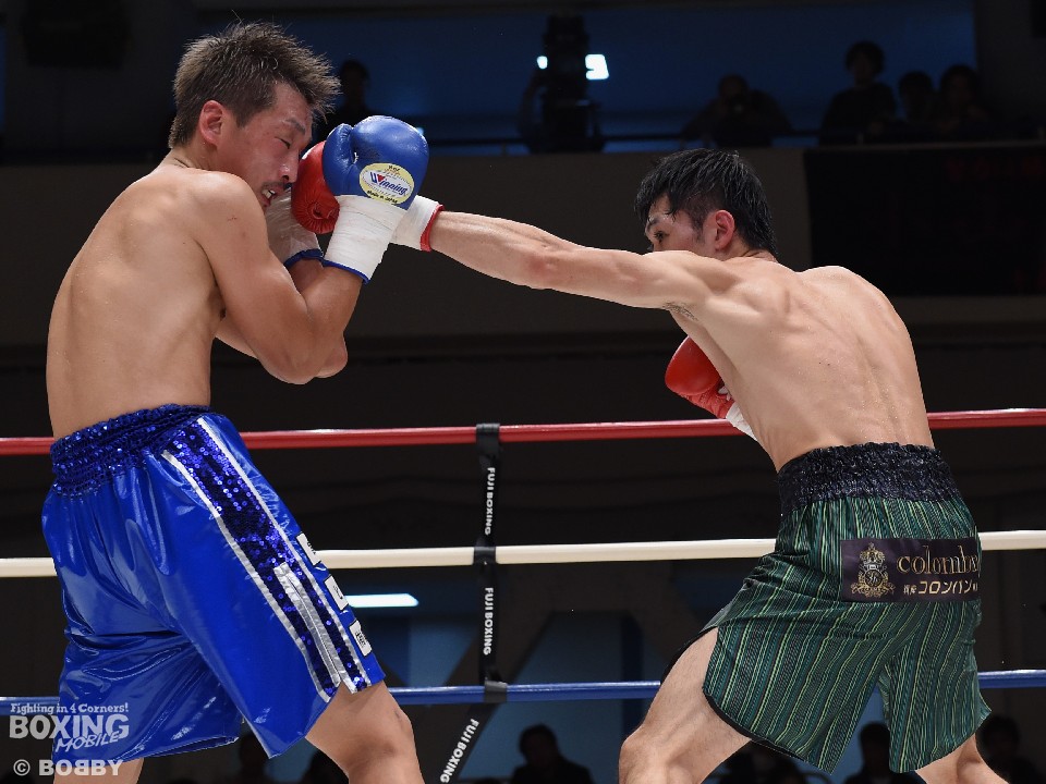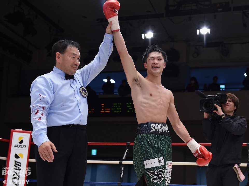 試合:4連勝中の佐川が広めのスタンスから前の手であおりながら右で仕掛けると、OPBF王座挑戦からの再起戦となるサウスポーの河村も右ジャブで距離を測り、速い左ストレートで対抗。河村はここからジリジリと前に出ると、佐川の右ボディストレートに左を返し右目を腫らせた。リズムを先に掴んだ河村は、2回も佐川の左右を外しては左を打ち込み、攻勢をアピール。絶妙な距離を保ち佐川の強打に対応したが、3回に入ると佐川が河村の正面を避け、強弱をつけた右で盛り返した。河村も相手にペースを渡さまいとペースを上げるが、打ちに行ったところでの被弾が目立つなど佐川の技術が上回りはじめた。4回終盤に右を効かされピンチとなった河村は、続く5回も佐川を追い立てながら有効打で上回られ、6回に入ると足が止まり失速。佐川のワンツーを防ぎきれなくなったが、ダウンを拒否してはジャブ、左フックを返し最終8回まで食らいついた。終盤は打たれてもなお前に出る気持ちの強さを見せたが、最後はパンチをまとめられレフェリーストップ。佐川が6勝目を挙げた。