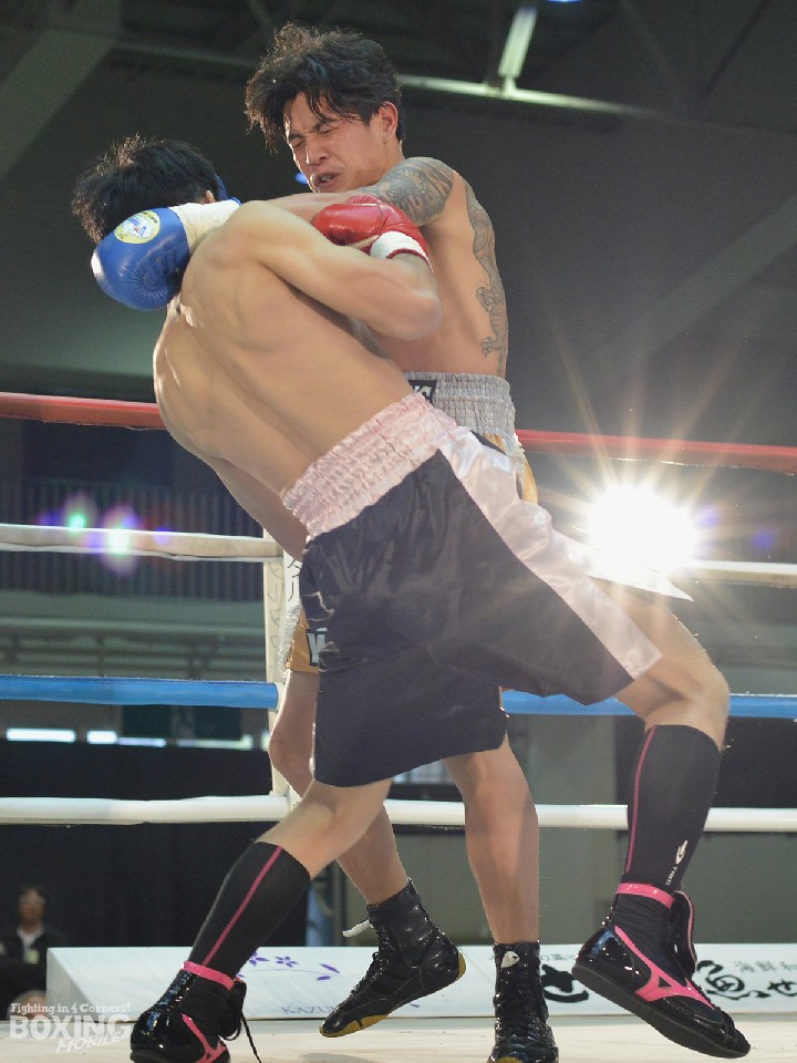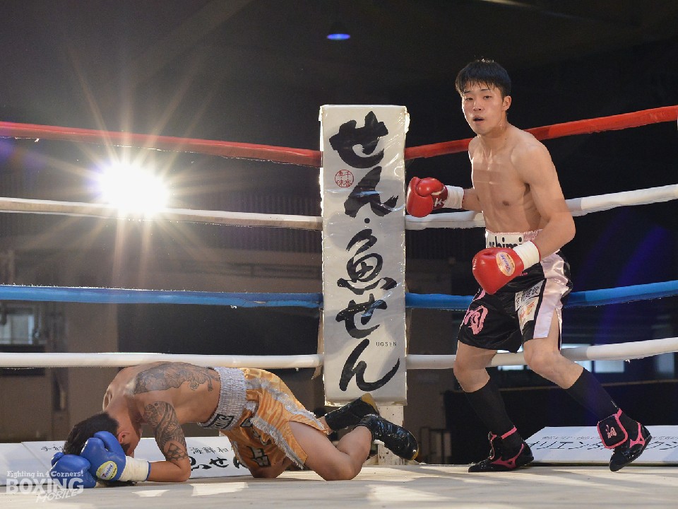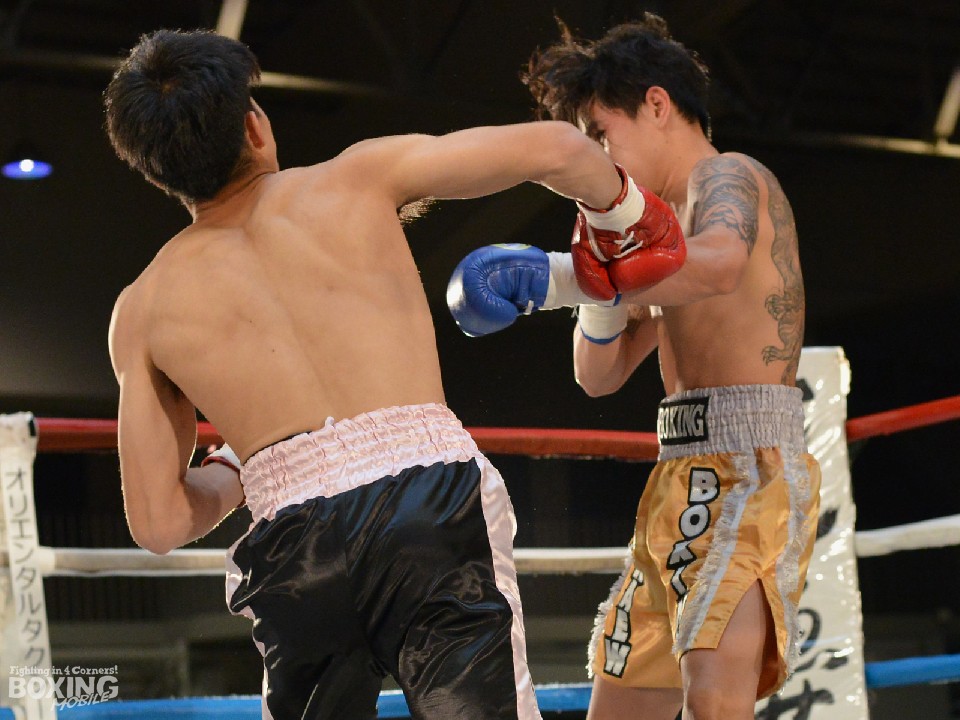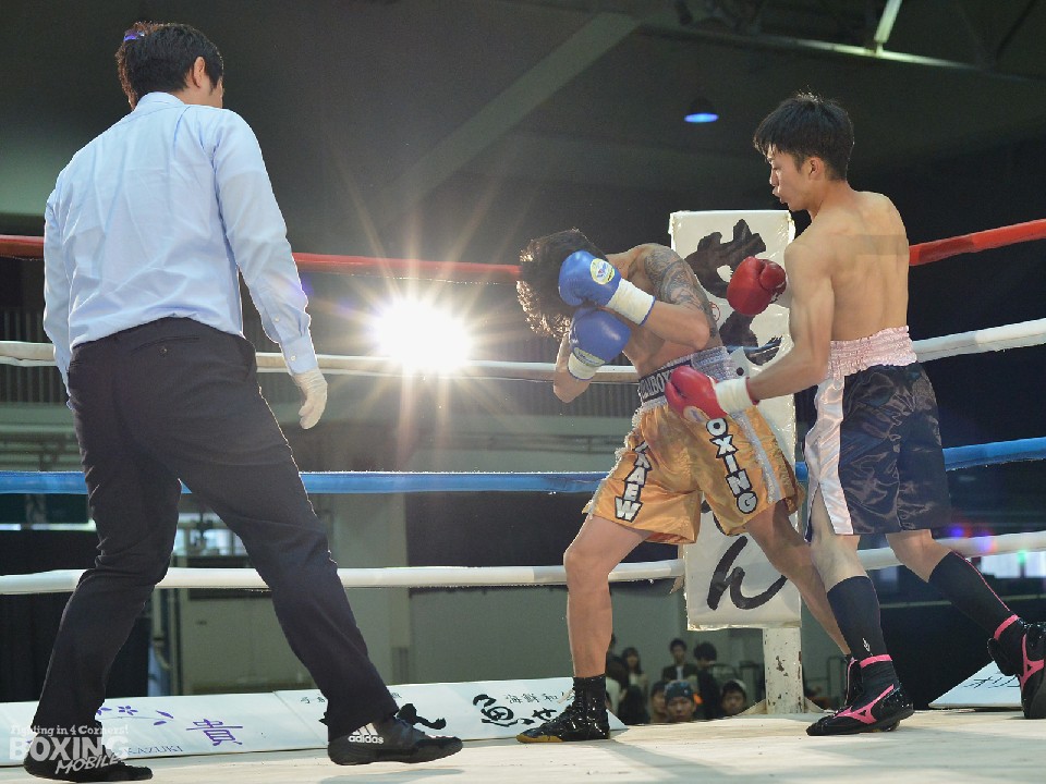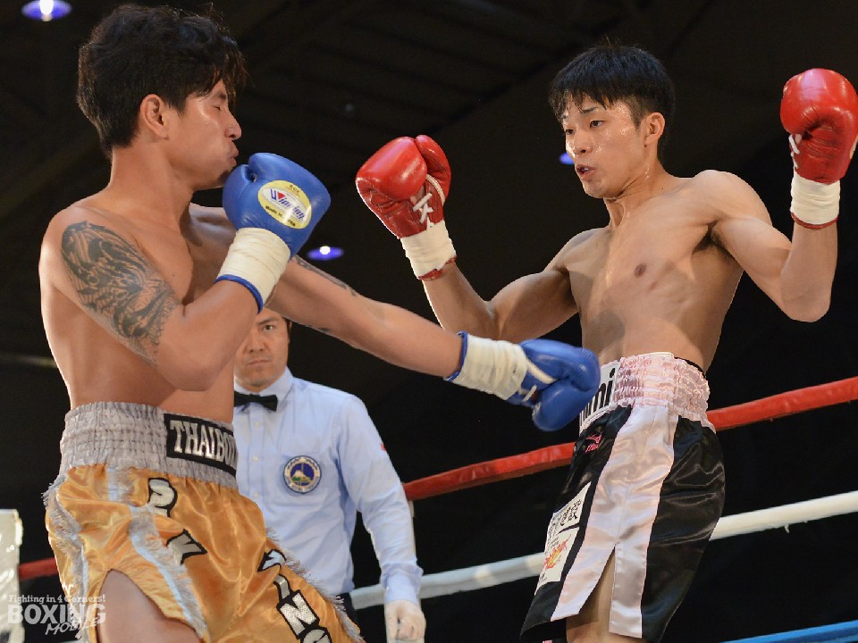 試合:水上が速く力強いジャブで口火を切ると、長いワンツーを繰り出すタイ人との距離を意識しながら右を好打。するとここから怒涛の連打で追い込み、左ボディでダウンを奪った。立ち上がったソラサックだが、再開後も水上の左右を防ぎ切れないままキャンバスに崩れ落ちた。