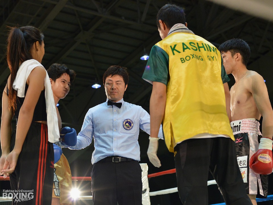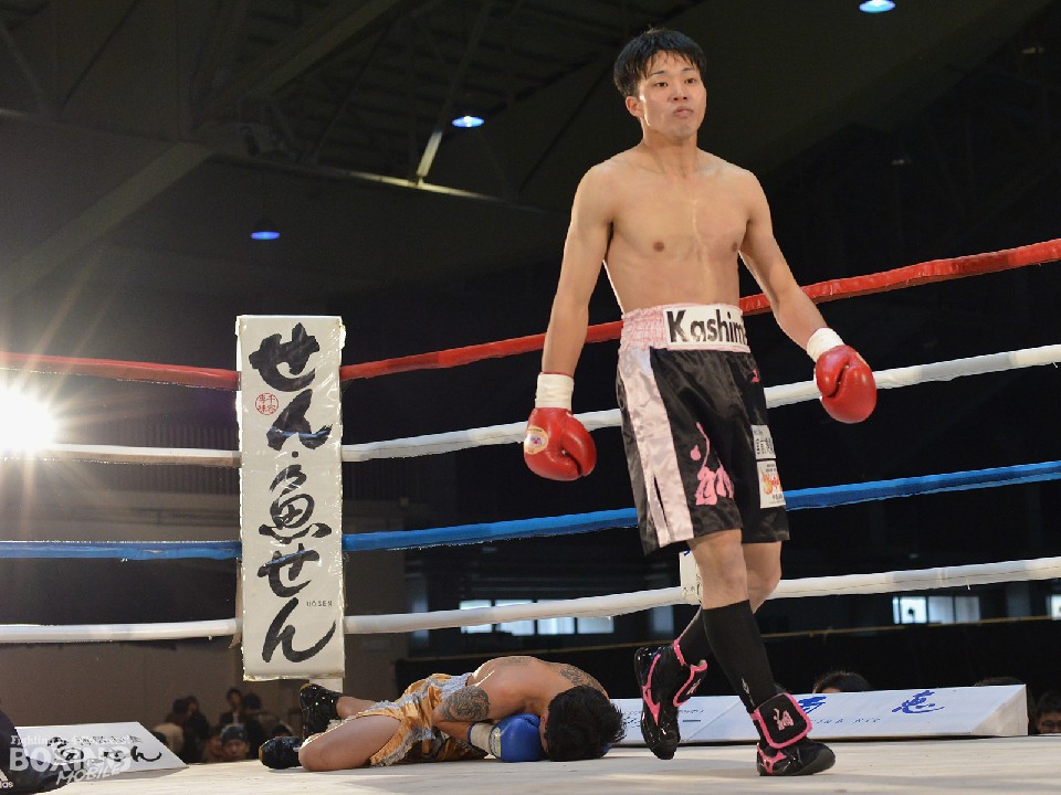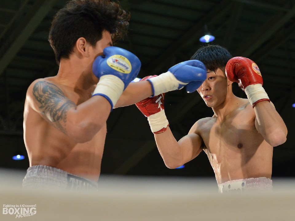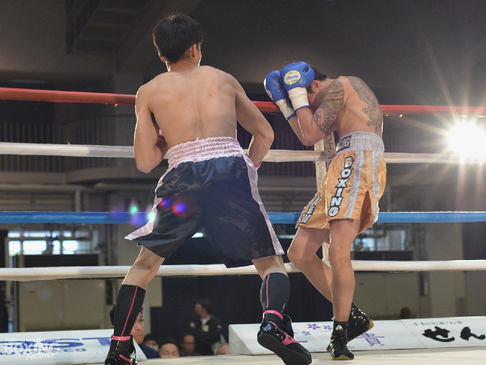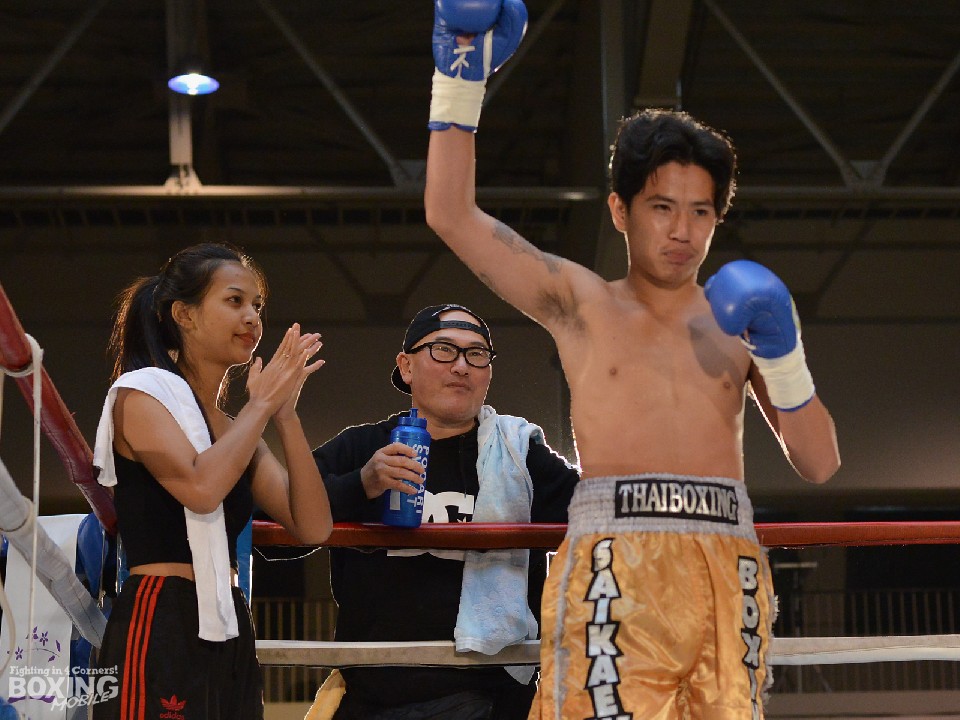 試合:水上が速く力強いジャブで口火を切ると、長いワンツーを繰り出すタイ人との距離を意識しながら右を好打。するとここから怒涛の連打で追い込み、左ボディでダウンを奪った。立ち上がったソラサックだが、再開後も水上の左右を防ぎ切れないままキャンバスに崩れ落ちた。