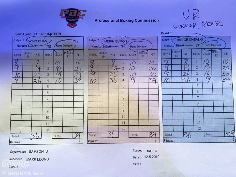 試合:先手必勝と言わんばかりにダッケルが勇猛なフックを振って攻めかかると、鈴木は初回から何度も被弾してしまう。その圧力で開始1分に、たまらずダウン。再開後の鈴木はストレート系の丁寧なインサイドブローで立て直そうとしたが、ダッケルのフックはそれを凌駕する的中率とパワーを備えていた。最終回は足を使うダッケルを鈴木が何度か捕まえ、連打を浴びせる中で終わったので、鈴木に唯一、ジャッジが優勢をつけた回となった。