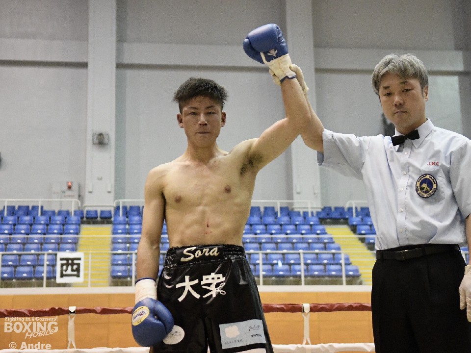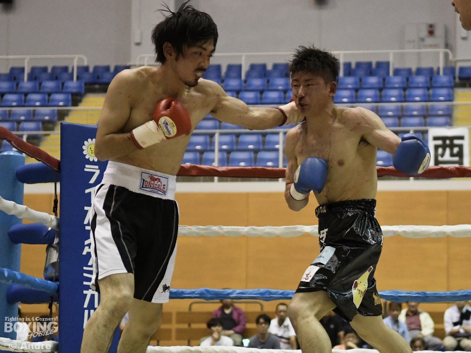試合: ジャブを上下に散らす野々口に対して、福永はガードを固め左右のフックを強振した。1ラウンド終盤、福永の左フックで野々口がダウン。ジャブで立ち直りを見せる野々口だが、タイミング良く踏み込む福永がヒットを重ねる。3ラウンド、またも福永の左フックが決まり野々口が2度目のダウン。最終ラウンド、意地の攻めを見せた野々口だが逆転には至らず。判定で福永が勝利を収めた。