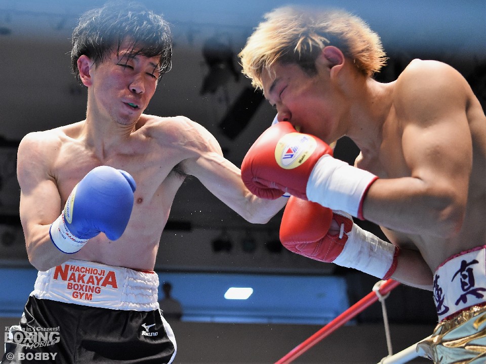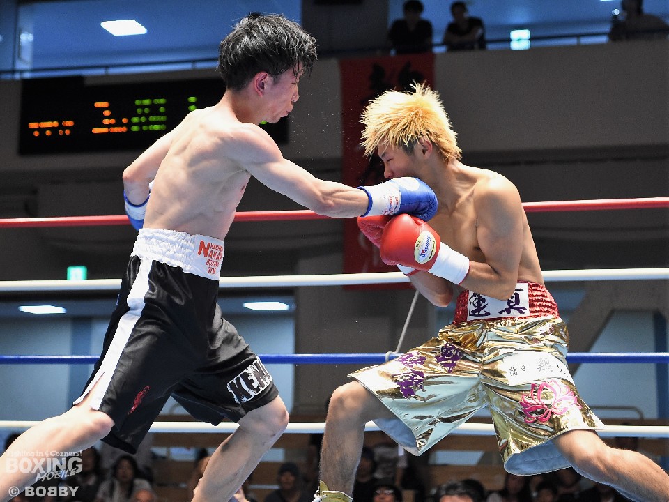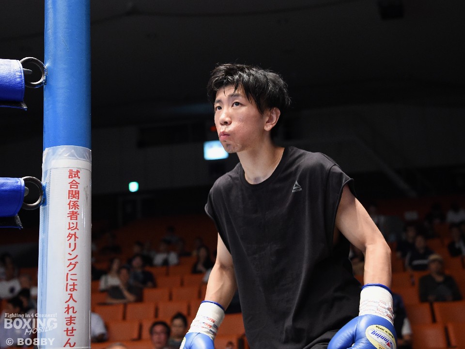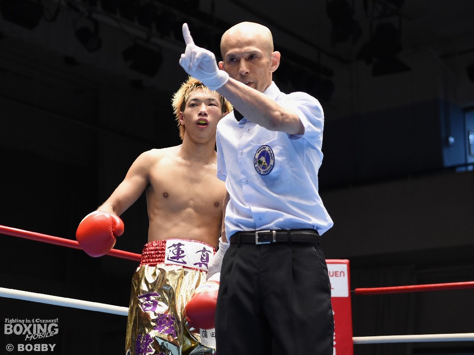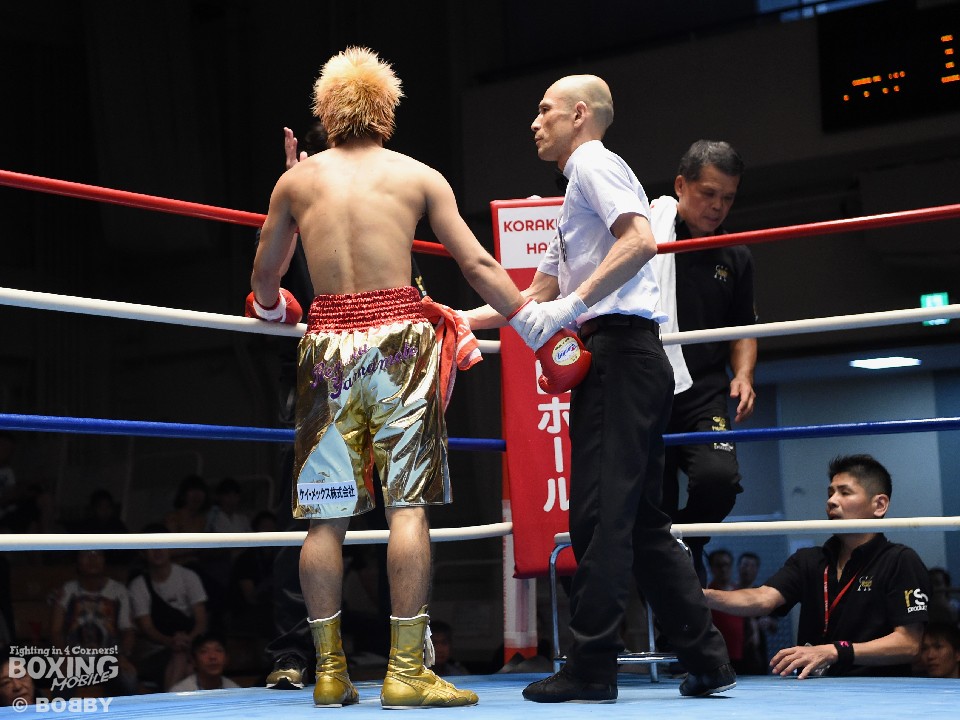 試合:サウスポーの山本がフットワークを活かし、距離を潰してボディを叩く初鹿を右フック、左ストレートで迎え撃ちスタート。山本も好戦的に打ち合いバッティングが目立ったが、右フックで上手く回し、序盤の主導権を握った。2回、2度のドクターチェック後、両者のペースはさらに上がるが、故意に頭を当てにいったとして山本に減点1。この回、初鹿はチャンスとばかりにアタックし、右クロスを好打。対し、山本も左の強打を返すが、どうにも頭が前に出てしまい、続く3回もバッティングで減点を告げられた。その後も山本のバッティングは直らず、ヒットでは上回るも、動きが鈍り左フックでダウン。カウント中にタオルが投入された。