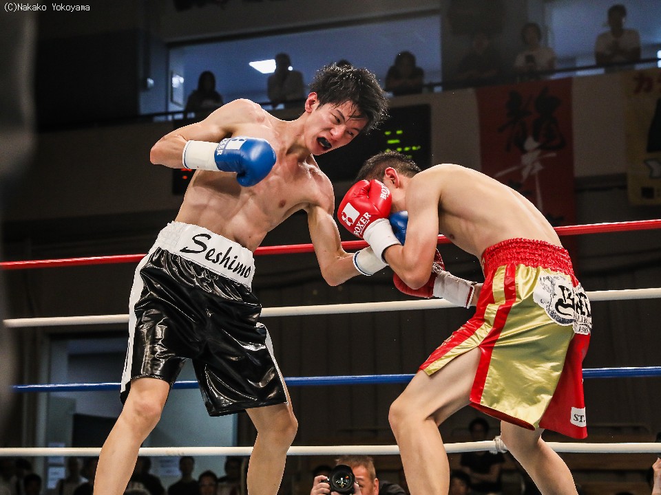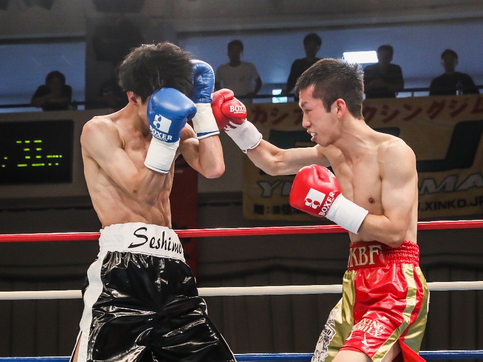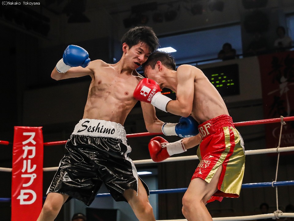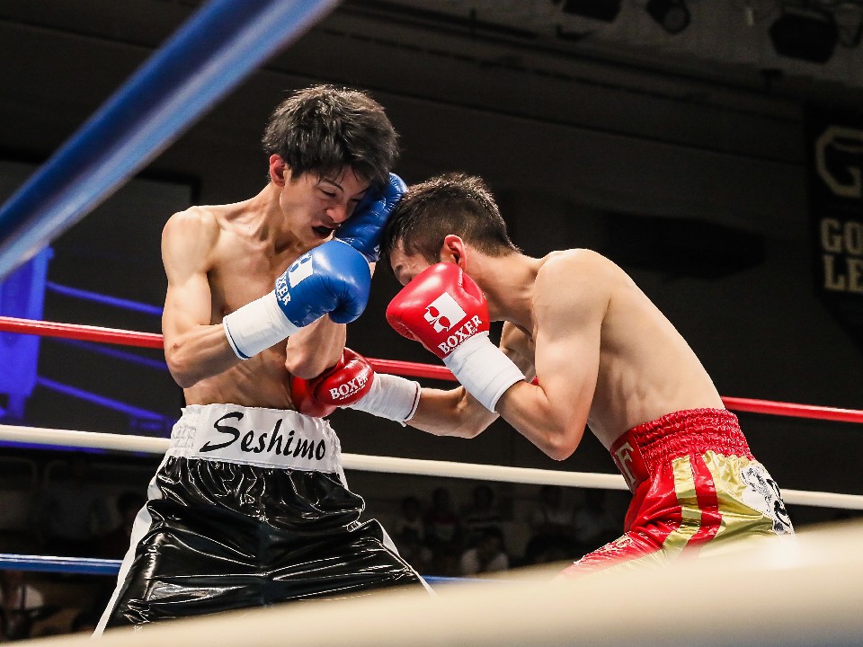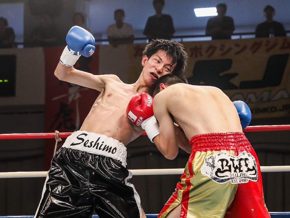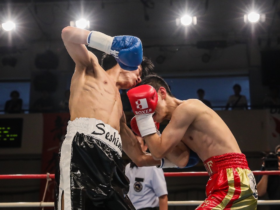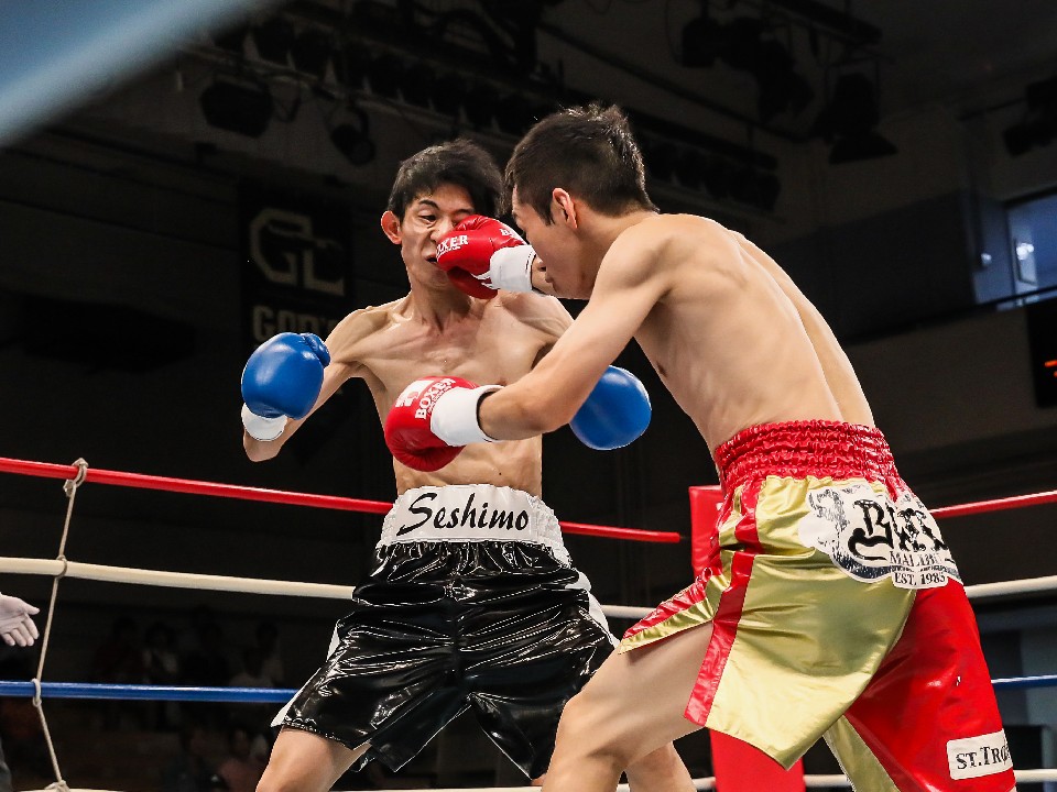 試合:ワンツーでプレスをかける瀬下だが、デビュー戦の青山に打ち終わりを狙われるとズルズルと後退。勢いづく青山はこのまま押し込みたかったが、瀬下に左ボディから打ち分けられ打撃戦に発展。2回も瀬下がワンツー、ボディで距離を潰し、青山が下がりながら左右フックを返す展開が続いたが、この回終盤に青山が右を好打しポイントをアピールした。逆に3回は瀬下が徹底した上下の打ち分けで上回り、最終4回は右ボディからストレートを効かせたが、青山も最後まで食らいつき互角のファイトでゴング。ジャッジ1者はドローとしたが、2者が瀬下を支持した。