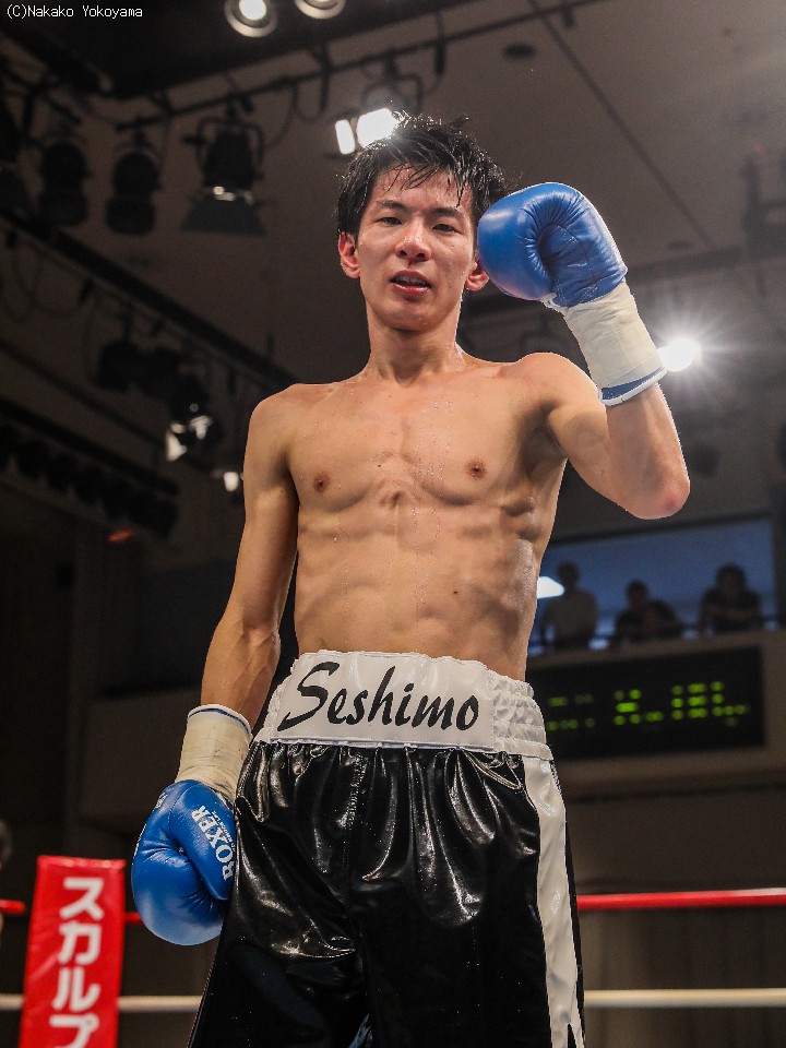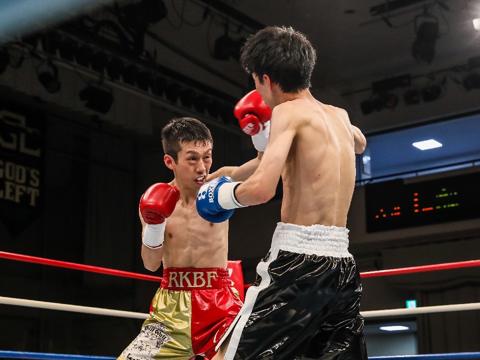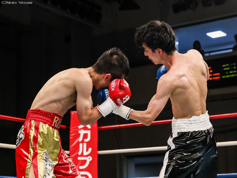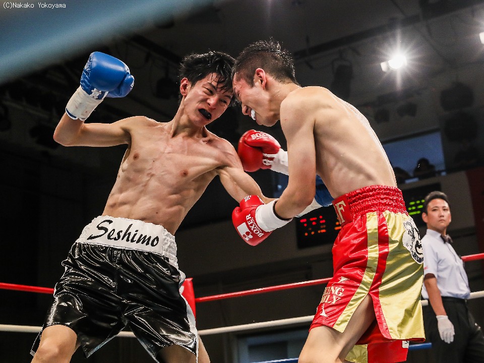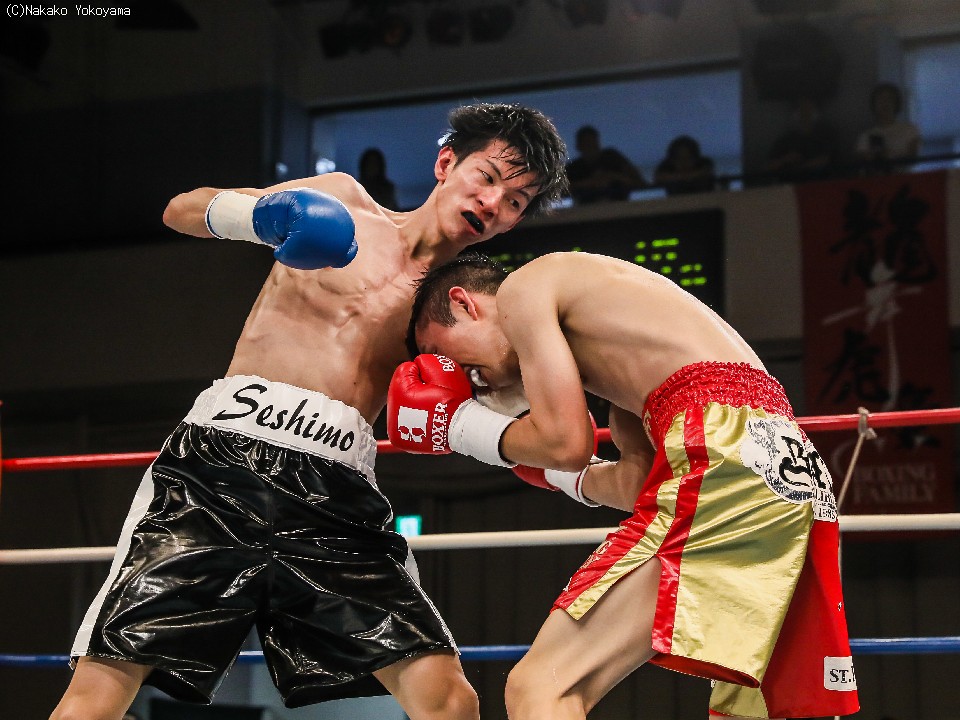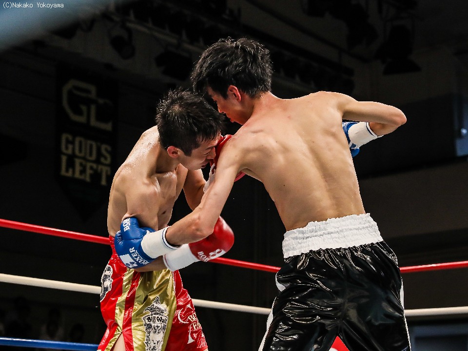 試合:ワンツーでプレスをかける瀬下だが、デビュー戦の青山に打ち終わりを狙われるとズルズルと後退。勢いづく青山はこのまま押し込みたかったが、瀬下に左ボディから打ち分けられ打撃戦に発展。2回も瀬下がワンツー、ボディで距離を潰し、青山が下がりながら左右フックを返す展開が続いたが、この回終盤に青山が右を好打しポイントをアピールした。逆に3回は瀬下が徹底した上下の打ち分けで上回り、最終4回は右ボディからストレートを効かせたが、青山も最後まで食らいつき互角のファイトでゴング。ジャッジ1者はドローとしたが、2者が瀬下を支持した。