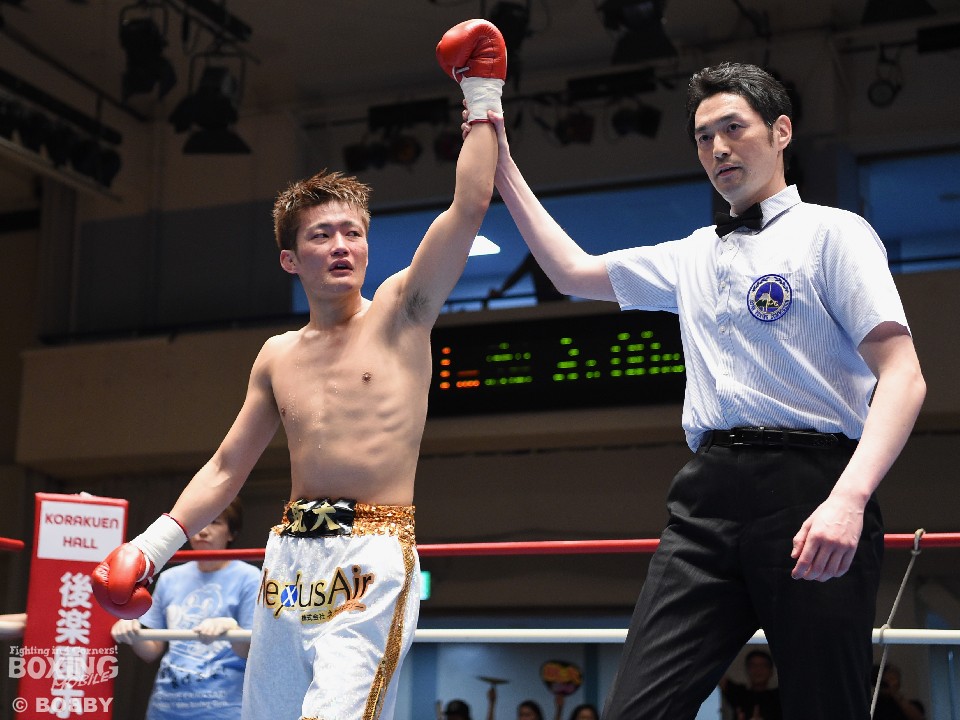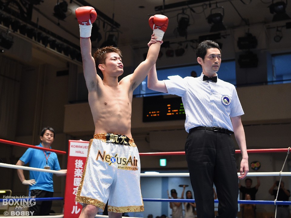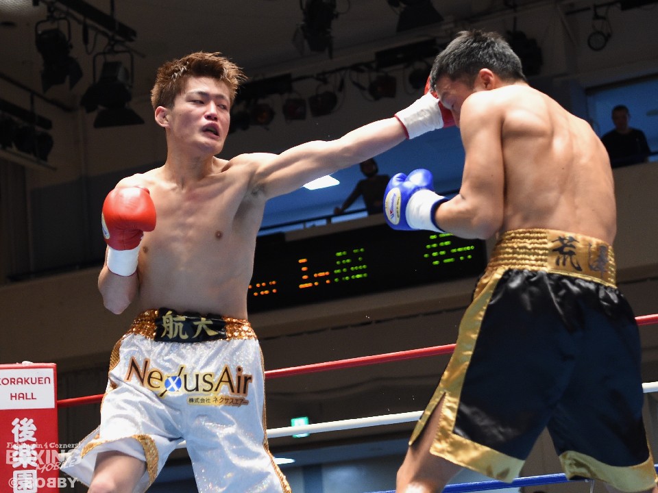 試合:意表をついて右から入る荒澤に対し、本多は重心を落とし距離を詰めると、左フック、右ストレートを効かせ荒澤を押し下げる。荒澤もバックステップを使い右ストレートで迎え撃つが、初回は本多のプレスが上回った。2回は荒澤がジャブで先手を取りワンツー連打で攻め込むが、ここも本多の強打が勝り、腰を落とした荒澤をレフェリーが救出。本多が2回TKO勝ちを飾り、東日本新人王準決勝進出を決めた。