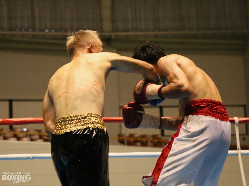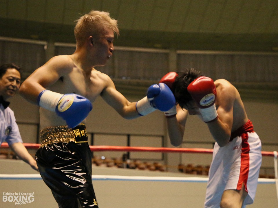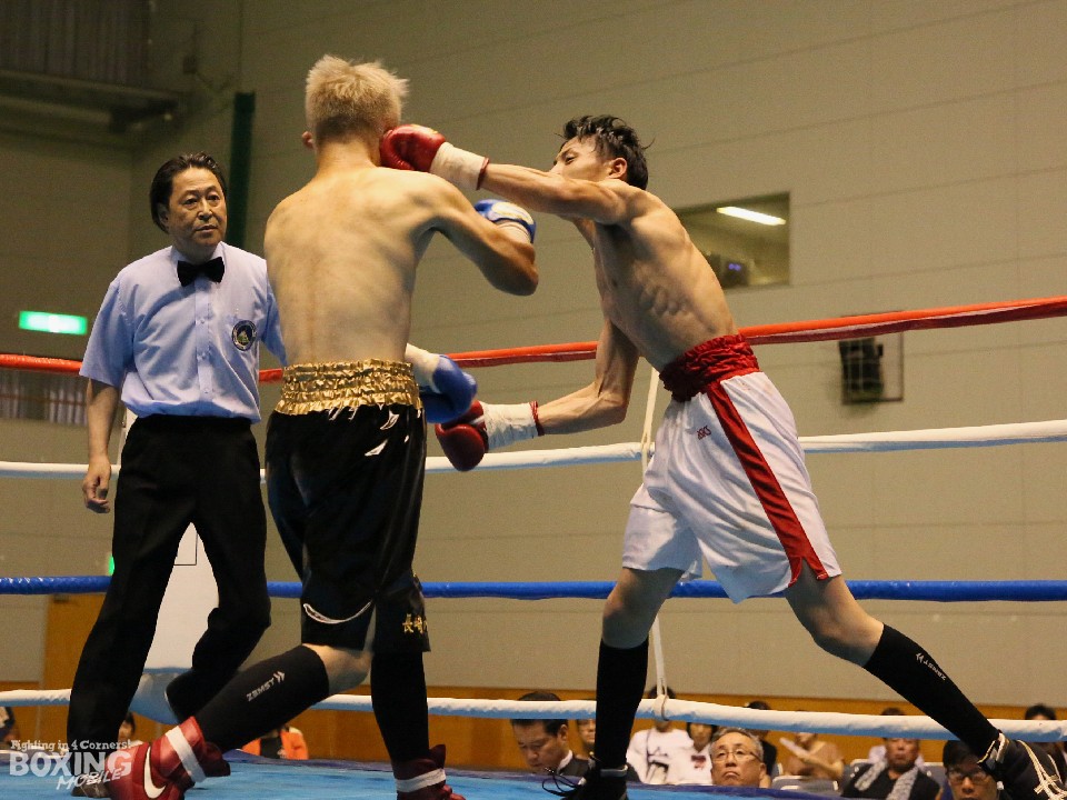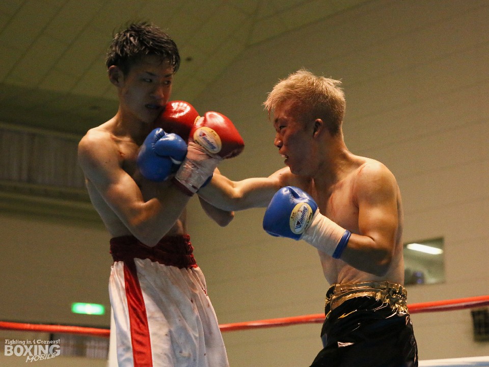 試合:サークリングで的を絞らせない山内に対し、カウンターを狙いながらプレスをかける岡田、序盤は互いに距離が噛み合わず。3回、打ち合いでペースを握った岡田が右ストレートでダウンを奪うが、最終回に入ると、スイッチを駆使した山内が左ストレートで一気に形勢逆転。ラストポイントを奪った。一進一退の攻防はダウンポイントがものをいい、ジャッジ3者の支持を得た岡田が判定勝利。