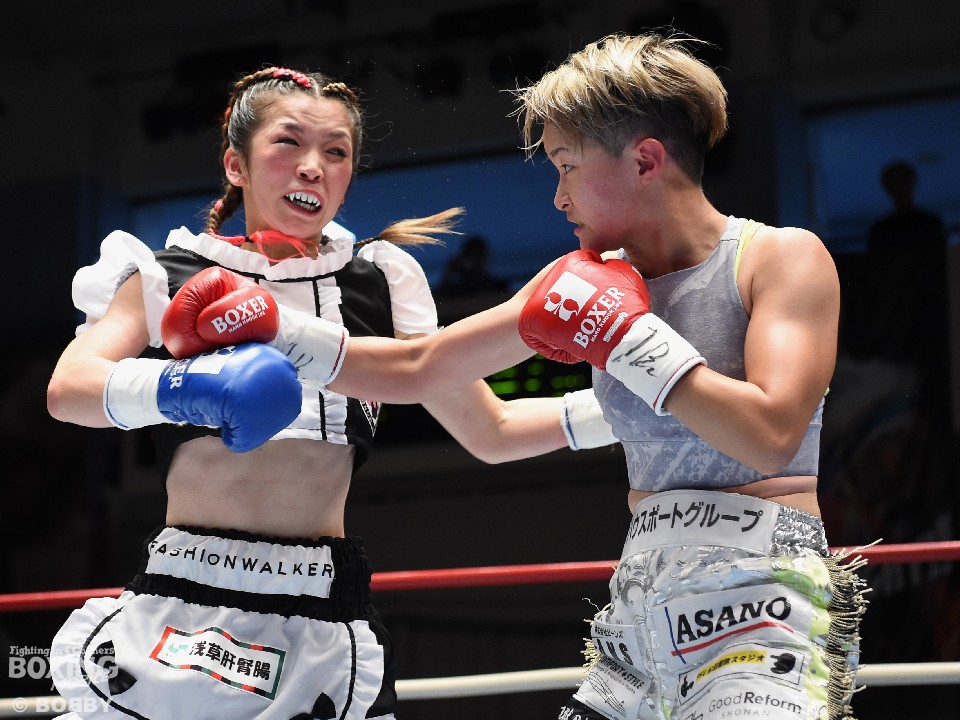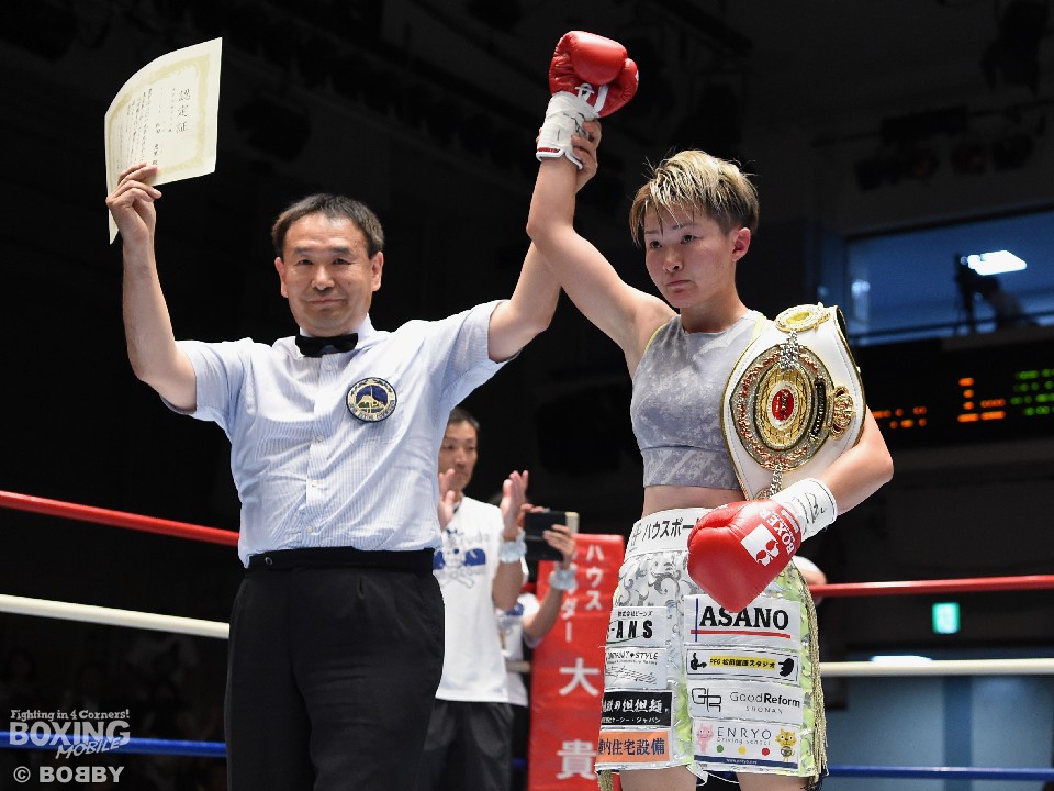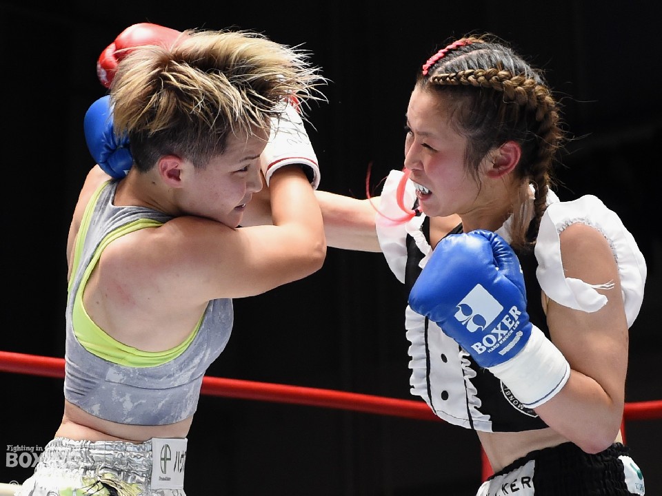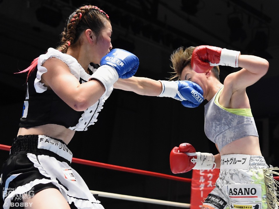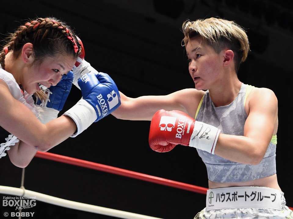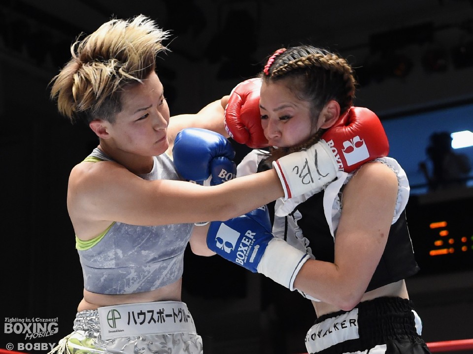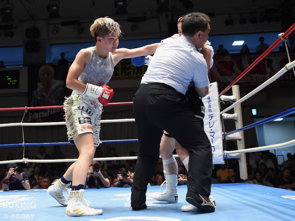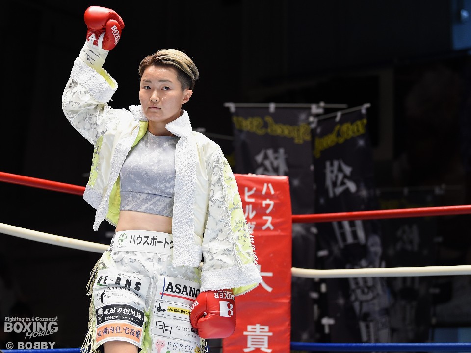 試合:2戦目でOPBFを、3戦目で日本王座を獲得したアマエリートの松田に8戦目のモンブランがアタック。タイトル初挑戦のモンブランはスタンスを広く取ると、開始からサウスポー王者にグイグイと圧力をかけ、右ストレート、右フックを好打し上々の立ち上がりを見せた。先手を取られた松田だが、2回はギアをトップスピードにチェンジ。フェイントを織り交ぜながら左ストレートを撃ち抜き、早くもモンブランの顔を腫らせた。モンブランもしつこく距離を潰し、接近戦に持ち込んではボディを効かせるが、離れ際で右フックの被弾も目立ち、回を追うごとにダメージが広がった。それでも激しくアタックをかけ、ボディから上に強打を返し続けたモンブランだが、5回終盤に右をカウンターで浴びダウン。ここは再開に応じたが、パンチをまとめられたところでレフェリーストップ。松田がTKO勝ちで日本王座の初防衛に成功した。