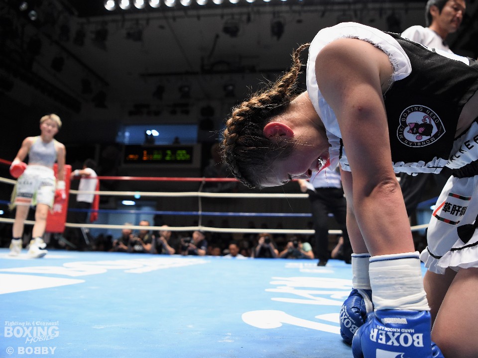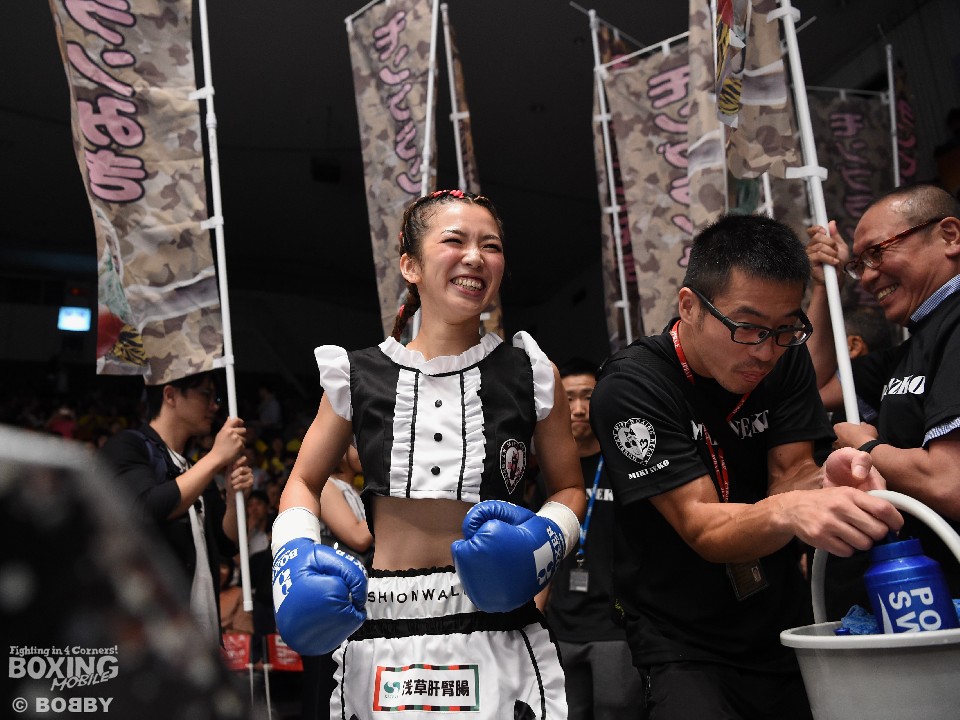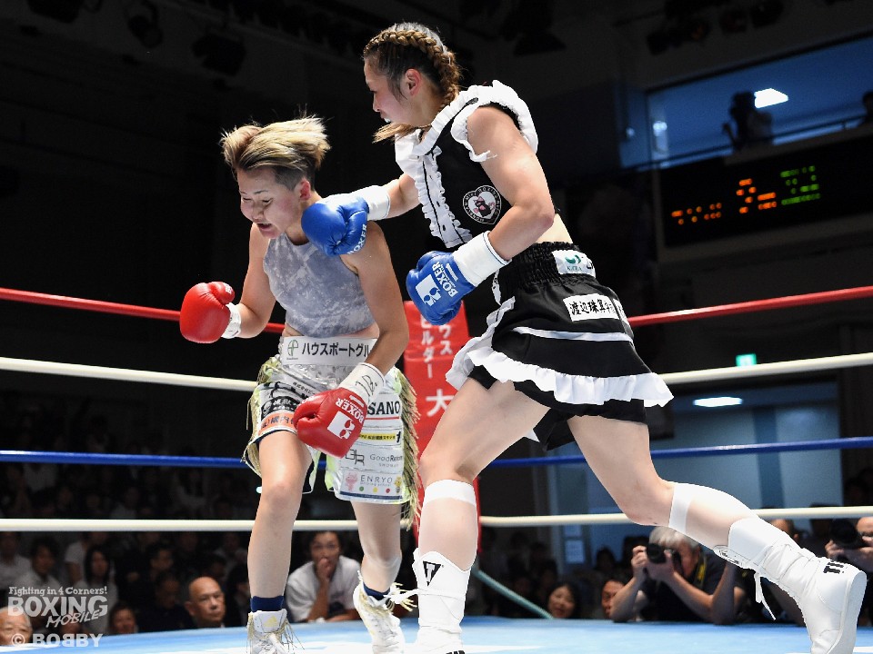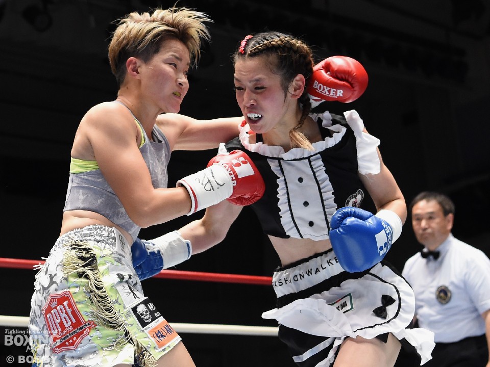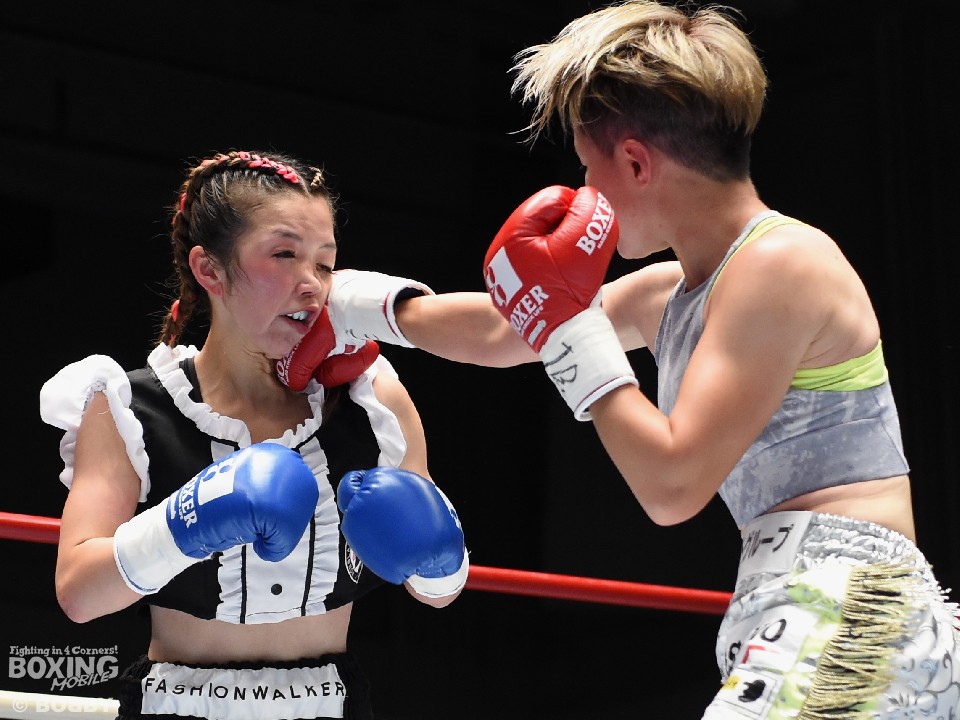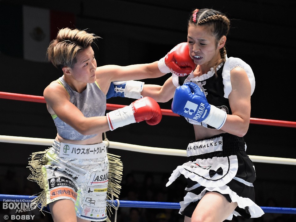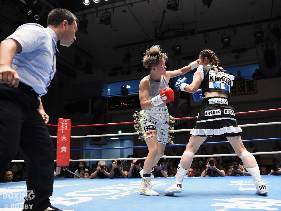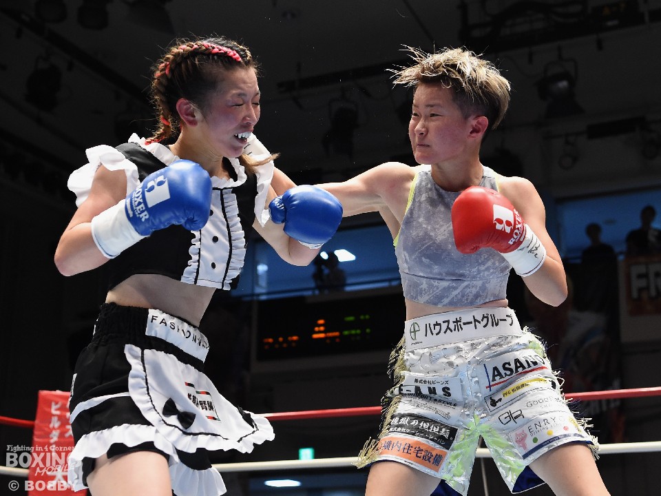 試合:2戦目でOPBFを、3戦目で日本王座を獲得したアマエリートの松田に8戦目のモンブランがアタック。タイトル初挑戦のモンブランはスタンスを広く取ると、開始からサウスポー王者にグイグイと圧力をかけ、右ストレート、右フックを好打し上々の立ち上がりを見せた。先手を取られた松田だが、2回はギアをトップスピードにチェンジ。フェイントを織り交ぜながら左ストレートを撃ち抜き、早くもモンブランの顔を腫らせた。モンブランもしつこく距離を潰し、接近戦に持ち込んではボディを効かせるが、離れ際で右フックの被弾も目立ち、回を追うごとにダメージが広がった。それでも激しくアタックをかけ、ボディから上に強打を返し続けたモンブランだが、5回終盤に右をカウンターで浴びダウン。ここは再開に応じたが、パンチをまとめられたところでレフェリーストップ。松田がTKO勝ちで日本王座の初防衛に成功した。