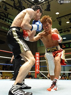 試合:両者ともに基本に忠実なボクシングを繰り広げる。離れてワンツー、近づけばショートアッパー、ボディ、序盤からさまざまなパンチを見せる。どちらかがボディを打てば片方もボディ、どちらかがアッパーを打てば…と手数は減らない。中盤も一進一退の攻防が続く。中間距離なら古家のワンツー、接近戦ならアッパーアッパーフ ックとしつこく攻める佐藤。最終ラウンド終了のゴングが鳴った瞬間の両者の笑顔が印象的な試合。