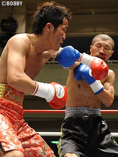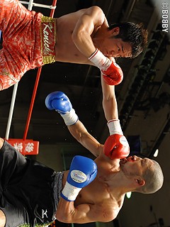 試合:身長差、リーチ差ともに優位とあってか、距離を詰め、果敢に仕掛けるサウスポーの岩崎。序盤、その距離感をはかりながら速いボディ、ストレートを打って出る山口。手数の多さでは岩崎だが、左右ボディ、ワンツーと単調になり、山口がその打ち終わりを狙い始める。ノーモーションの右、相手のパンチをカバーして左フックと どんどん山口の展開になりはじめ、中盤には足を使って完全に山口のリズム。7R後半、山口のワンツー、ボディにたまらず岩崎のマウスピースが飛び出る一幕も。最終ラウンド、相手のパンチをほとんど見切っている山口がコンパクトにたたみかけ、右ストレートで岩崎が後ずさりしたところをすかさず連打。そこでレフェリーが割って入った。