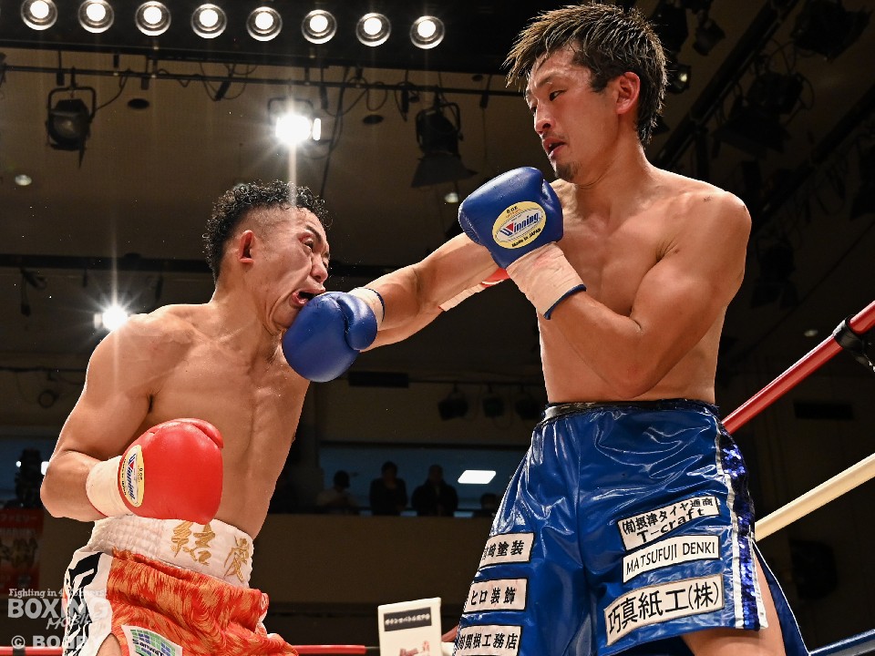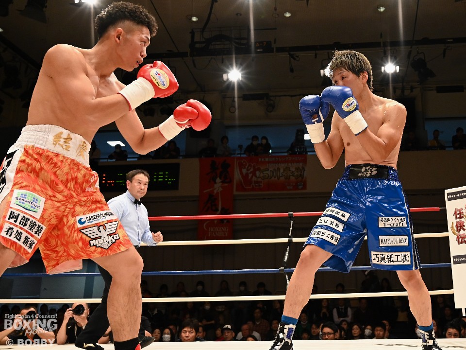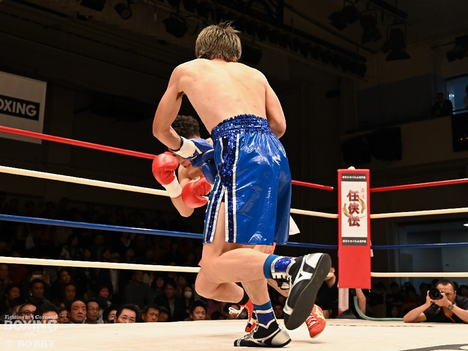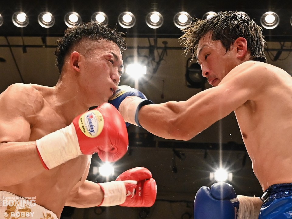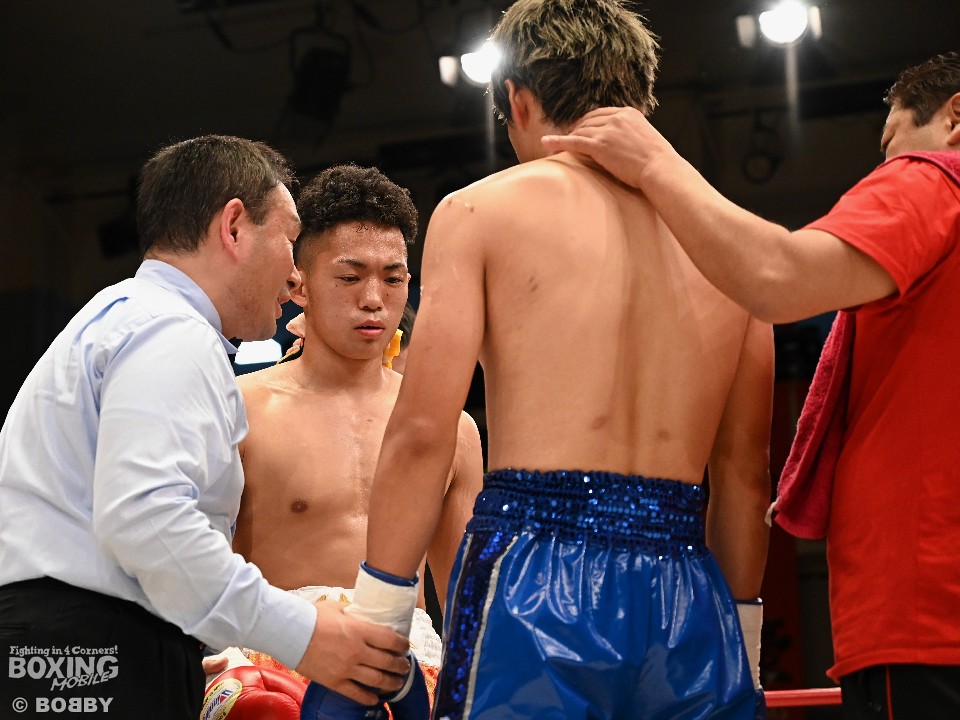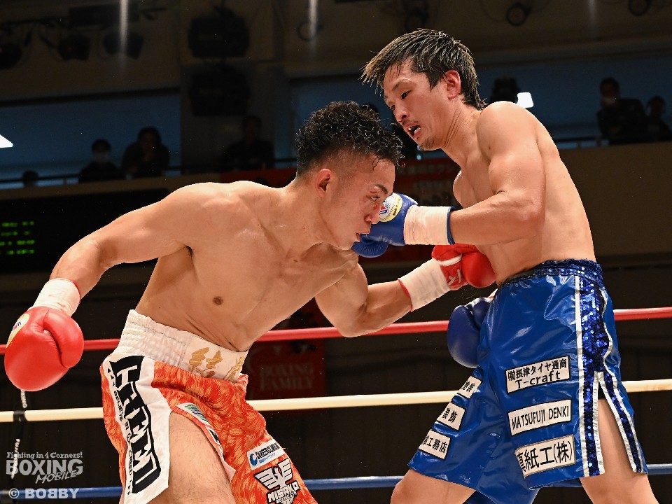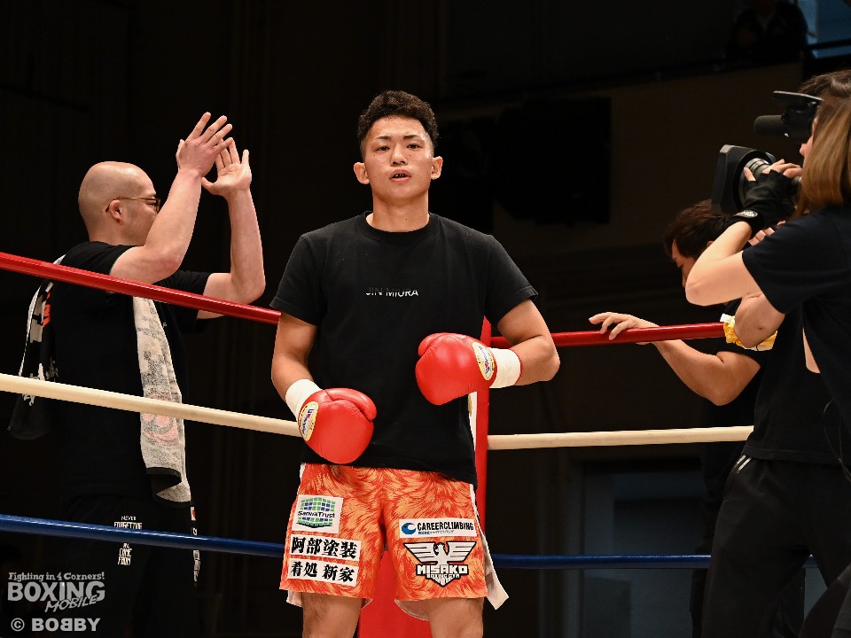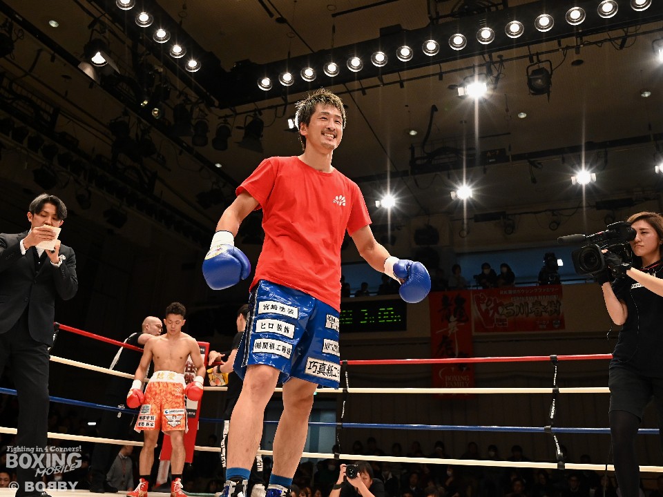 試合:スーパーバンタム級のランカー対決は立ち上がり、三浦がジャブの刺し合いで上回り、サウスポーの河村を後手にさせるが、初回終盤、前に出たところで左を合わされダウン。さらにパンチで右目上をカットした。三浦はダメージを感じさせず、2回もジャブから上下に打ち分けプッシュするが、河村も単発ながら左を効かせ応戦。続く3回は河村がペースを上げ、ワンツーで攻め込みチャンスを作るが、三浦も膝を揺らしながら左フック、右ストレートを効かせ、一進一退の展開となった。4回も激しい打ち合いでスタートし、鋭く踏み込んでは左フック、右クロスを繰り出す三浦に対し、河村は入り際に左ストレートを合わせ続けた。ともに有効打を奪い合うなか、6回に入ると三浦のパンチが上回り始めるが、河村も寸でのところで左を返し、踏みとどまった。7回もロープを背負ったところで左右を返し食らいついた河村は、この回終盤にパンチをまとめ逆襲。押し切りたかったが、今度は三浦が粘りピンチを乗り切った。最終8回も死力を尽くして打ち合いゴング。三浦がジャッジ1者の支持を得るが、2者がドローとし、決着はつかなかった。