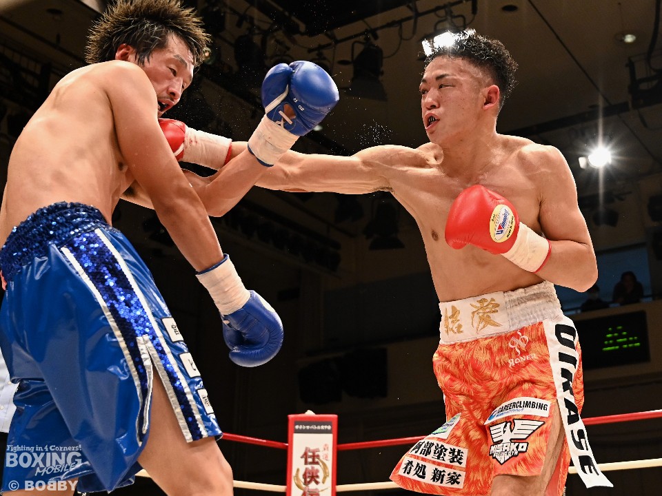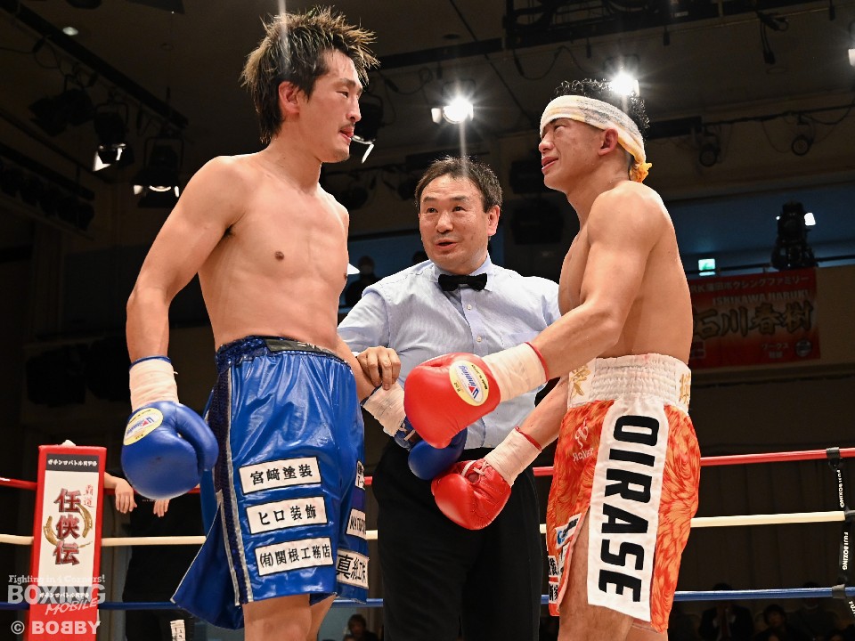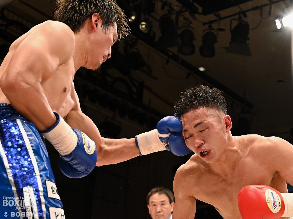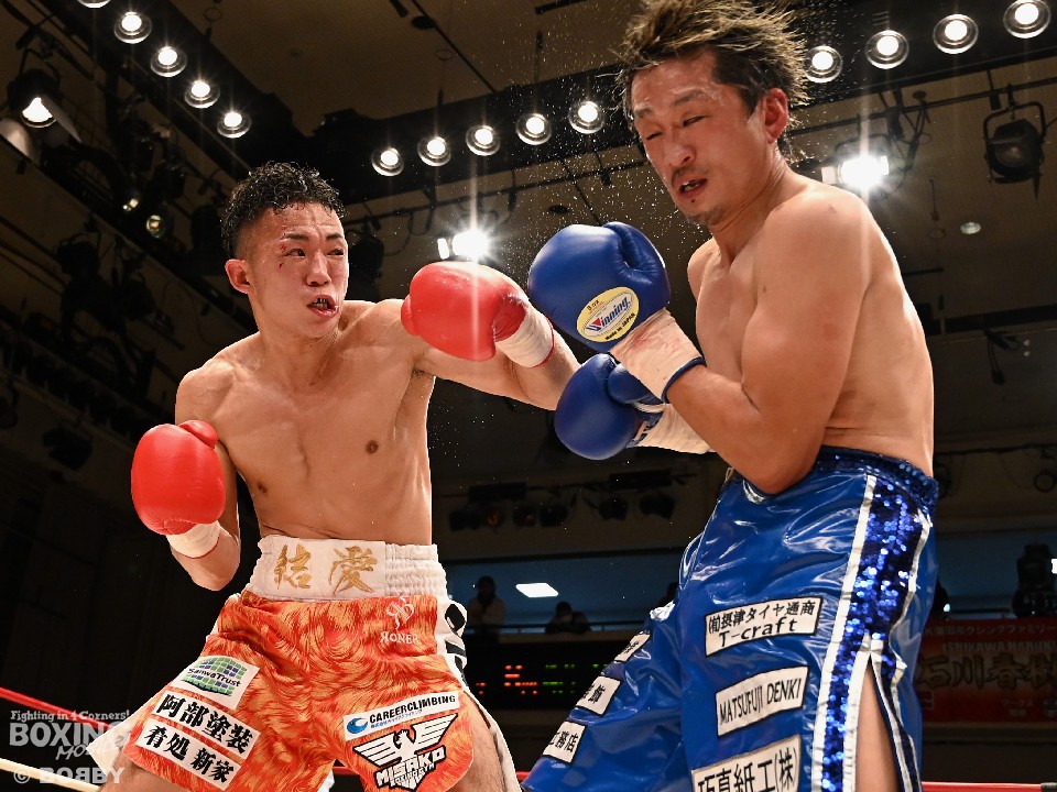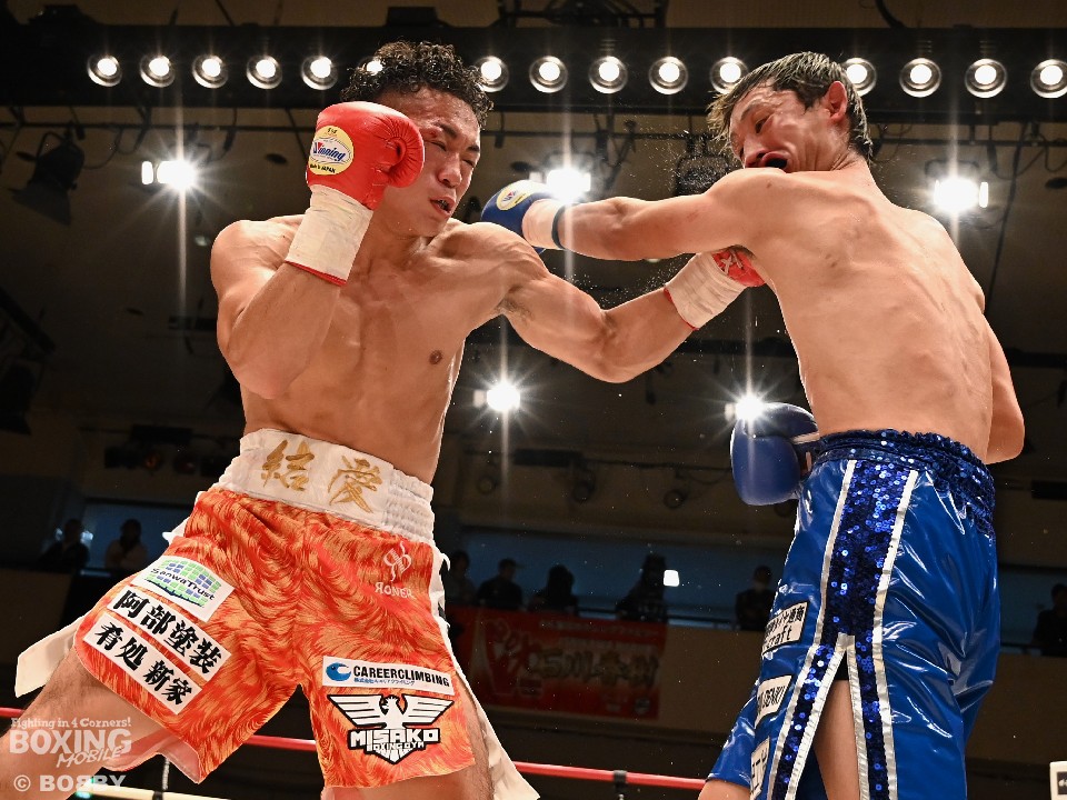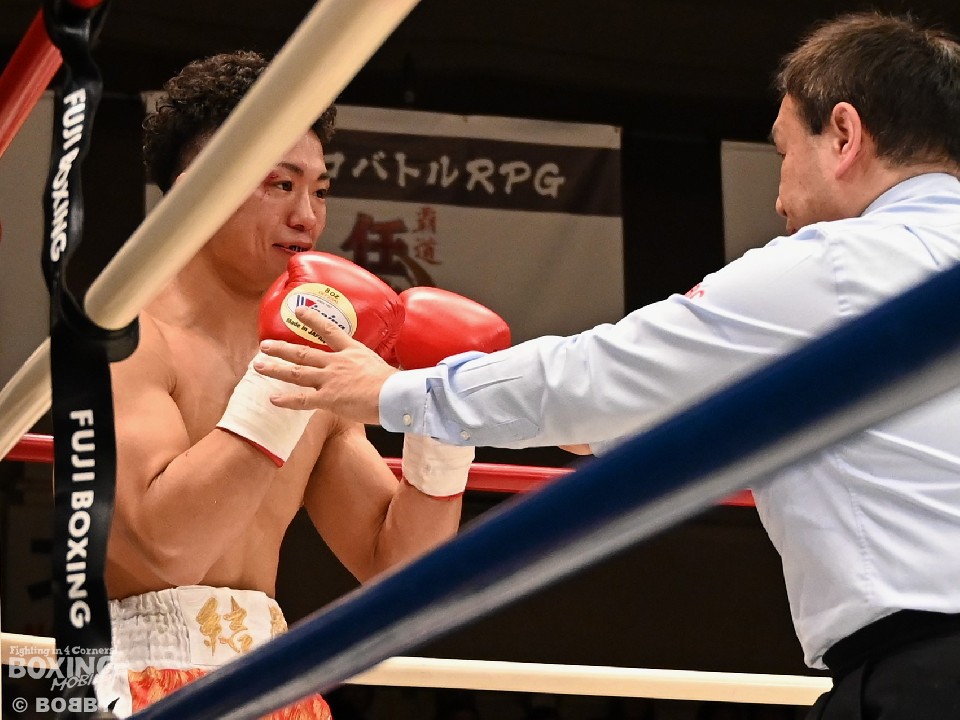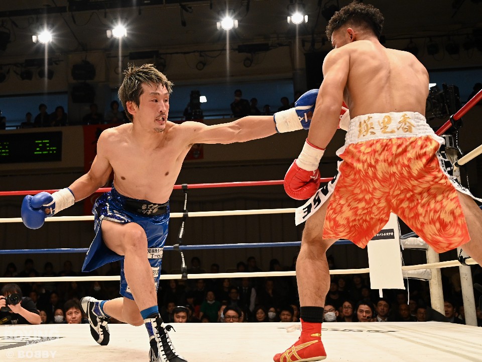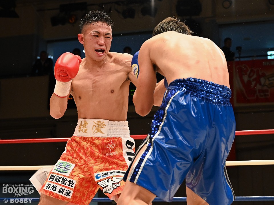 試合:スーパーバンタム級のランカー対決は立ち上がり、三浦がジャブの刺し合いで上回り、サウスポーの河村を後手にさせるが、初回終盤、前に出たところで左を合わされダウン。さらにパンチで右目上をカットした。三浦はダメージを感じさせず、2回もジャブから上下に打ち分けプッシュするが、河村も単発ながら左を効かせ応戦。続く3回は河村がペースを上げ、ワンツーで攻め込みチャンスを作るが、三浦も膝を揺らしながら左フック、右ストレートを効かせ、一進一退の展開となった。4回も激しい打ち合いでスタートし、鋭く踏み込んでは左フック、右クロスを繰り出す三浦に対し、河村は入り際に左ストレートを合わせ続けた。ともに有効打を奪い合うなか、6回に入ると三浦のパンチが上回り始めるが、河村も寸でのところで左を返し、踏みとどまった。7回もロープを背負ったところで左右を返し食らいついた河村は、この回終盤にパンチをまとめ逆襲。押し切りたかったが、今度は三浦が粘りピンチを乗り切った。最終8回も死力を尽くして打ち合いゴング。三浦がジャッジ1者の支持を得るが、2者がドローとし、決着はつかなかった。