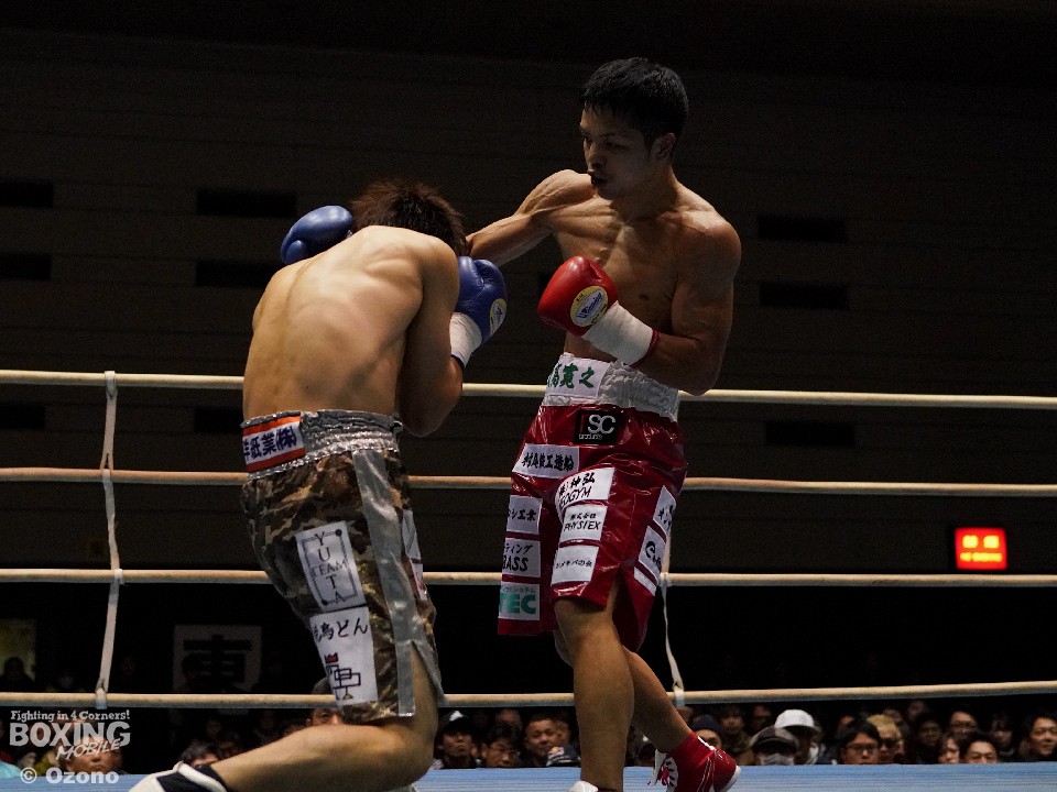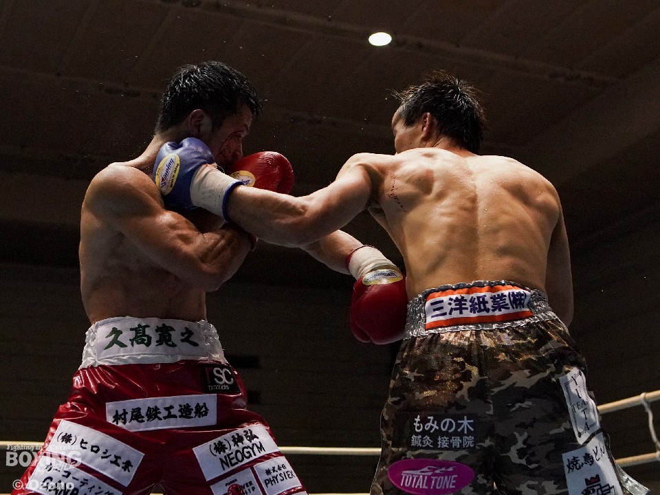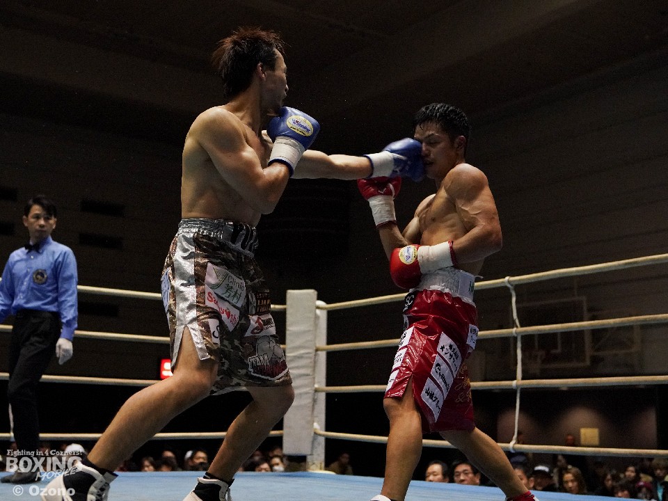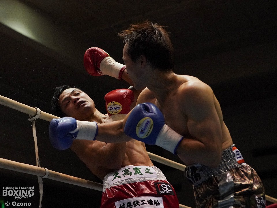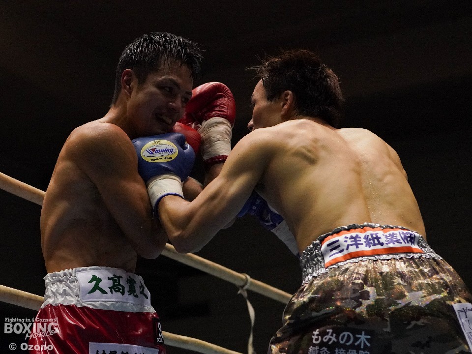 試合:まずは松尾がすぐに仕掛け、左ボディからフックで前に出るが、久高も右ボディストレートを伸ばし、序盤はボディの打ち合いとなった。パンチの精度に欠けた松尾は、後半に入るとさらにペースを上げ距離を潰しボディ、打ちおろしの右を打ち込むが、久高はL字ガードでいなすと左ボディで対抗。6回には右のショートをカウンターで決め、松尾にたたらを踏ませた。さらに連打をまとめた久高は、続く7回にも右ストレートを好打するが、松尾も左ボディから右フックを返し譲らず。最終8回も激しく打ち合ったが、どちらも決定打は生まれず判定は1-1のドロー。優勢点を取った松尾が勝者扱いとなり、来年の日本王座挑戦権を得た。