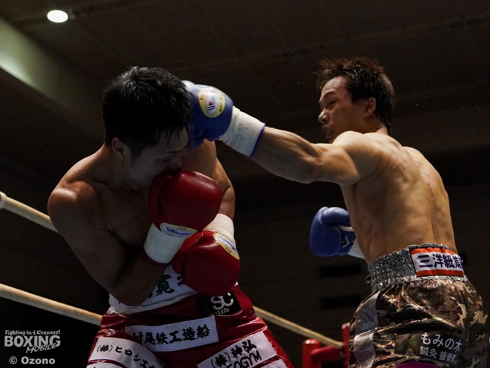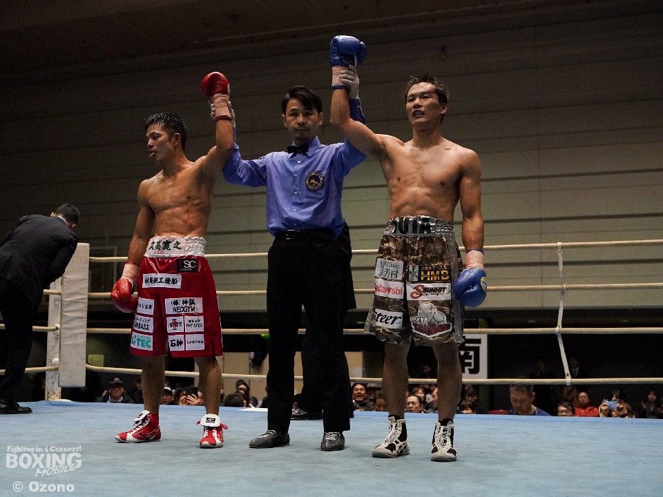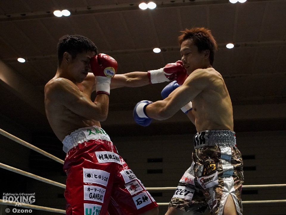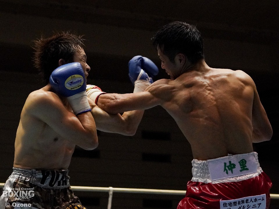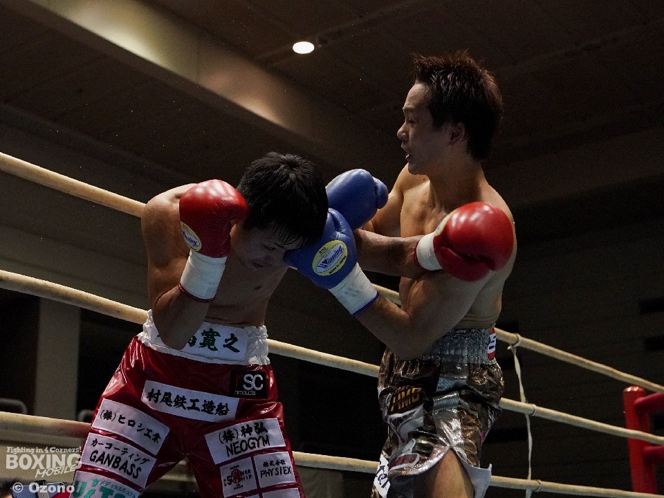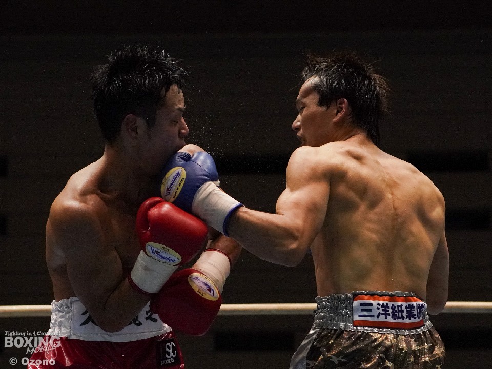 試合:まずは松尾がすぐに仕掛け、左ボディからフックで前に出るが、久高も右ボディストレートを伸ばし、序盤はボディの打ち合いとなった。パンチの精度に欠けた松尾は、後半に入るとさらにペースを上げ距離を潰しボディ、打ちおろしの右を打ち込むが、久高はL字ガードでいなすと左ボディで対抗。6回には右のショートをカウンターで決め、松尾にたたらを踏ませた。さらに連打をまとめた久高は、続く7回にも右ストレートを好打するが、松尾も左ボディから右フックを返し譲らず。最終8回も激しく打ち合ったが、どちらも決定打は生まれず判定は1-1のドロー。優勢点を取った松尾が勝者扱いとなり、来年の日本王座挑戦権を得た。