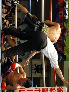 試合:最初にしかけたのは青木。上下を打ち分け前に出る。対する中嶋は頭からもぐりこむように前へ出ながら、空いているボディ、そのままフックまで回転早く打つ。ガードの上から相手が弾きとぶほどの馬力でワンツーを打ち抜く青木だが、内側からショートで打ち分ける中嶋に手こずる。重心低くボディ、そして右フックをかぶせていく中嶋は攻撃が単調になり、青木をコーナーに追い込むもたたみかけきれない。中盤、プレッシャーに下がり始めた中嶋を追い詰めアッパーを決めていく青木。さらに下がる中嶋だが、離れ際に放った右フックが青木をとらえる。ロープを背負って踏ん張るも、スピードと回転の中嶋の連打のえじきとなり、7Rノーカウントで終了。