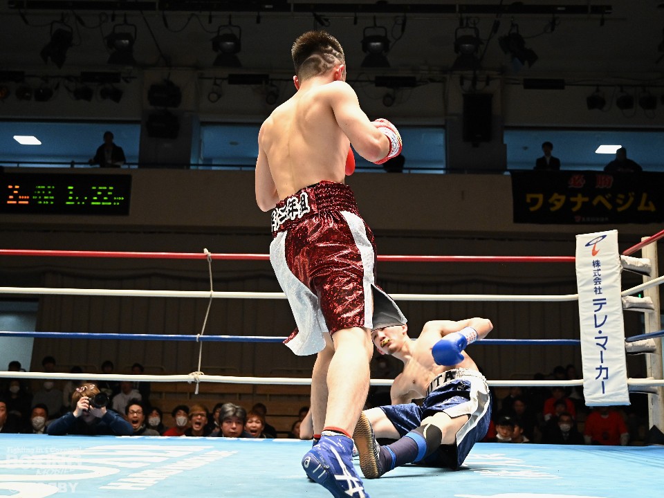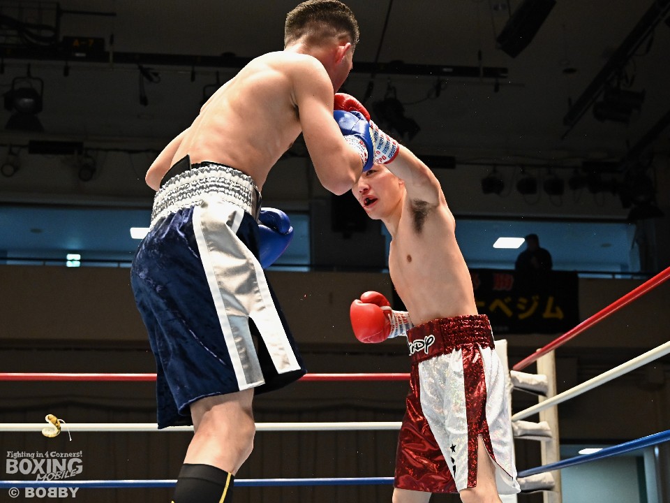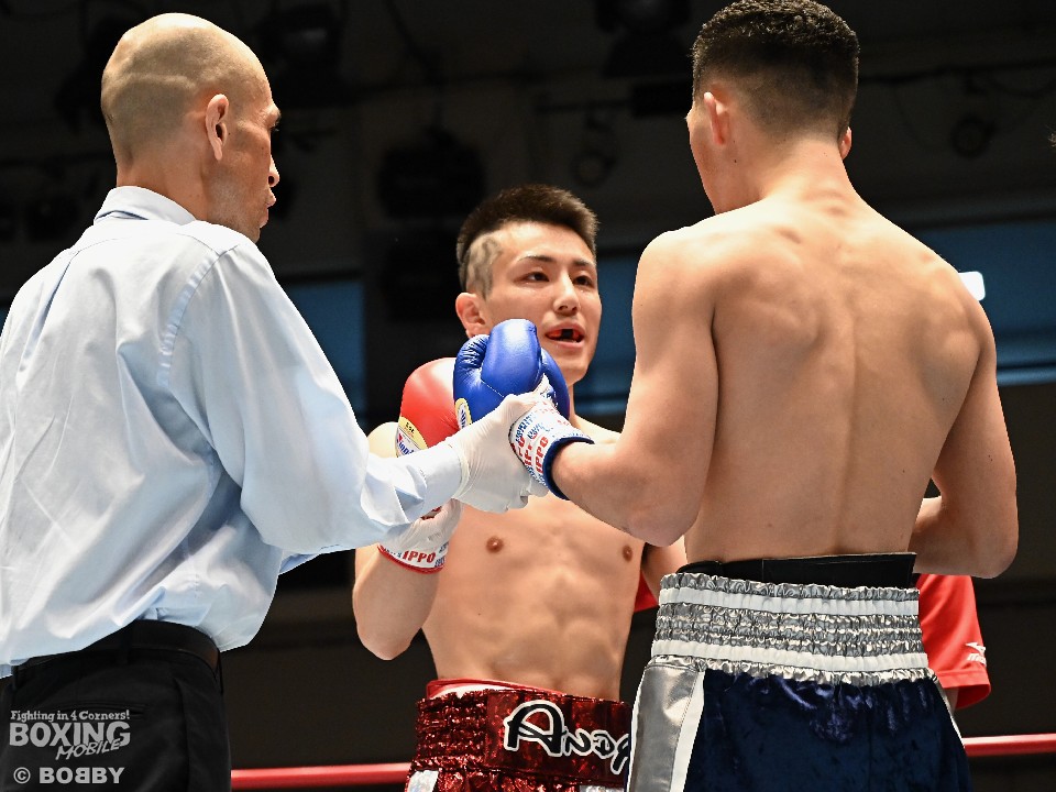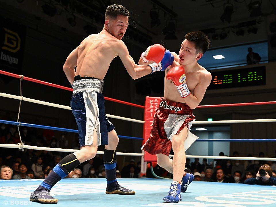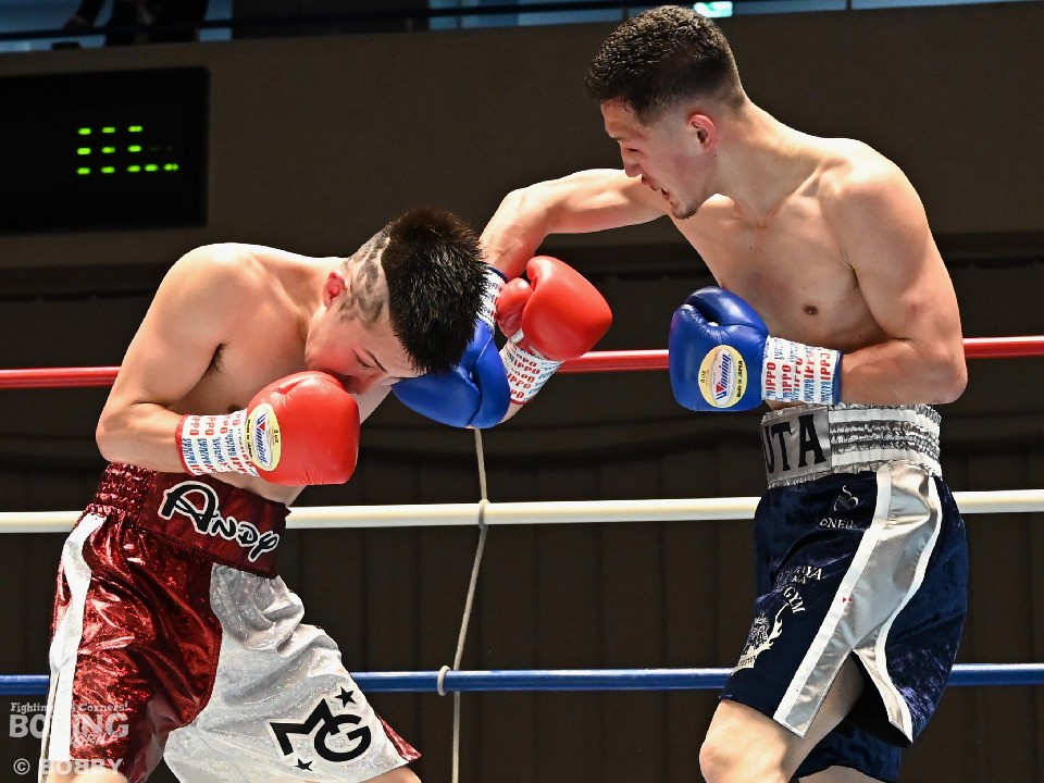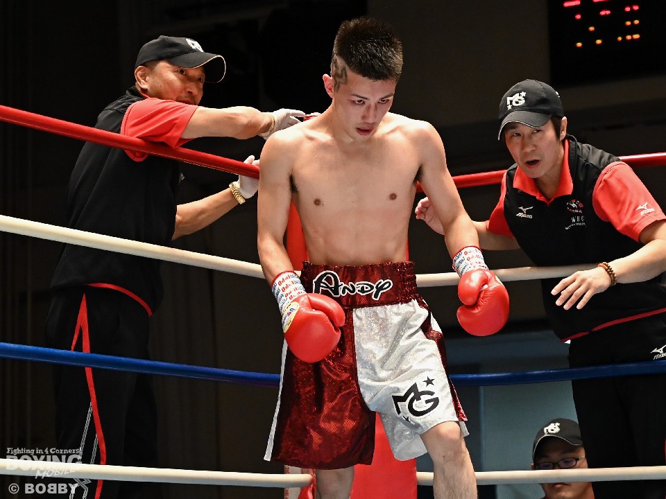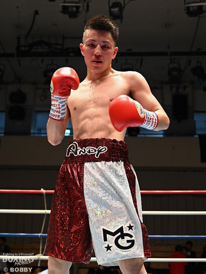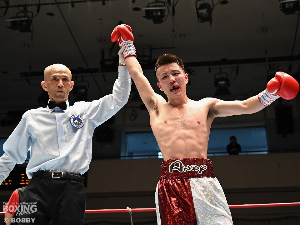 試合:デビュー戦の長谷川が左右に動きながら強弱をつけたパンチで幸先の良いスタートを切った。先手を取られたアンディは2回、プレスをかけてワンツーで仕掛けるが相手のジャブを浴びて突破口を開けず。しかし、諦めず前に出ると右のオーバーハンドが火を噴きダウンを奪った。ダメージが残っている長谷川に襲いかかるがここは仕留め切れなかった。3回、長谷川は足を使って回り込みダメージの回復に努めるとジャブからワンツーを好打。4回、アンディは左フックで膝を揺らし追い詰めたが、長谷川は左ボディで動きを止めると連打で攻勢。しかし、アンディも必死の形相で打ち返した。ジャッジに委ねられた採点は3者ともにアンディを支持。4戦目で初勝利を挙げたアンディは雄叫びをあげた。