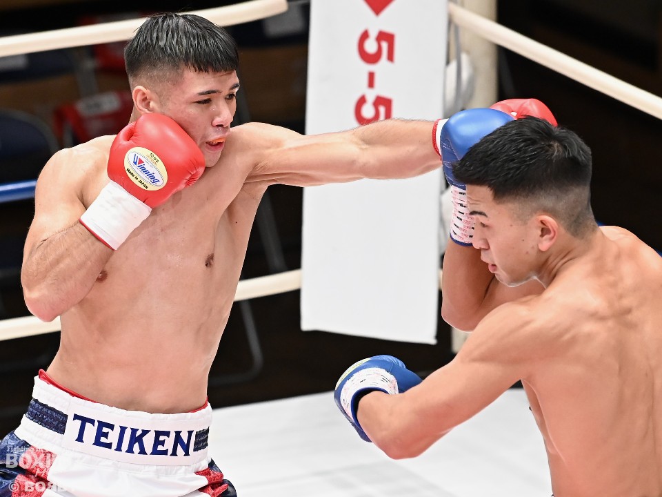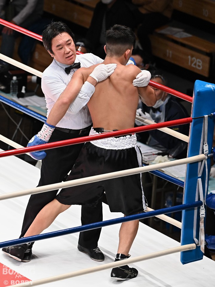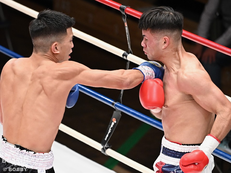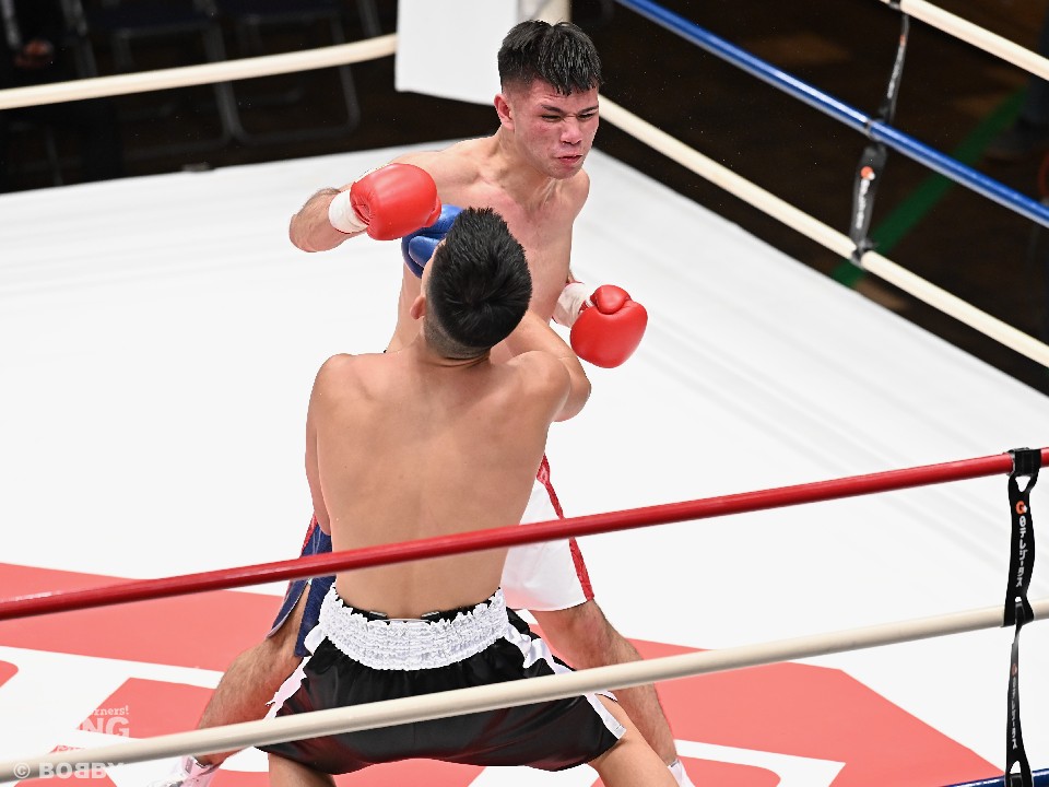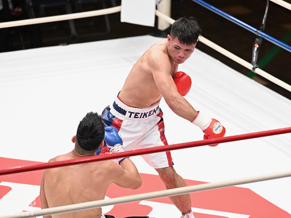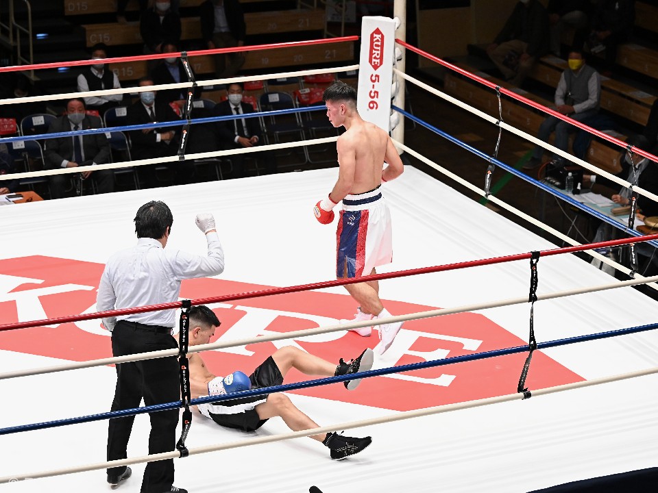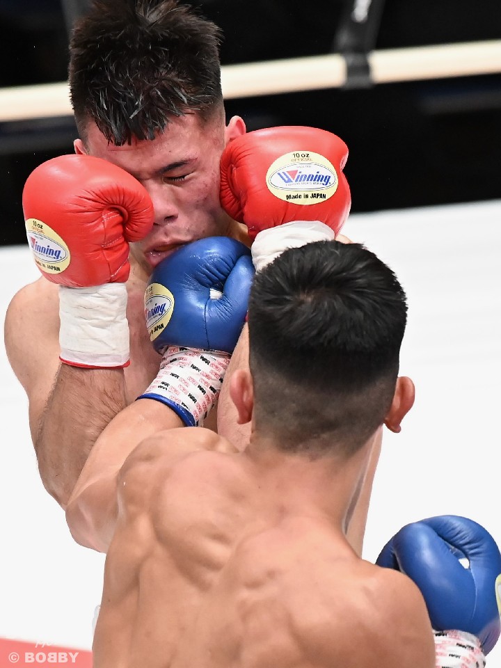 試合:昨年2月以来の再戦は、吉野がワンツー、右ボディで先制攻撃。対する伊藤は距離を取りながら右ストレートを上下に打ち分け応戦。2回、両者とも押し負けず一進一退の攻防を繰り広げていたが、ラウンド終了間際に相打ちとなるが吉野の左フックがジャストミート!痛烈なダウンを喫した伊藤は、なんとか立ち上がったが足元がフラつくと、レフェリーに止められた。リベンジを果たした吉野が3戦目でうれしい初勝利を挙げた。