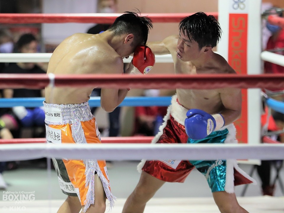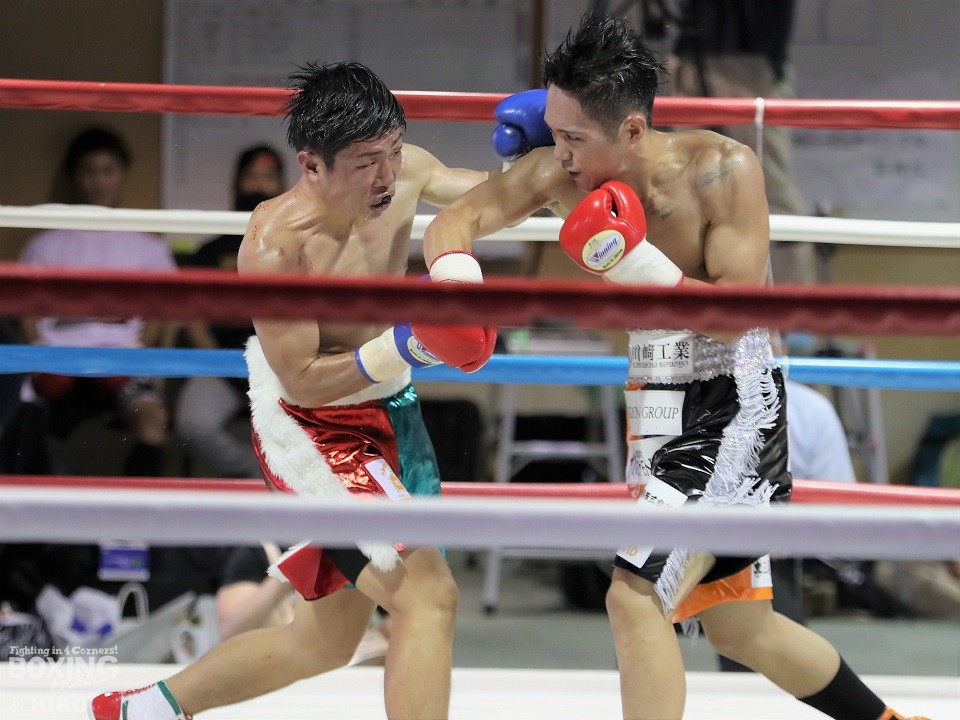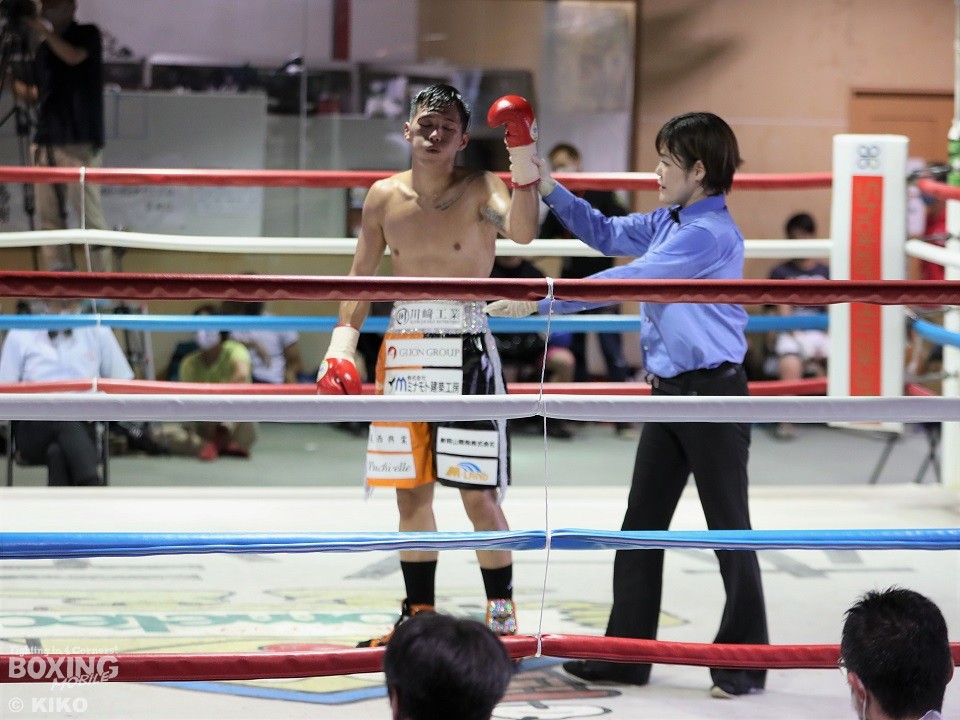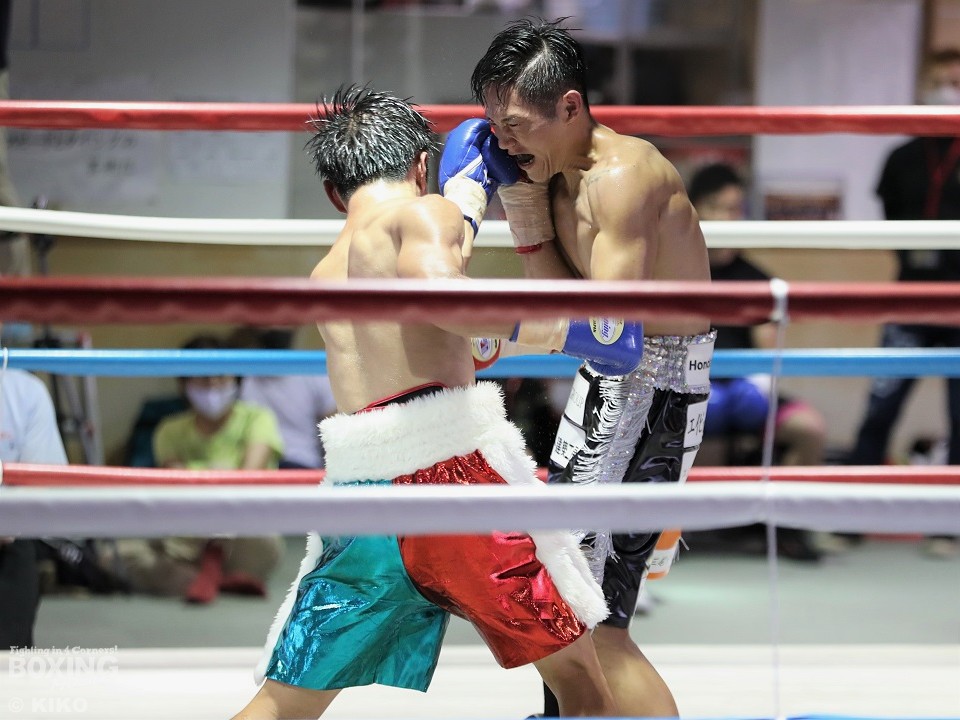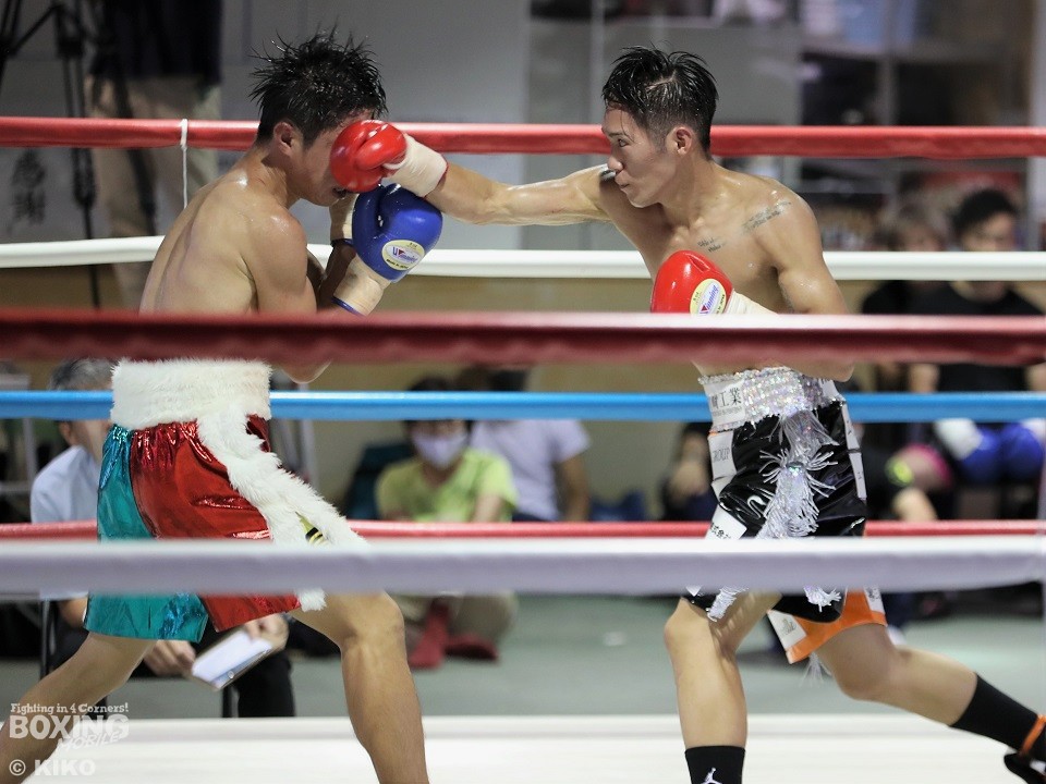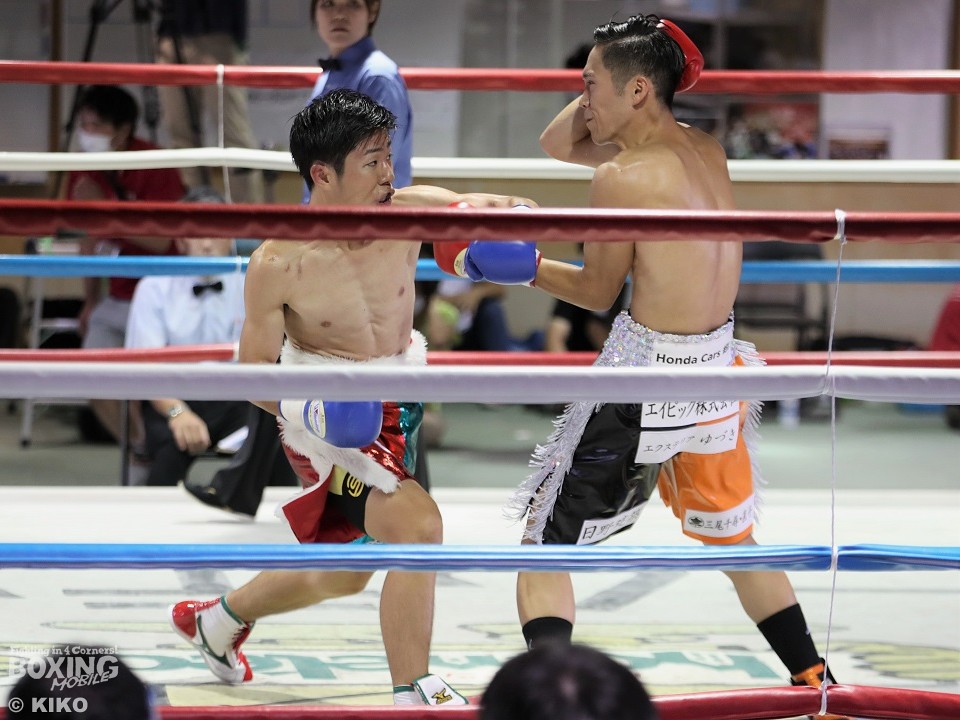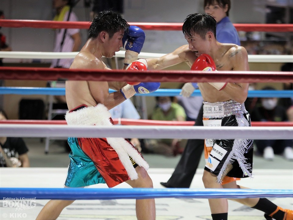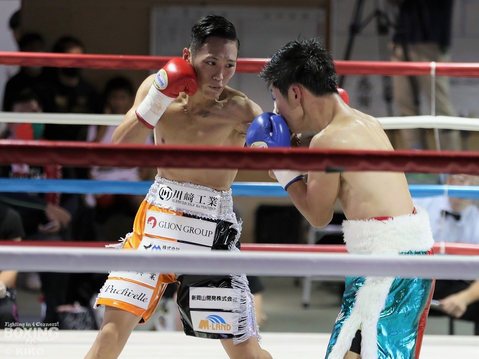 試合:サウスポー中逵が上体を振りながらプレスをかけていくのに対し、三尾は距離をキープしながら右ストレートをヒット。 中間距離で激しいペース争いを繰り広げた。2回、中逵は左ストレートをボディに決めるが、ペースを渡したくない三尾はワンツーで膝を揺らすと連打で攻勢。力みからパンチは空を切ったがボディにパンチを集めてダメージを与えた。インターバルで回復した中逵は3回、上下に打ち分けると右フックを痛打。このラウンド三尾は偶然のバッティングで右目尻をカットした。4回、中逵はサイドに回りながらワンツー、右ボディをヒット、最後の力を振り絞り有効打を決めた。ジャッジに委ねられた採点は三尾を支持し接戦を制した。
