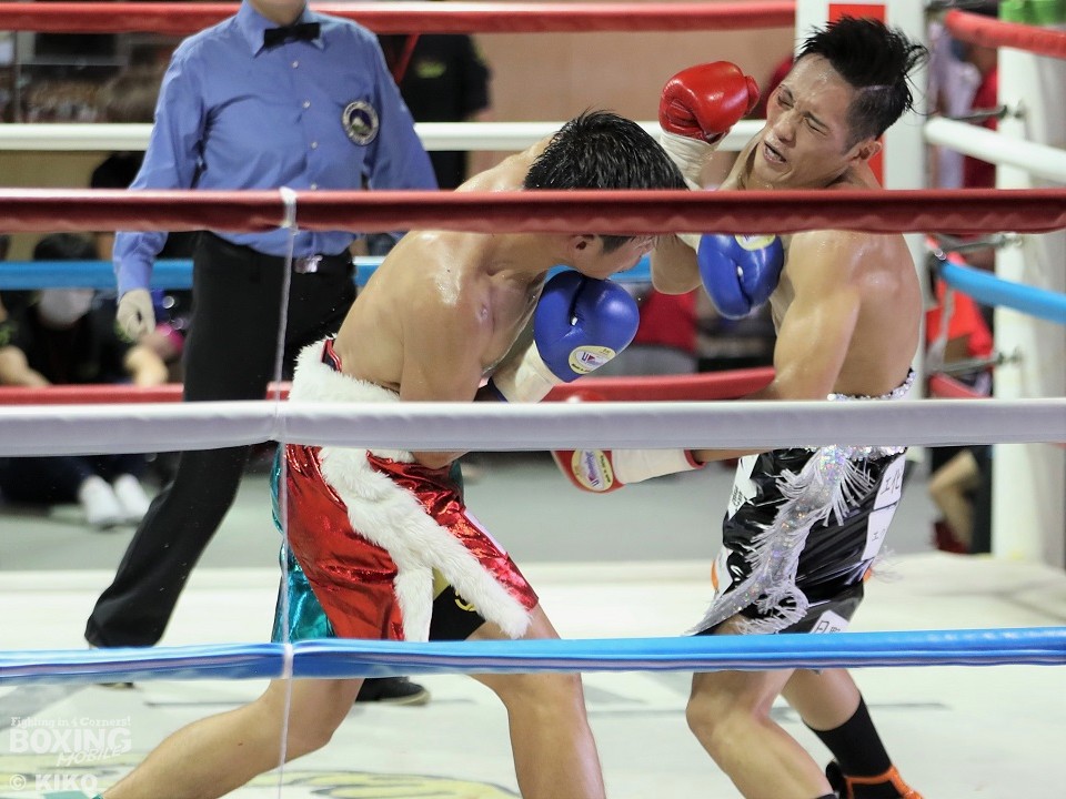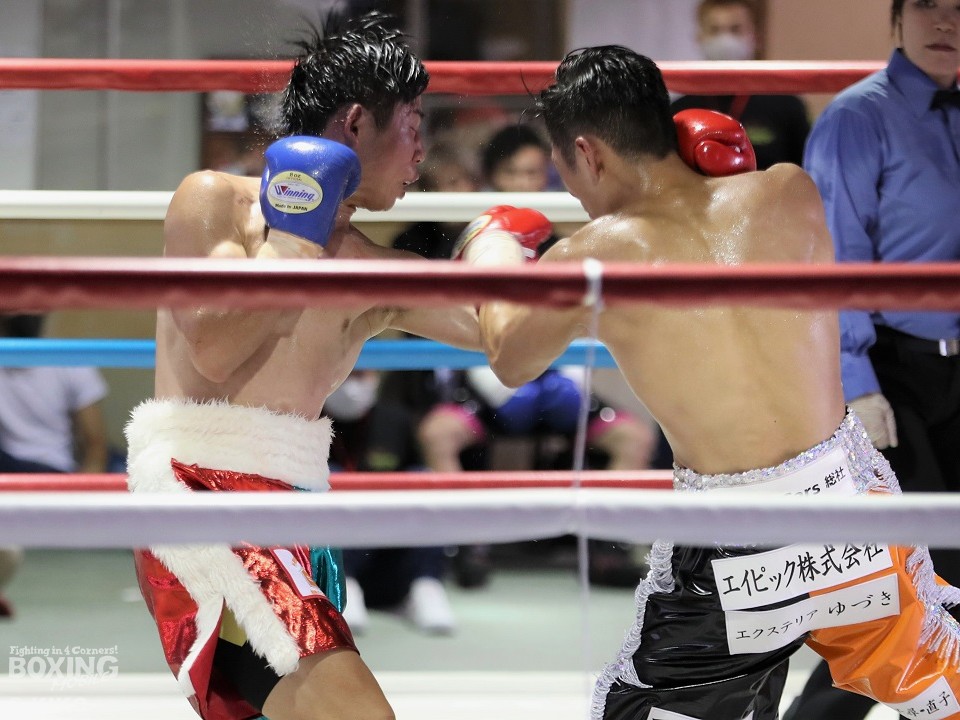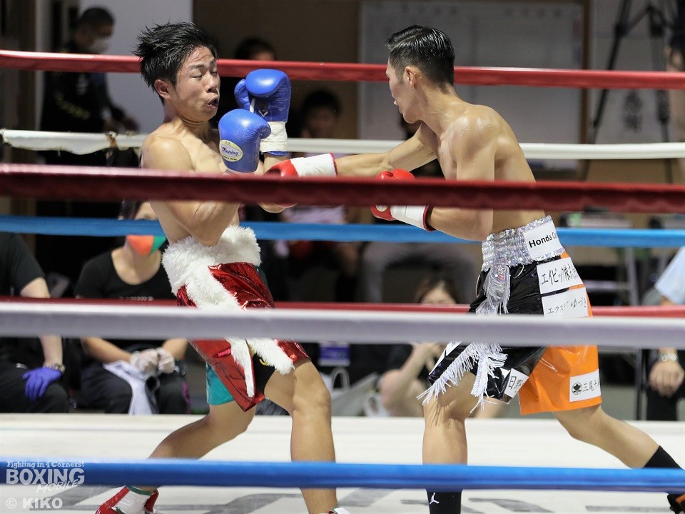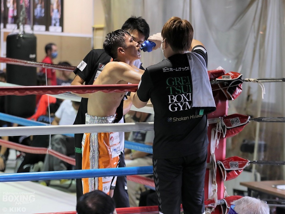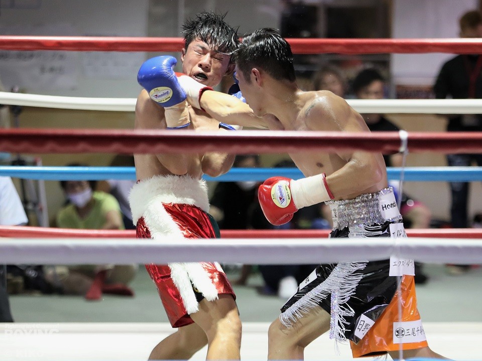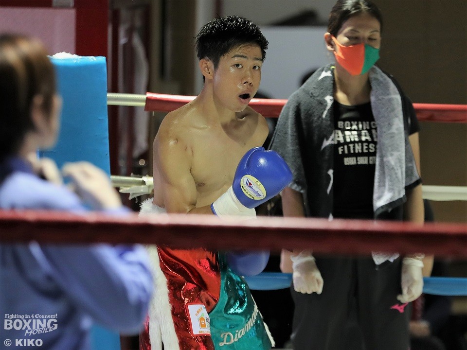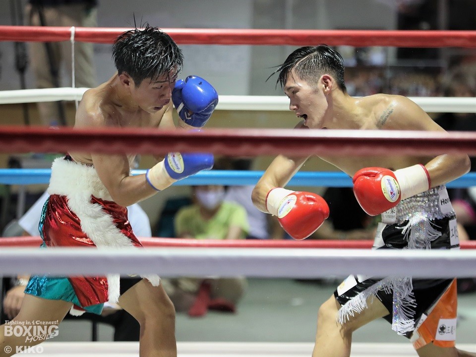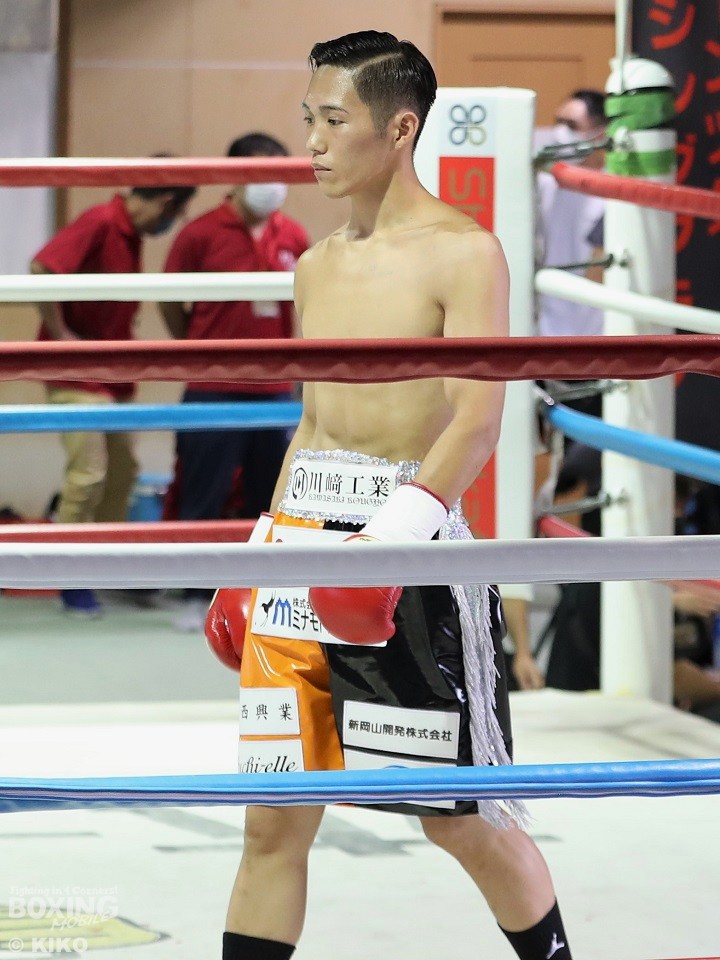 試合:サウスポー中逵が上体を振りながらプレスをかけていくのに対し、三尾は距離をキープしながら右ストレートをヒット。 中間距離で激しいペース争いを繰り広げた。2回、中逵は左ストレートをボディに決めるが、ペースを渡したくない三尾はワンツーで膝を揺らすと連打で攻勢。力みからパンチは空を切ったがボディにパンチを集めてダメージを与えた。インターバルで回復した中逵は3回、上下に打ち分けると右フックを痛打。このラウンド三尾は偶然のバッティングで右目尻をカットした。4回、中逵はサイドに回りながらワンツー、右ボディをヒット、最後の力を振り絞り有効打を決めた。ジャッジに委ねられた採点は三尾を支持し接戦を制した。