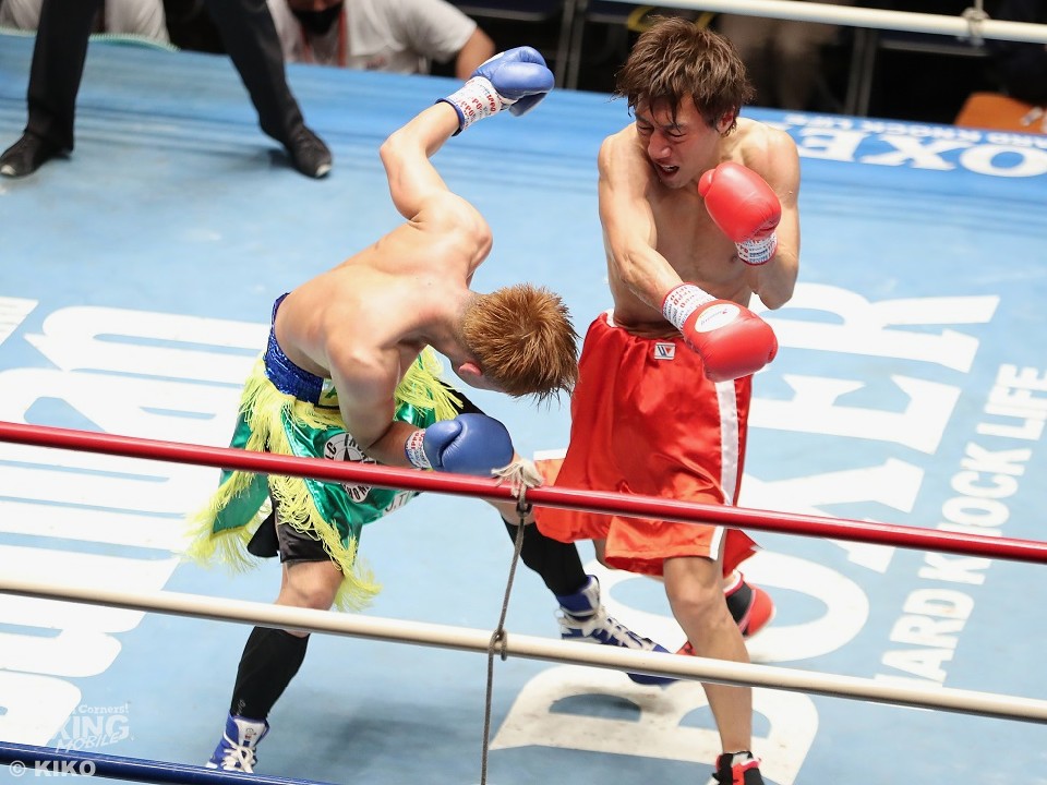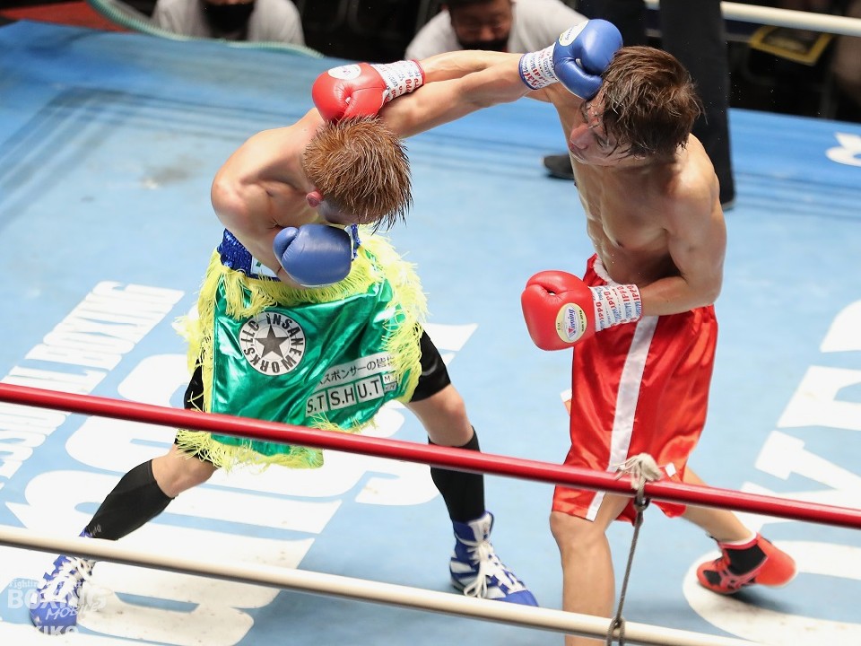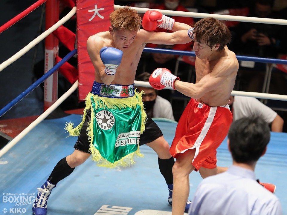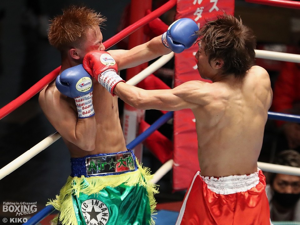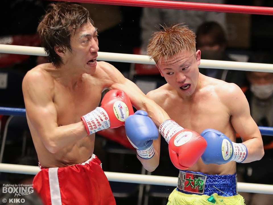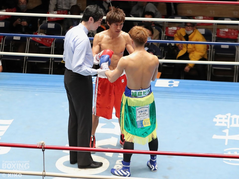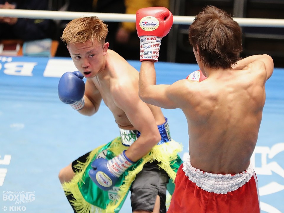 試合:デビュー戦の大内が、フェイントを入れながらワンツーを繰り出し軽快な動きを披露。これが約7年7ヶ月ぶりのリングの正地は、動きに硬さがみられるもののワンツーを返し応戦した。2回、正地は右フックで膝を揺らしたが、大内はフットワークを駆使して被弾を回避。3回、打撃戦に持ち込んだ正地は手数で上回ると4回も歯を食いしばりながらパンチを打ち込み勝利を手繰り寄せた。