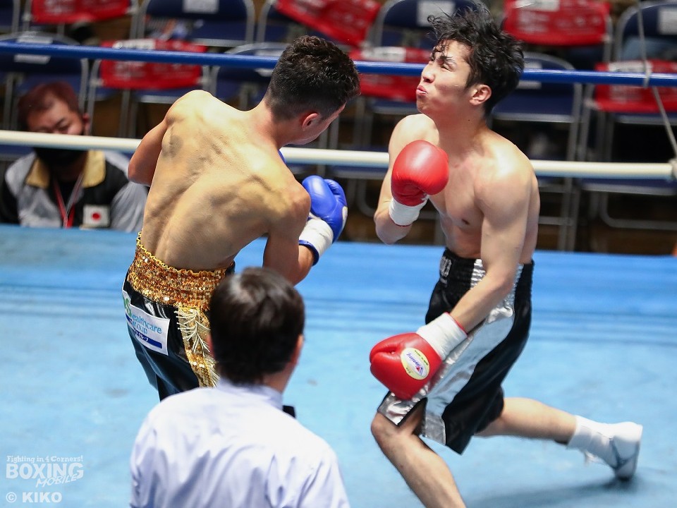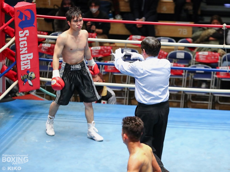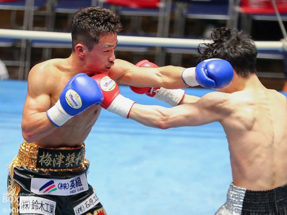 試合:両者ともキレのある動きを見せると中間距離で激しいパンチの交換。長尾が左ボディを決めれば梅津もプレスをかけてワンツーを好打した。2回、梅津の右ショートアッパーが炸裂しダウンを先取。立ち上がった長尾に襲い掛かると右カウンターでキャンバスに沈めた。